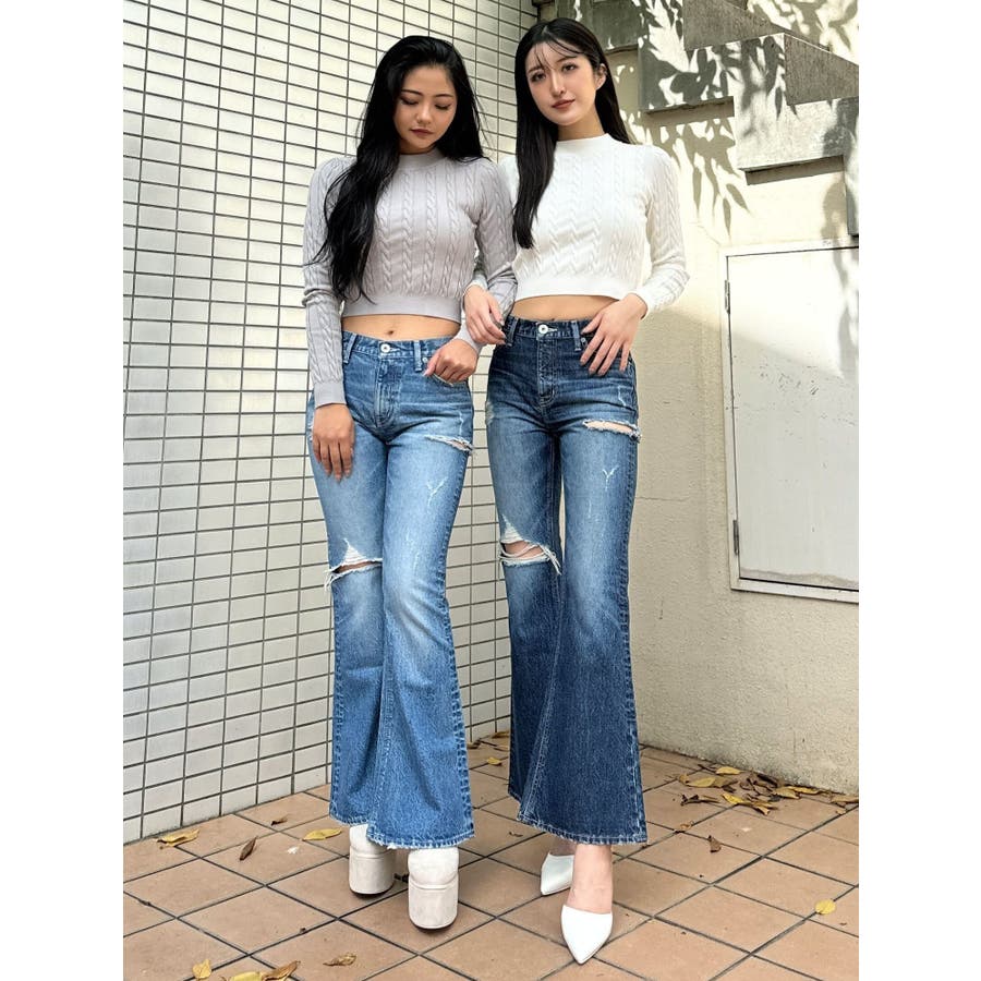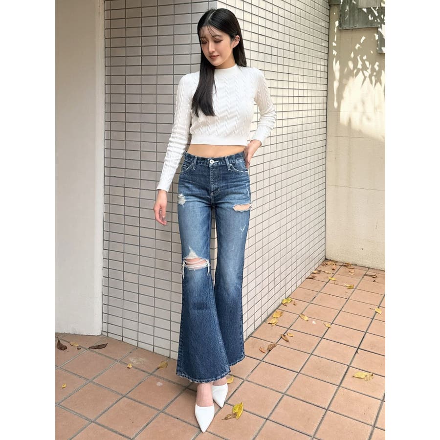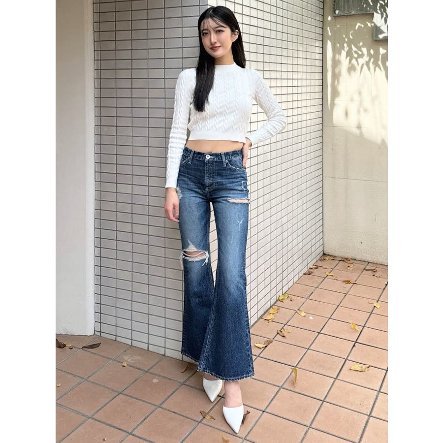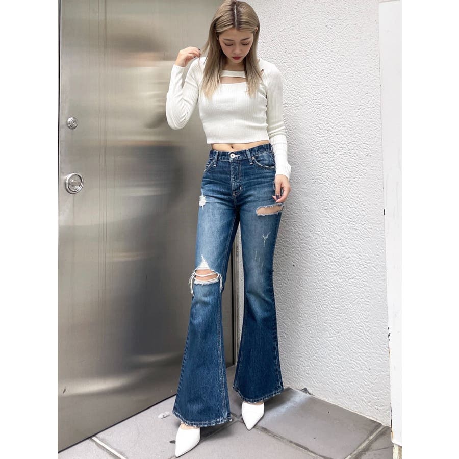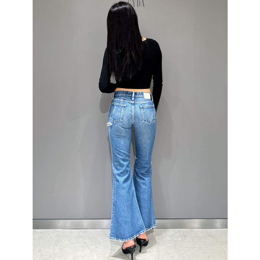 ミドルウエストSIDE RIPPEDフレアデニムパンツ