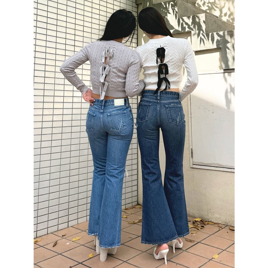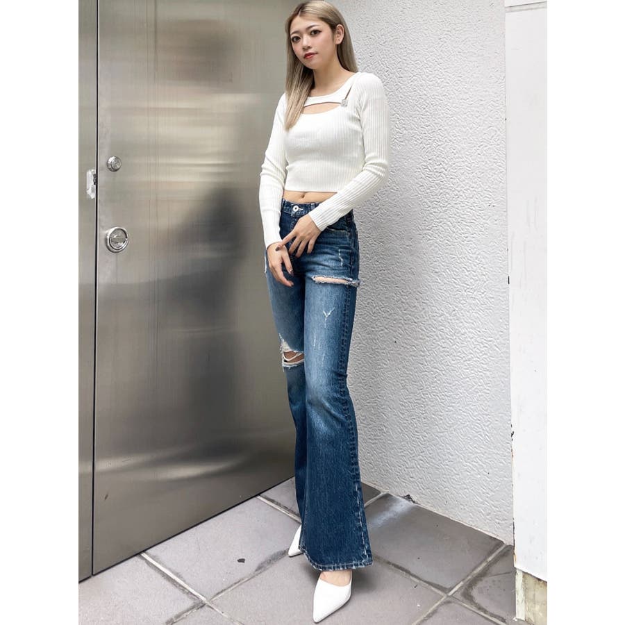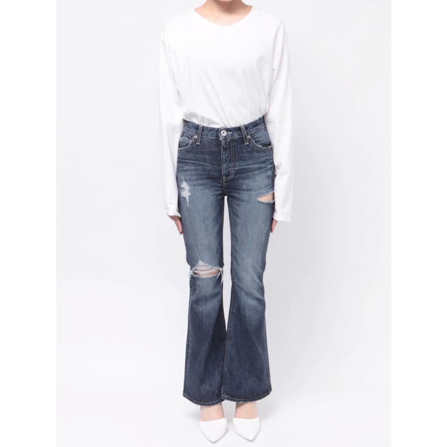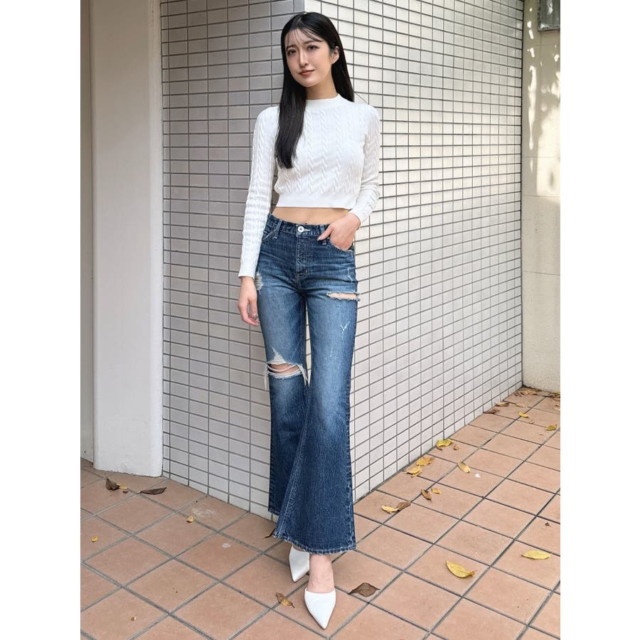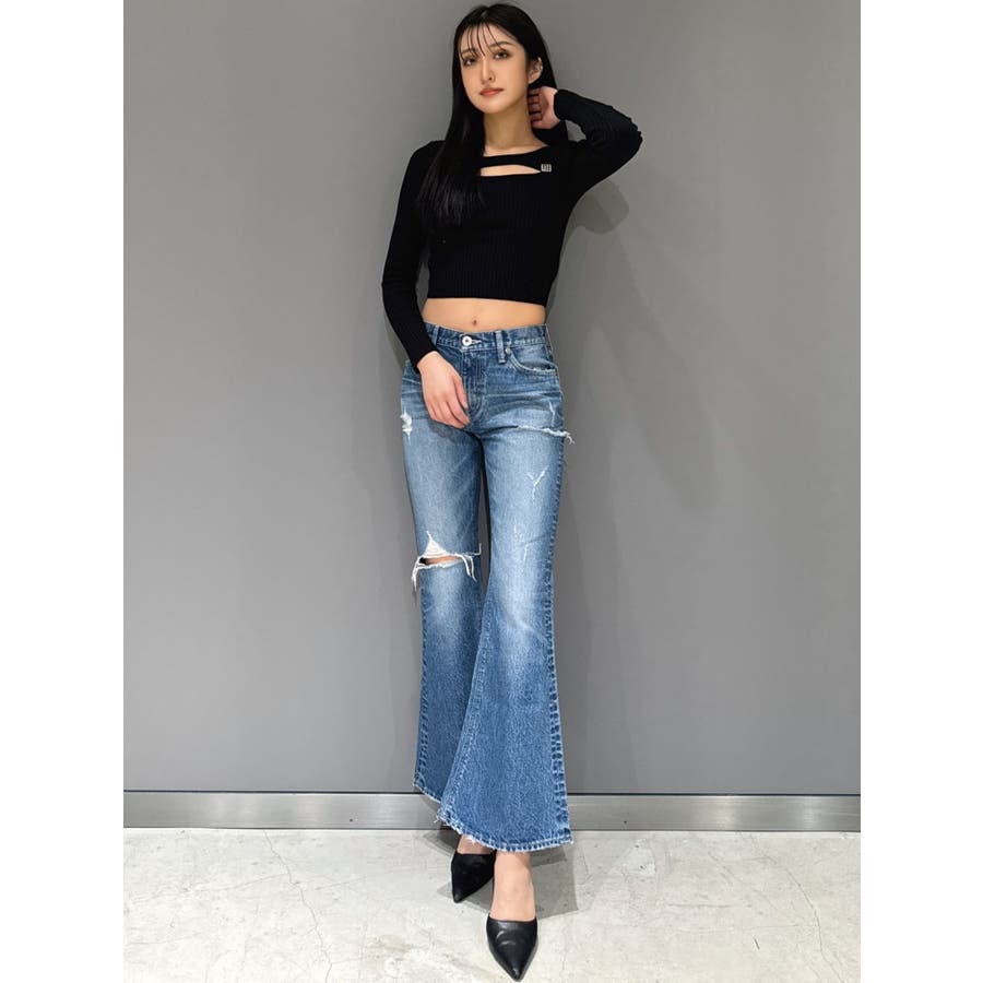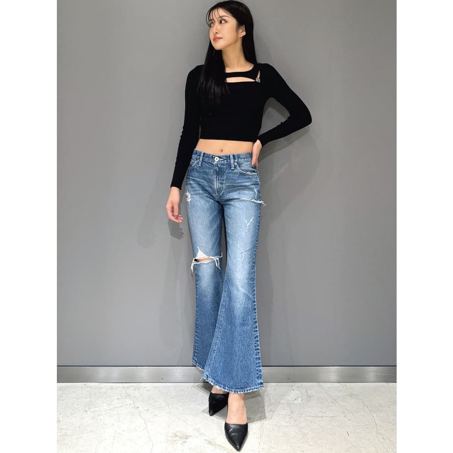 ミドルウエストSIDE RIPPEDフレアデニムパンツ