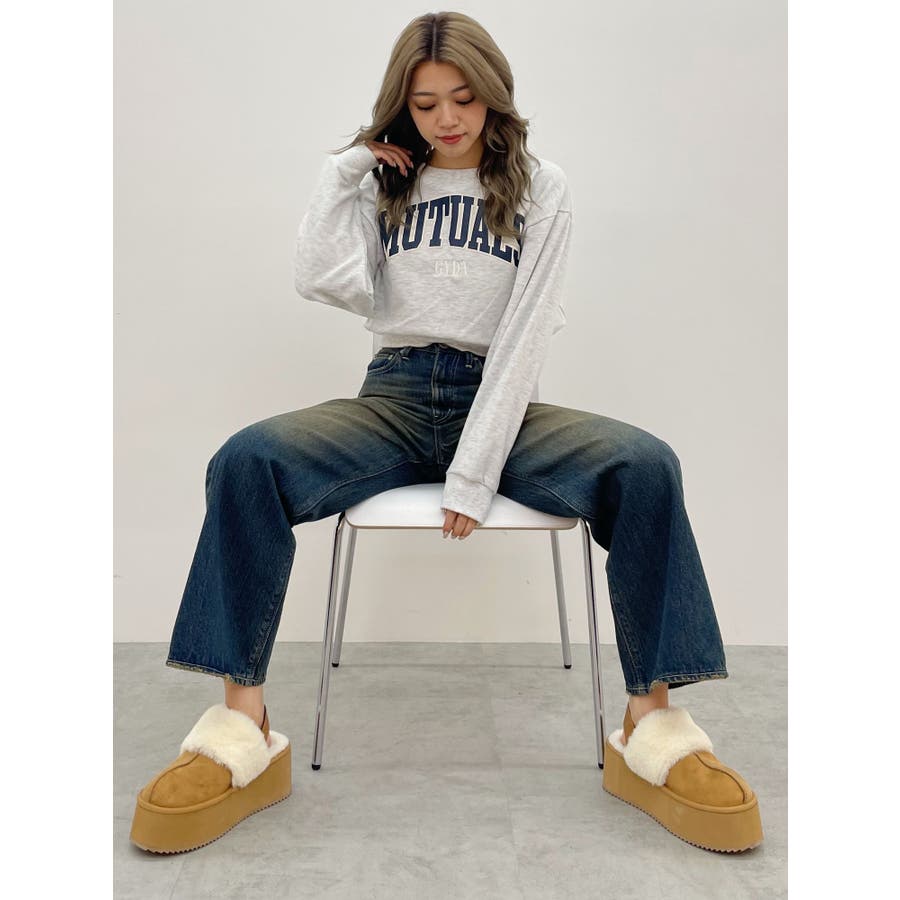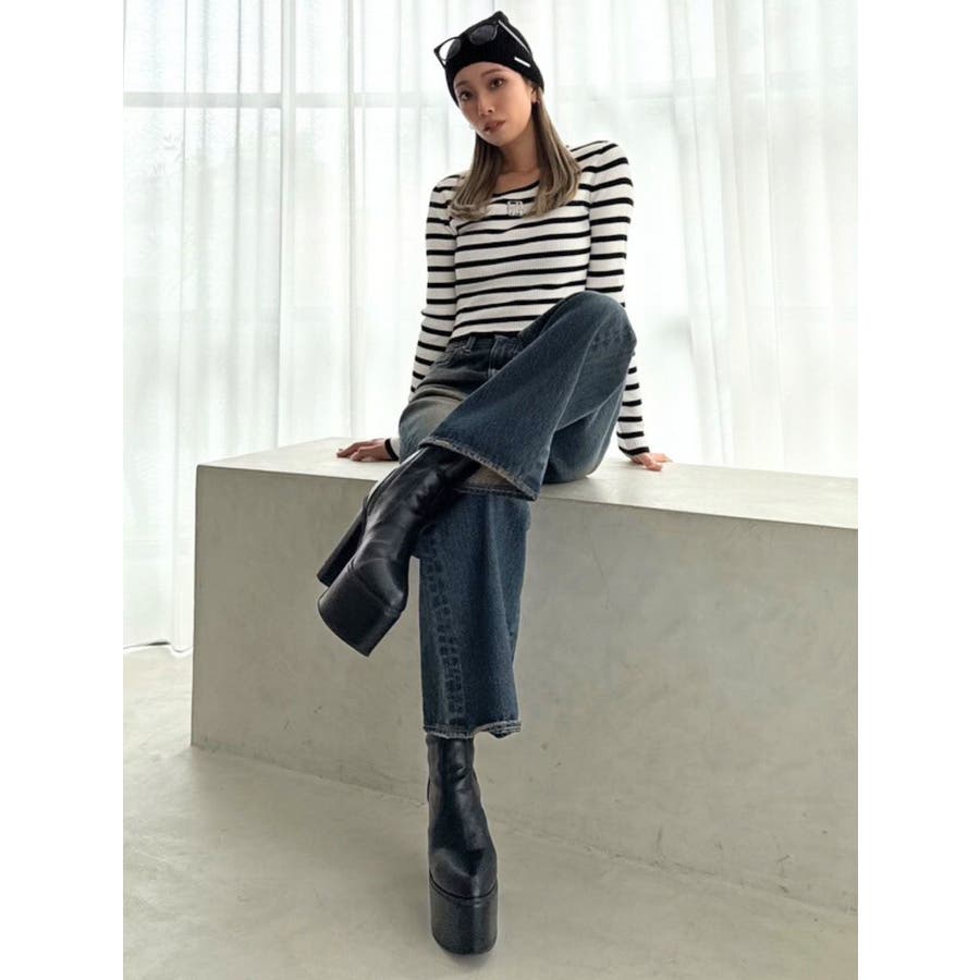 ショート丈トップスと厚底スニーカー合わせでスタイル良く見えます。