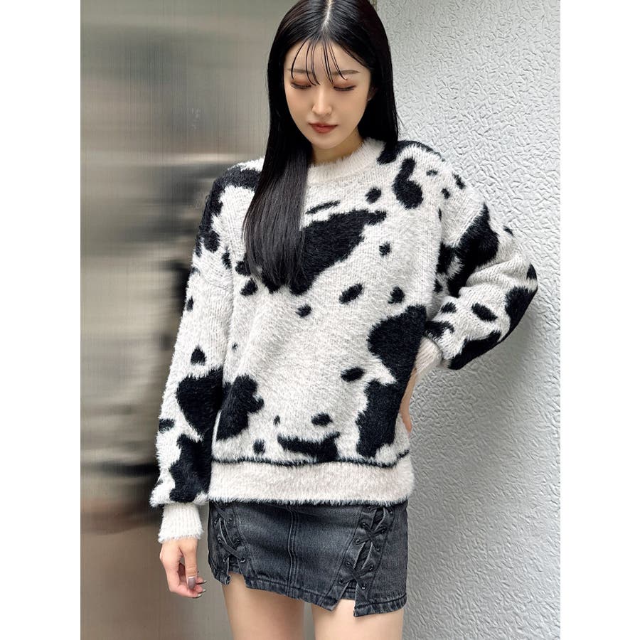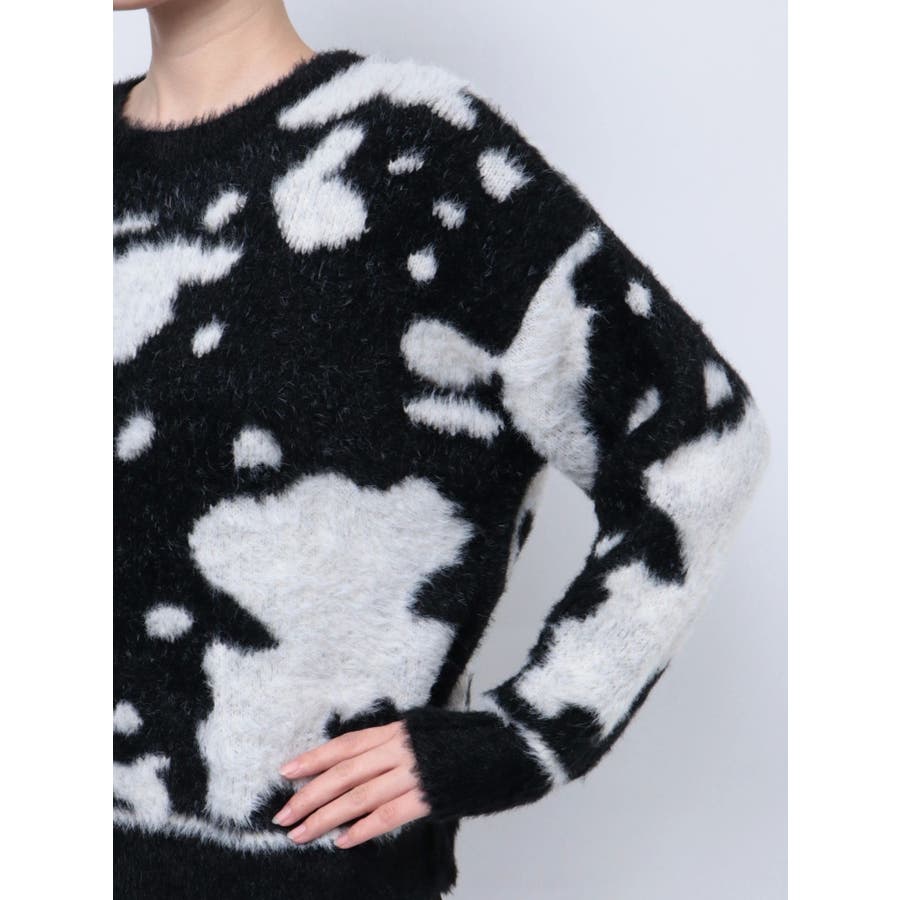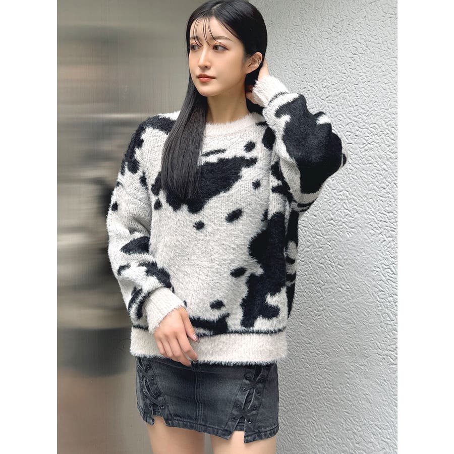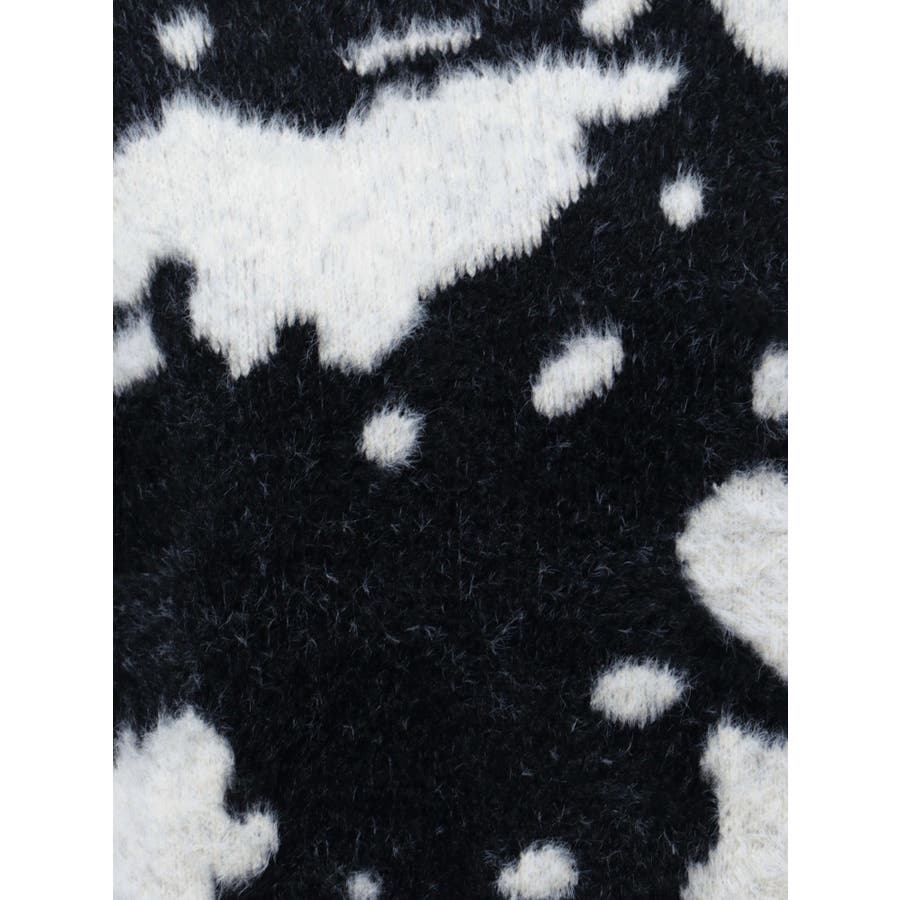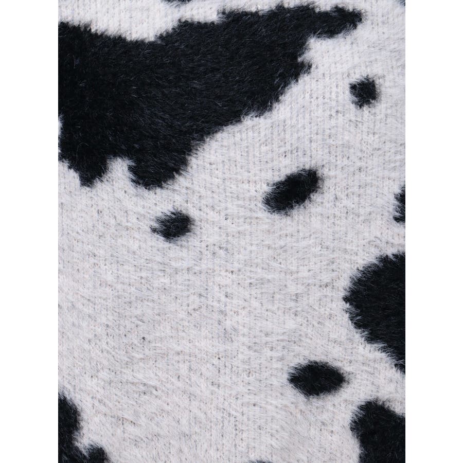 ふんわりとした肌触りが心地よい、カウスポット柄のニットトップス。