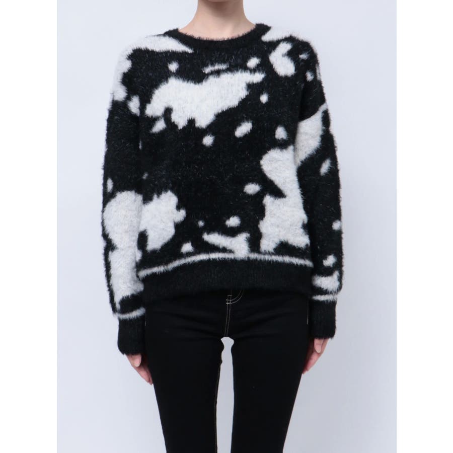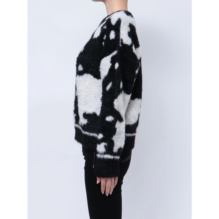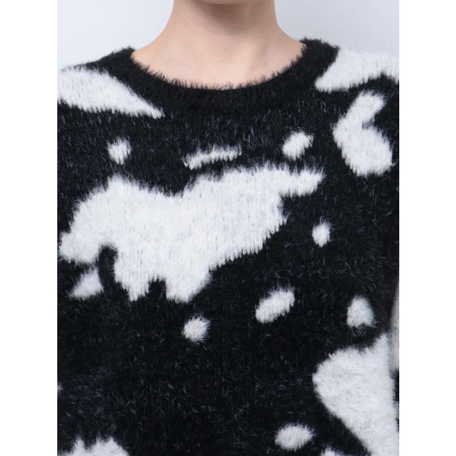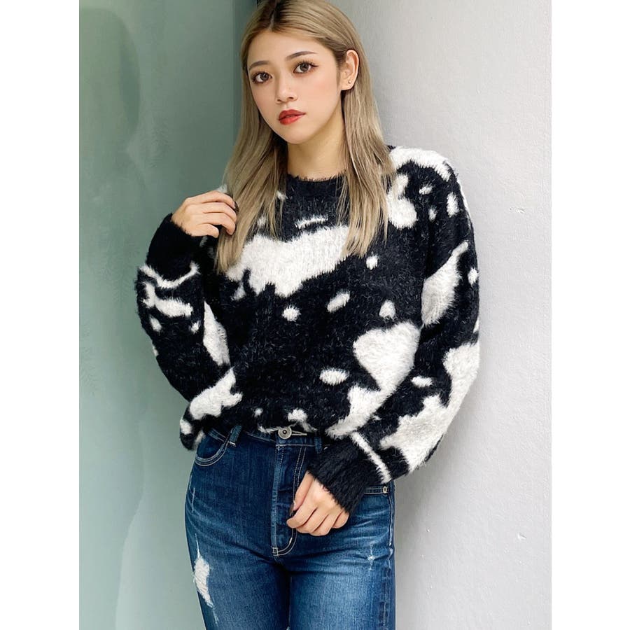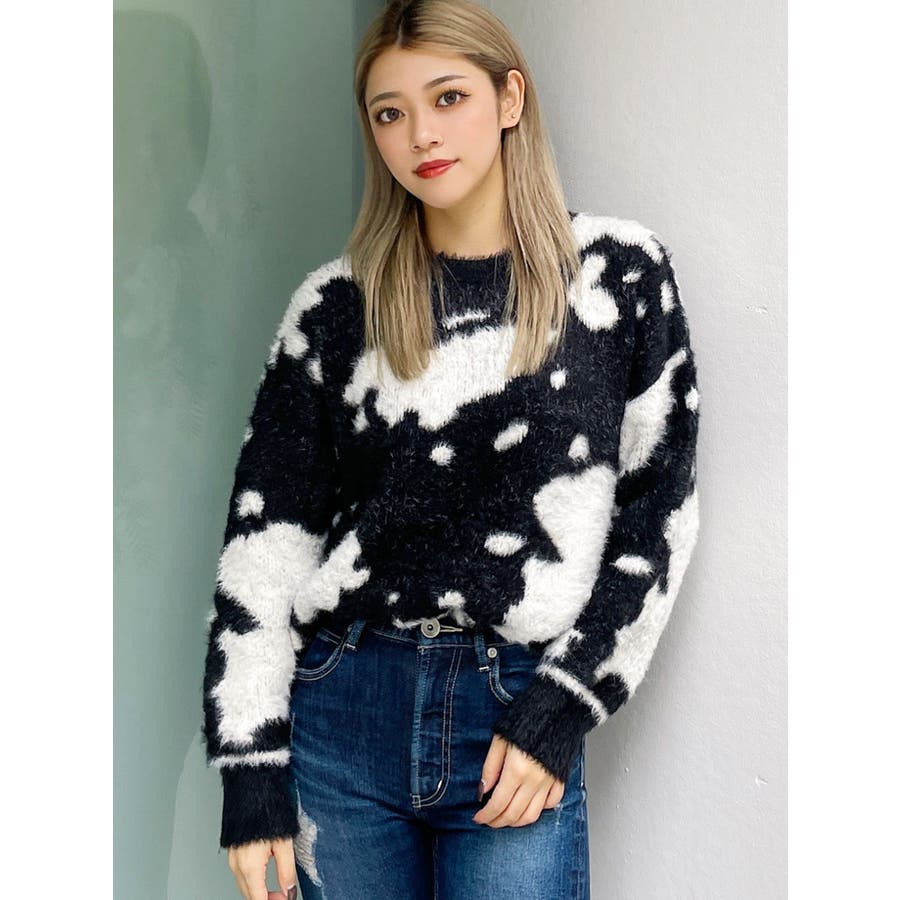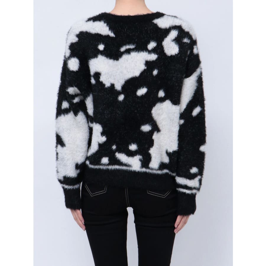 ふんわりとした肌触りが心地よい、カウスポット柄のニットトップス。