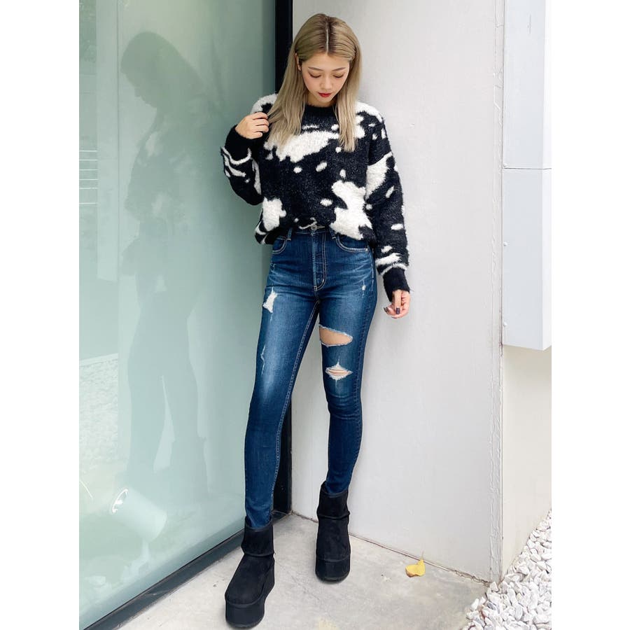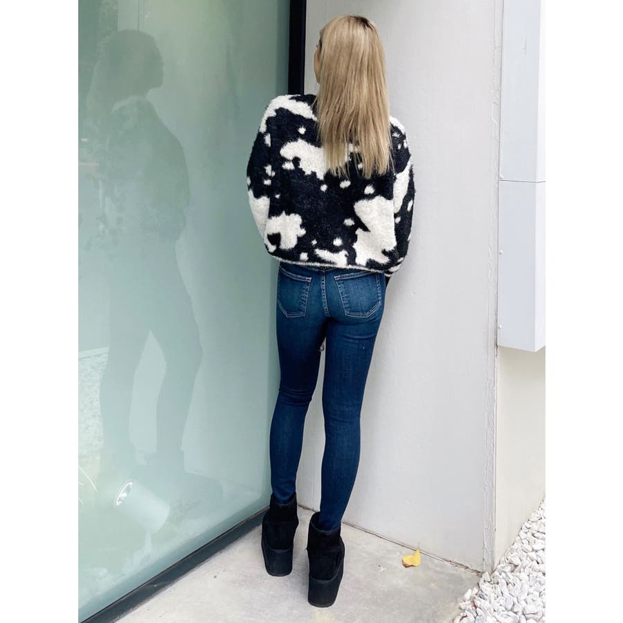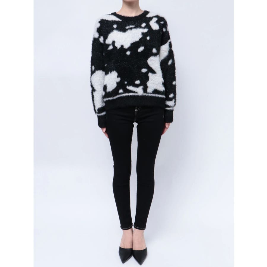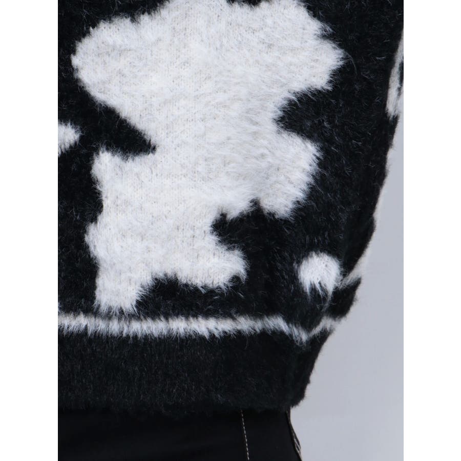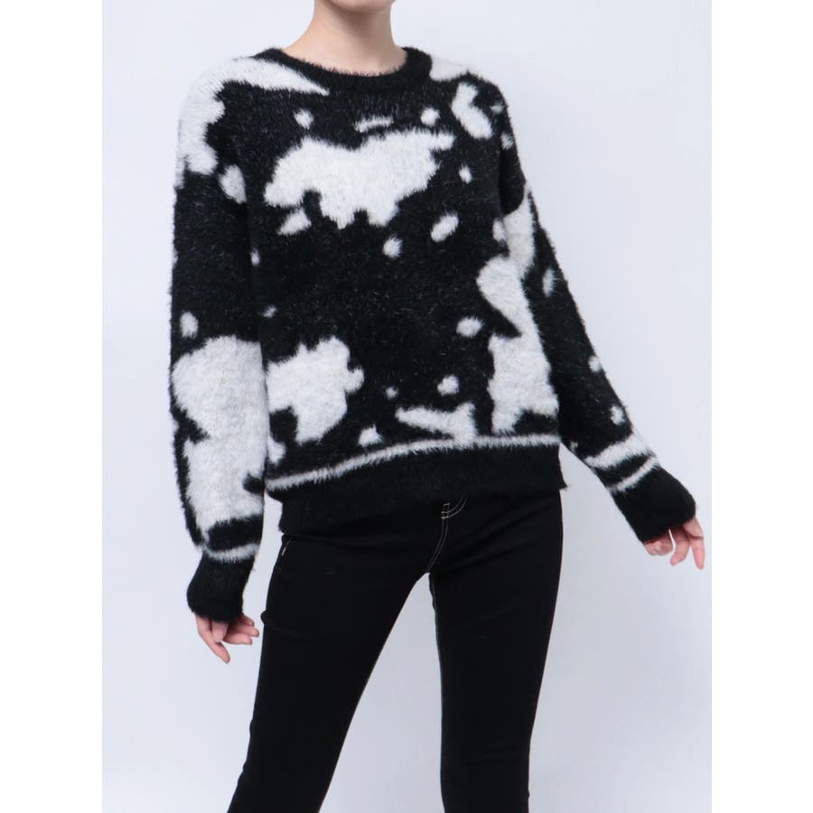 ふんわりとした肌触りが心地よい、カウスポット柄のニットトップス。