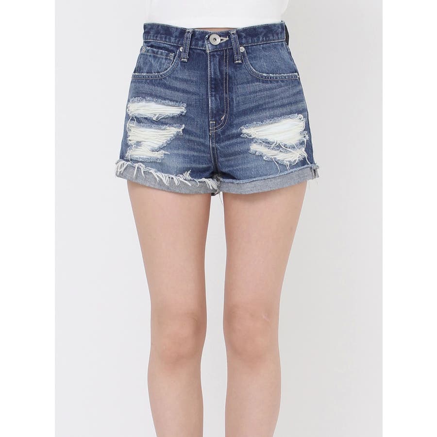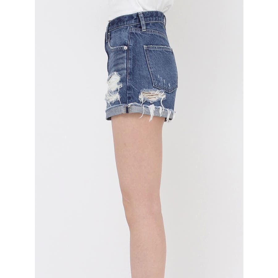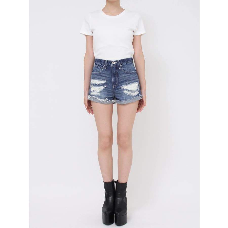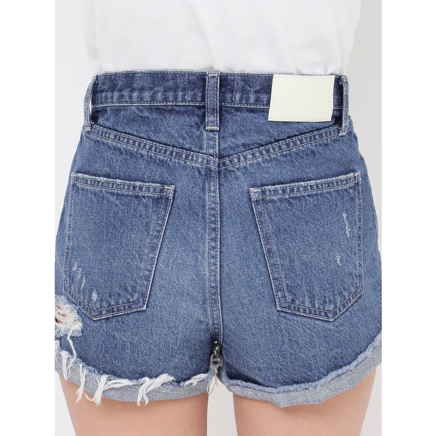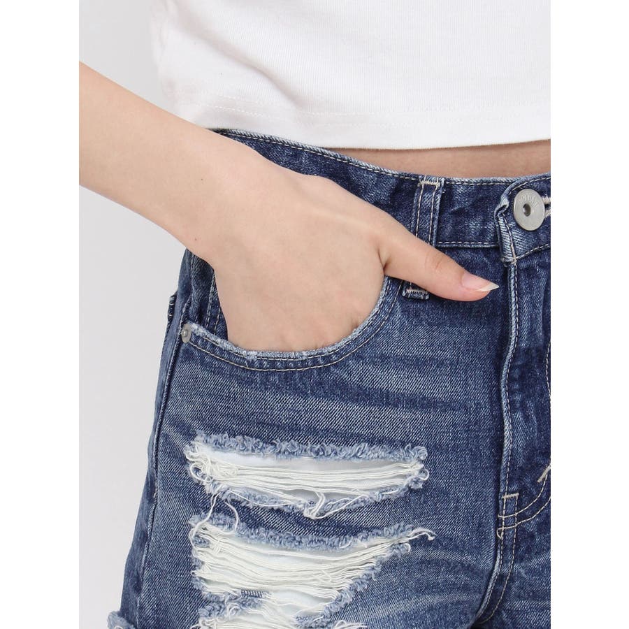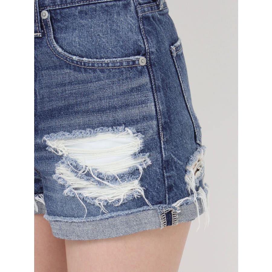 【ブルー】ジャストウエストダメージデニムショートパンツ