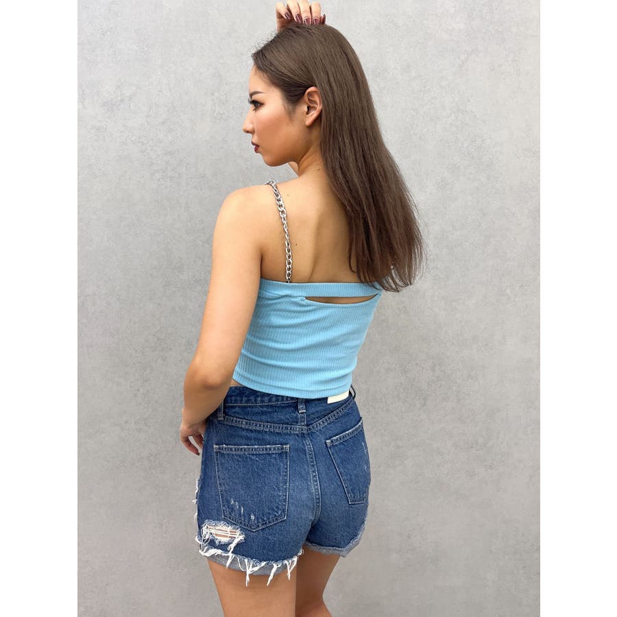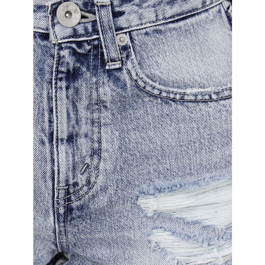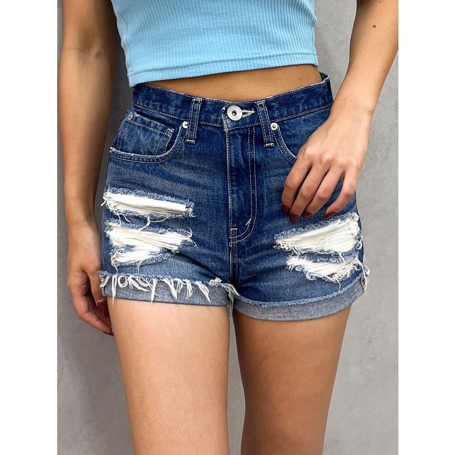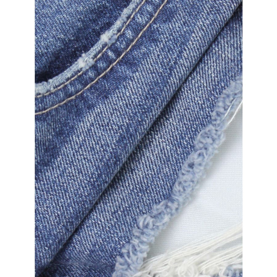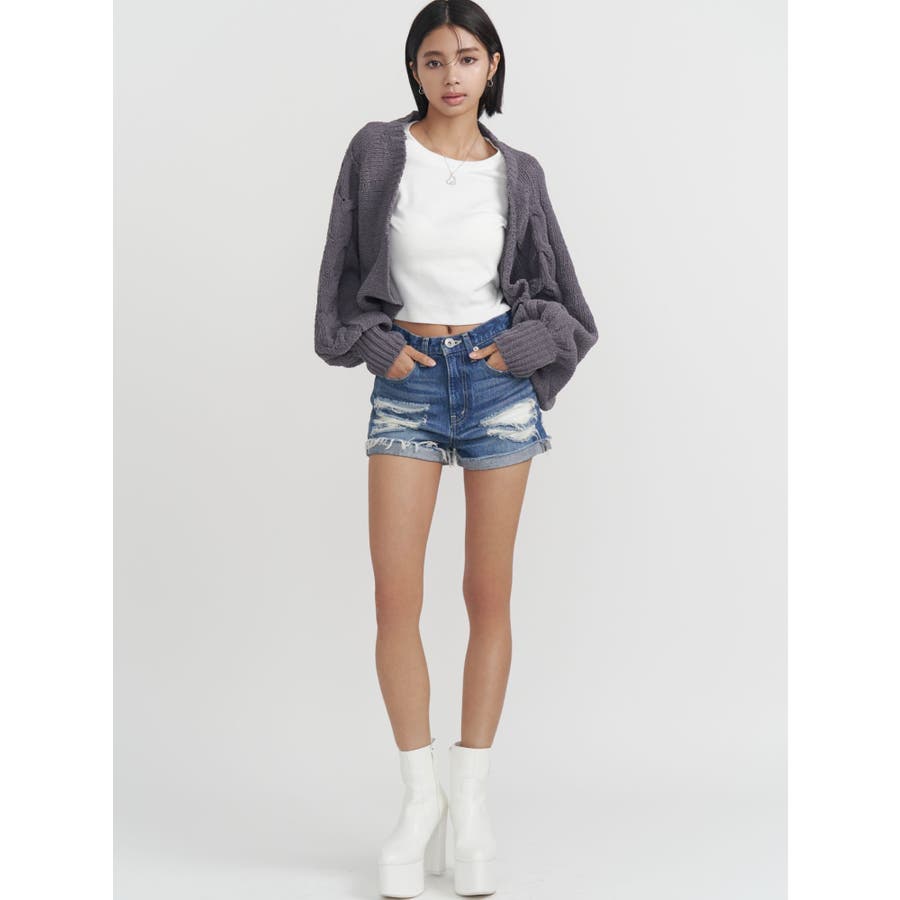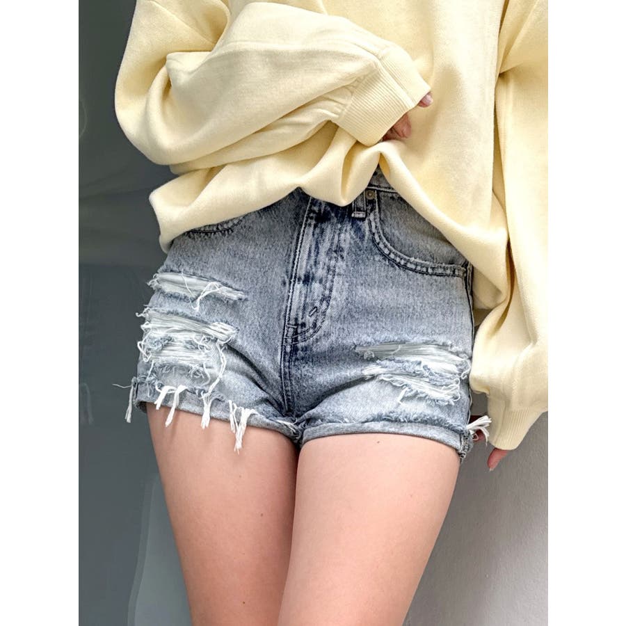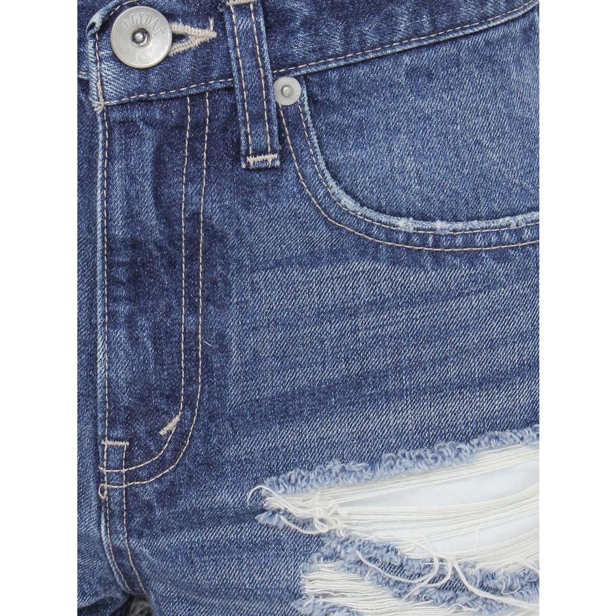 【ブルー】ジャストウエストダメージデニムショートパンツ
