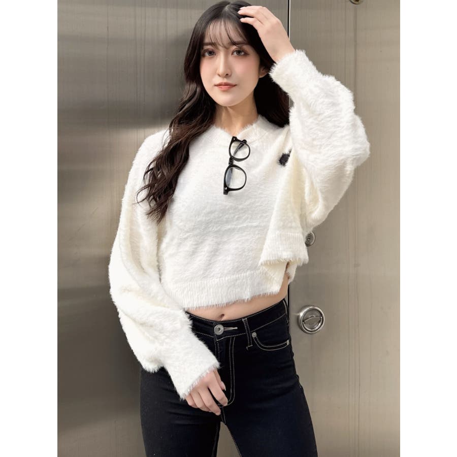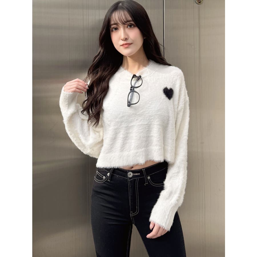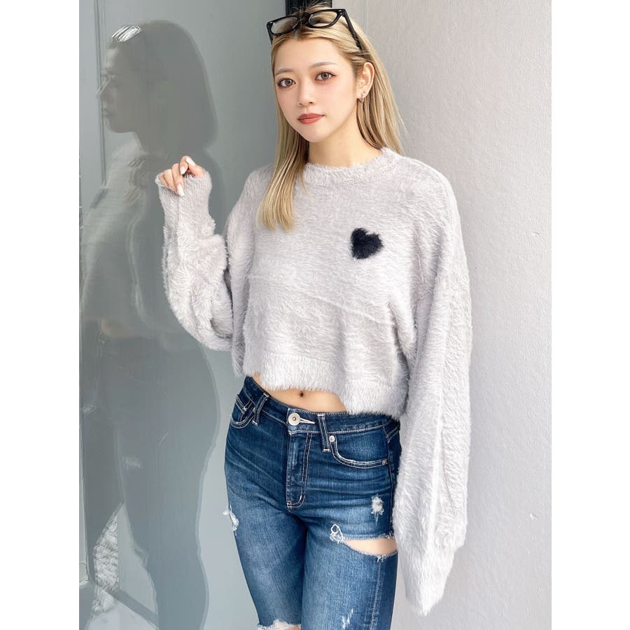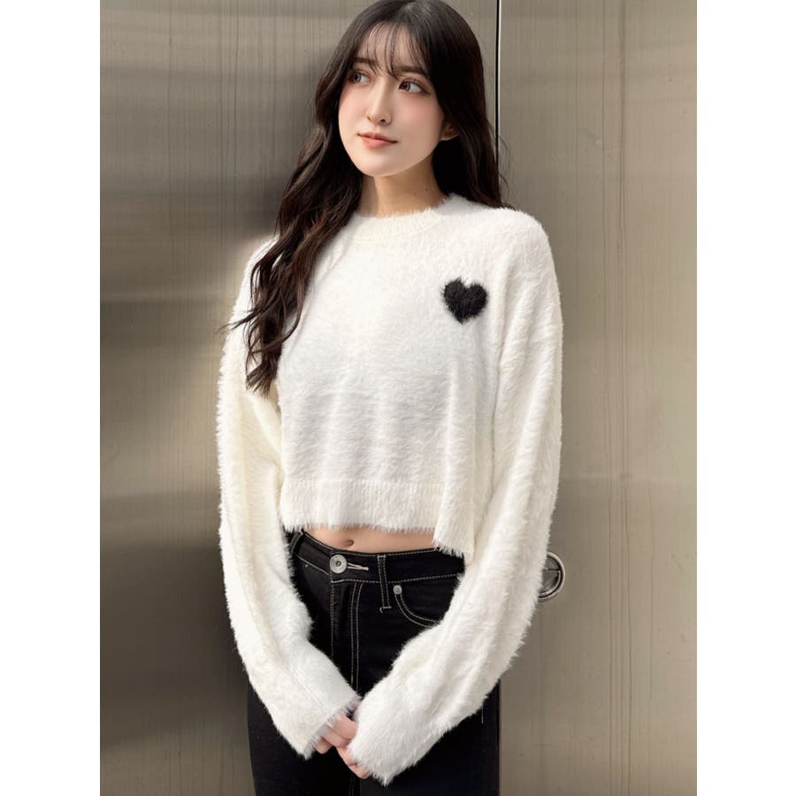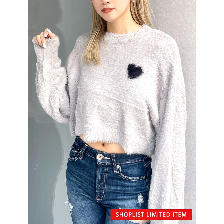 SHOPLIST限定アイテム 左胸のハートロゴが特徴的な、ふんわりタッチで思わず触りたくなるトレンド感あるシャギーニットトップスです。 袖にボリュームを出し女性らしく、クロップド丈でスタイルUPも期待できます。 デニムはもちろん、クロップド丈なのでどんなボトムとも相性がいいです。【商品特徴】透け感:なし伸縮性:あり生地の厚さ:薄手サイズ感:ゆったり裏地:なしポケット:なし