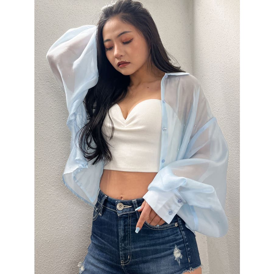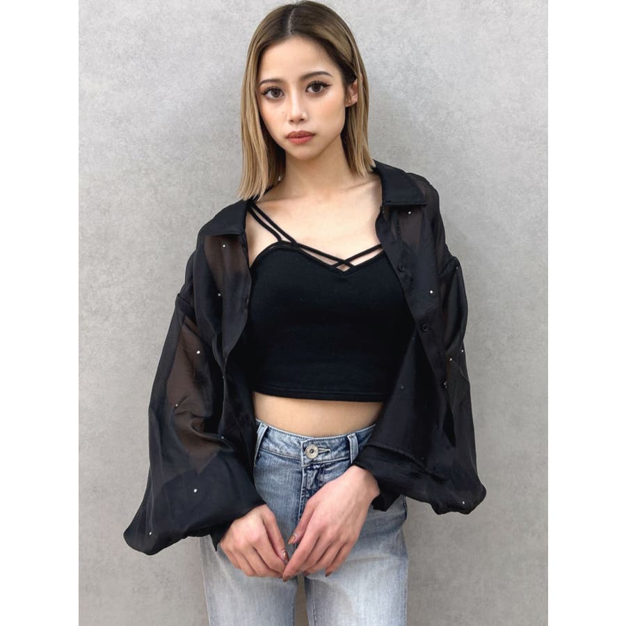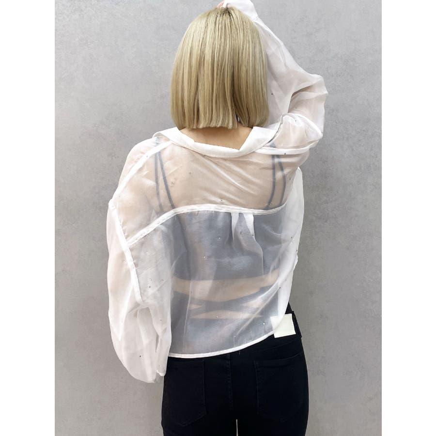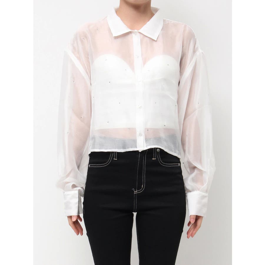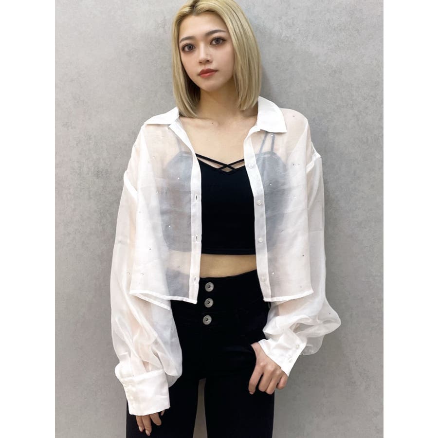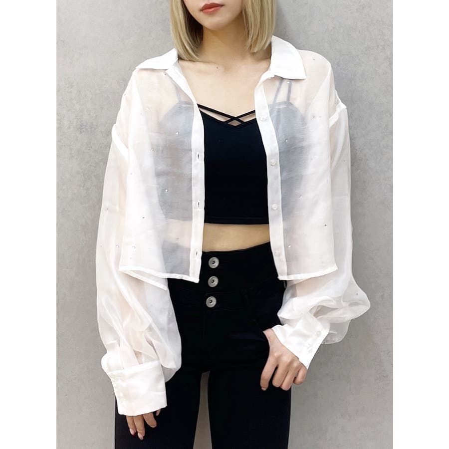 ■デザイン GYDA(ジェイダ) シアーラインストーンショートシャツ 前面にラインストーンを施したゆったりとしたシャツ。 光沢感のあるシアー素材とショート丈でコーデに抜け感をプラスします。 ■スタイリング 施されたラインストーンが目を引き、シンプルながらも羽織るだけでコーデの主役に。 どんなスタイリングにもマッチする、持っておくと重宝する1枚です。 ショート丈なのでハイウエストの細身ボトムがバランスが良く相性抜群◎ ■商品のお気に入り登録 再入荷通知やラスト1点、お得なプライスダウンの情報も受け取ることができます。 ぜひご登録ください◎ ・・・・・・・・・・・・・・・・・・・・・・ ※着用画像はフラッシュの加減で実際の製品と色味等が異なる場合がございますので、生地のズームアップ画像をご確認ください。 ※ご利用の端末画面の設定により実際の商品と色味が異なる場合がございます。 【商品特徴】透け感:あり伸縮性:なし生地の厚さ:普通サイズ感:ゆったり裏地:なしポケット:なし
