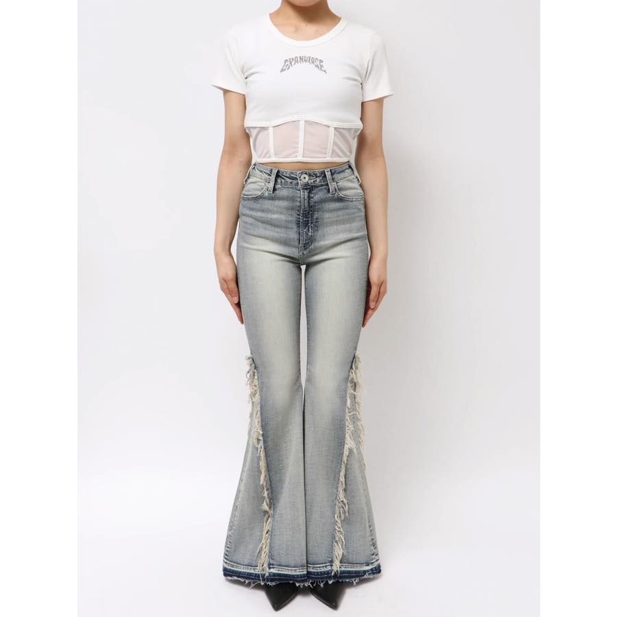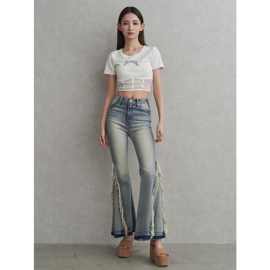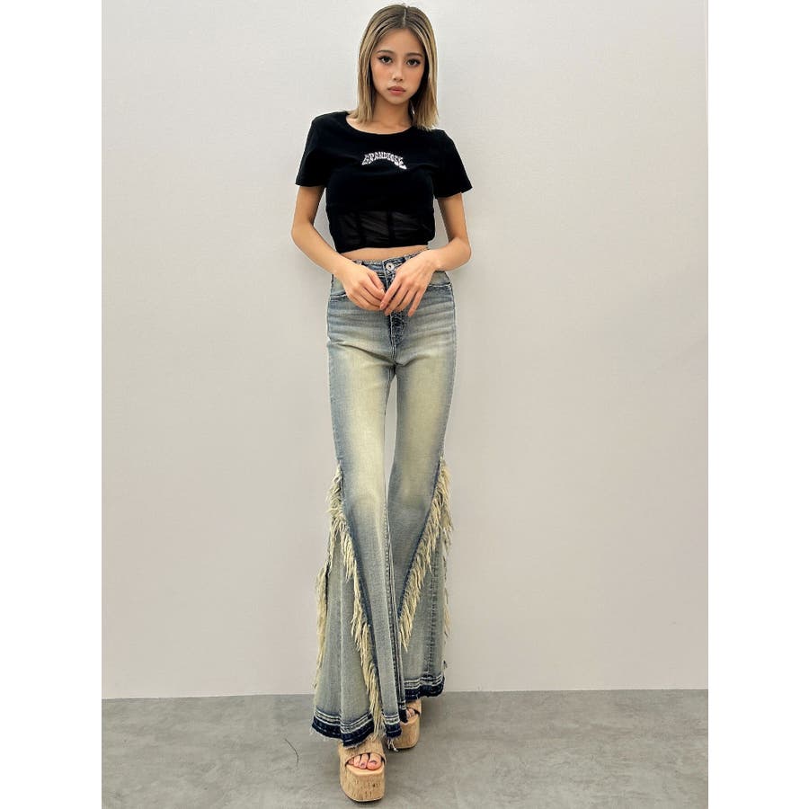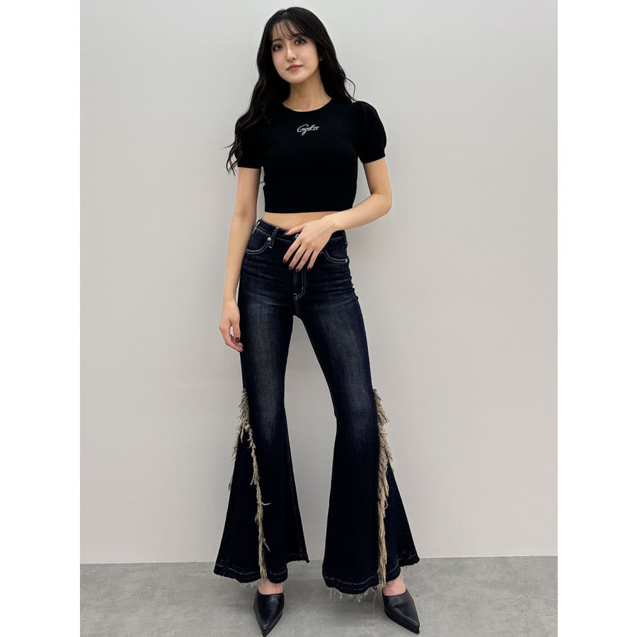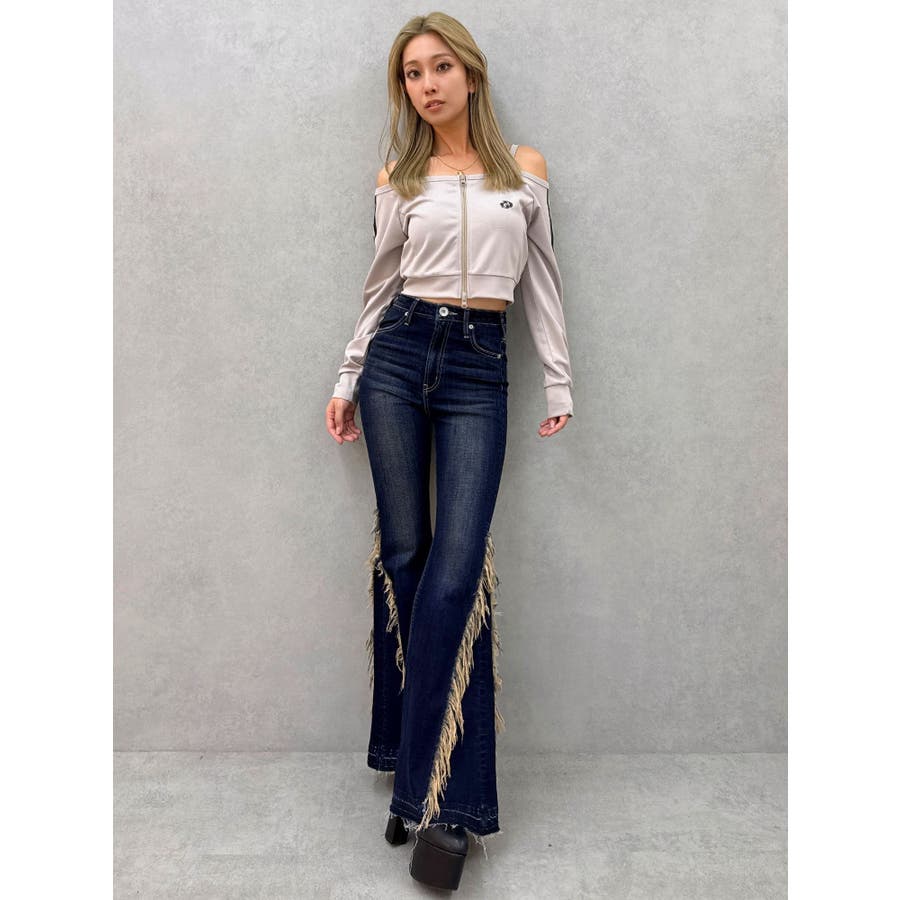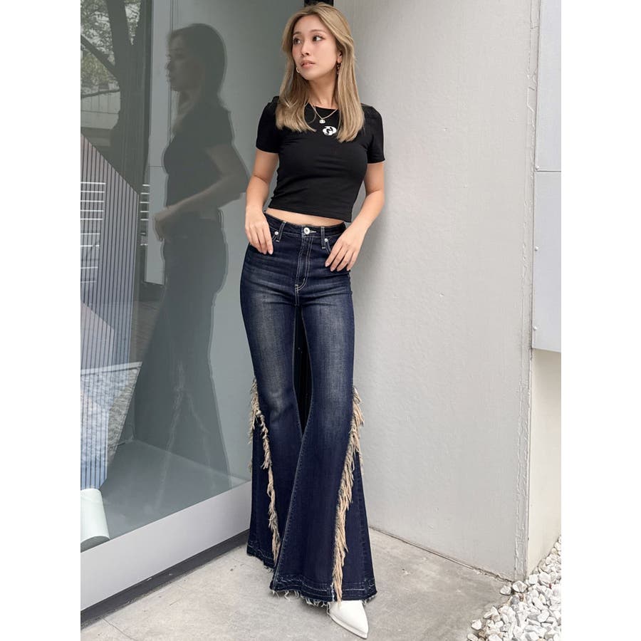 ハイウエストSIDEフリンジフレアデニムパンツ