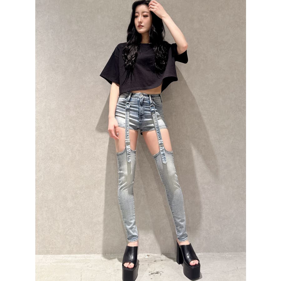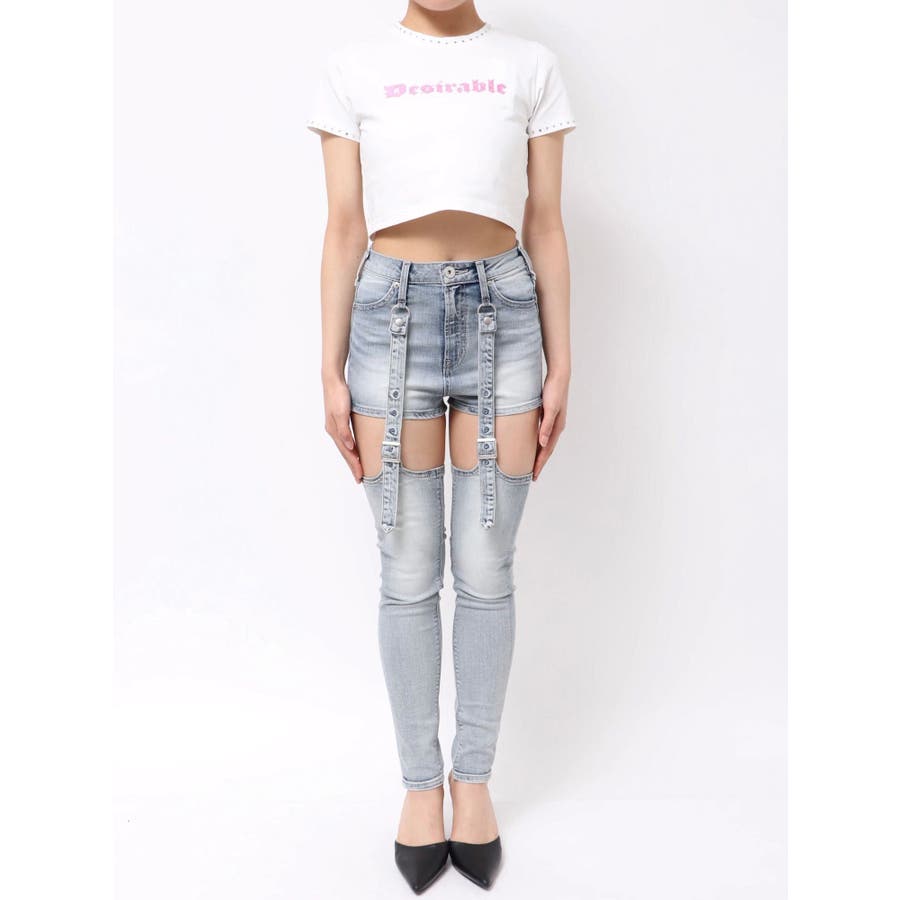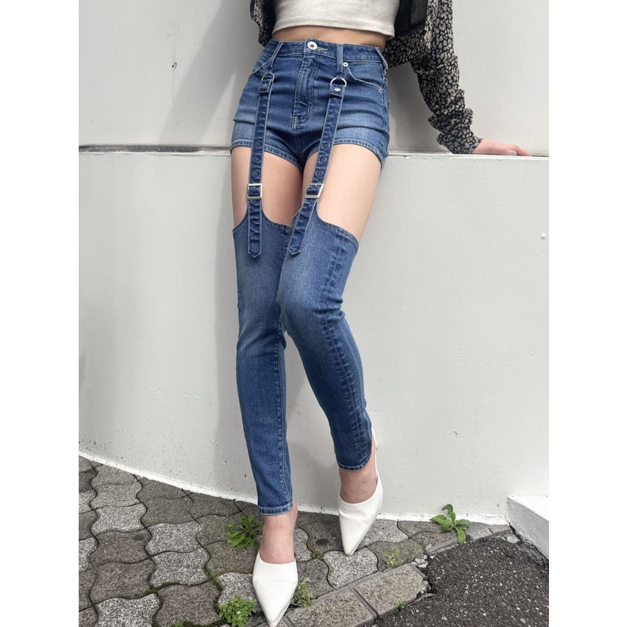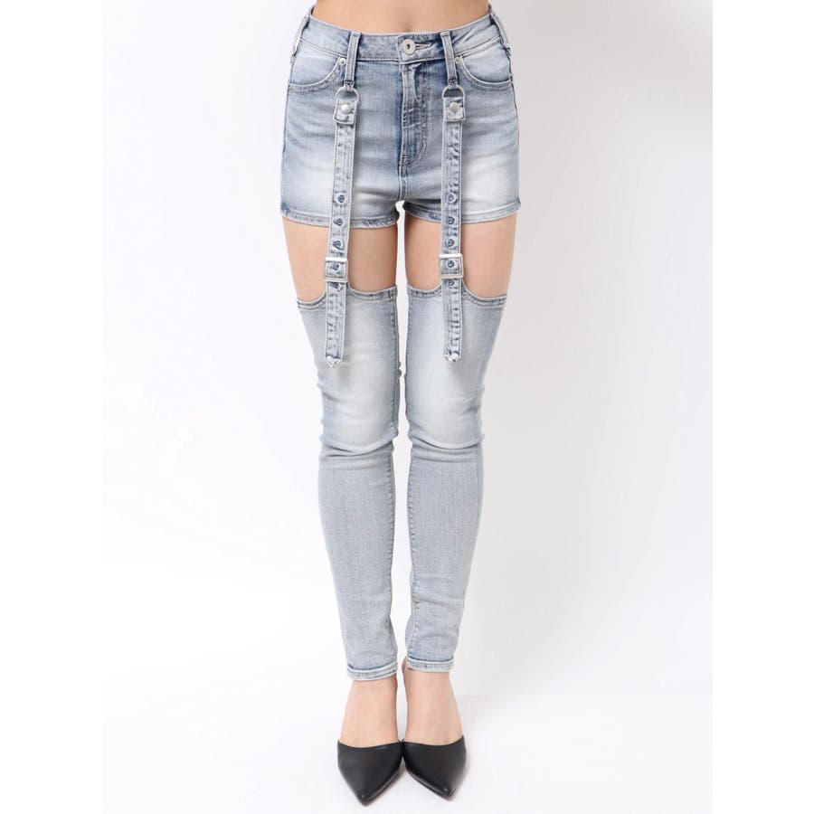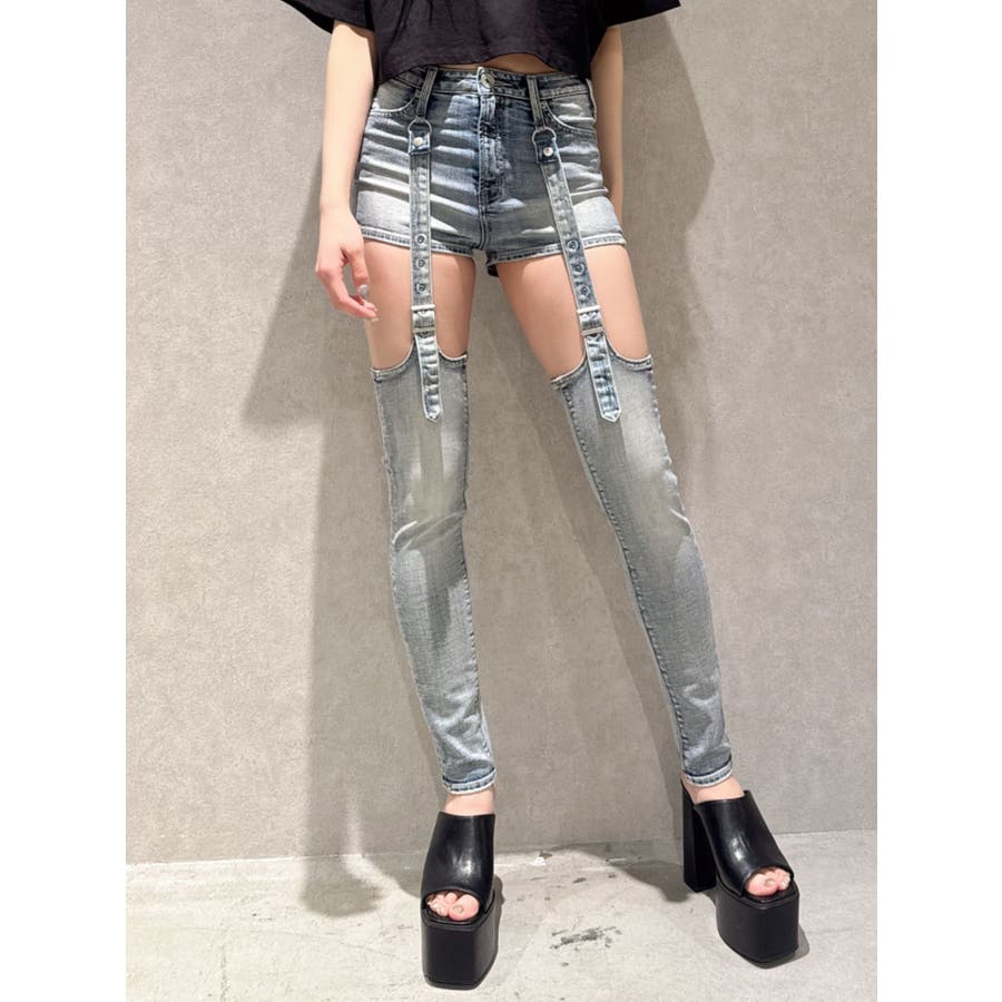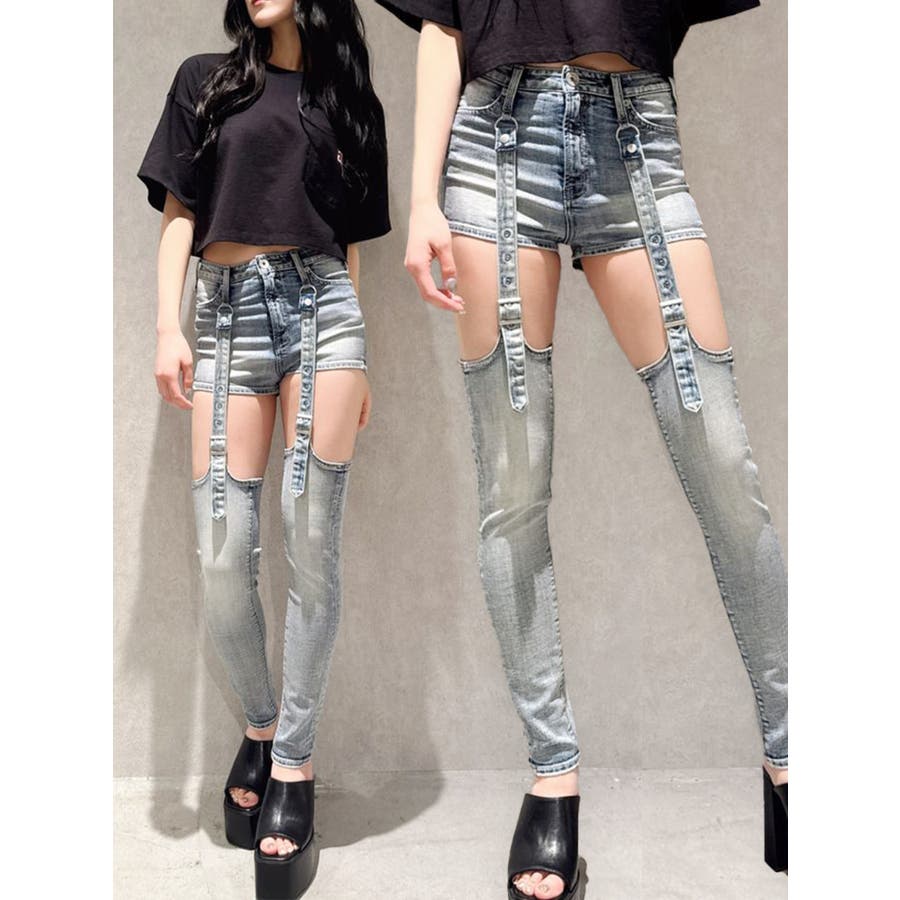 ショートパンツとスキニーパンツが一体化した、斬新なデザインの2WAYデニムパンツ。