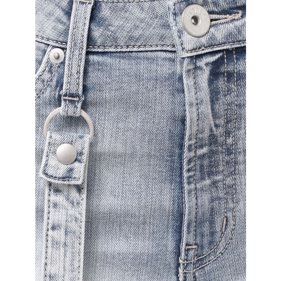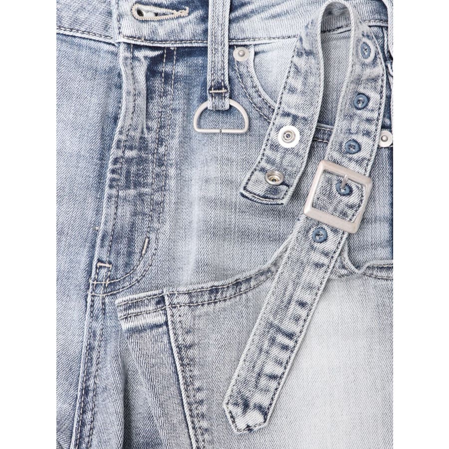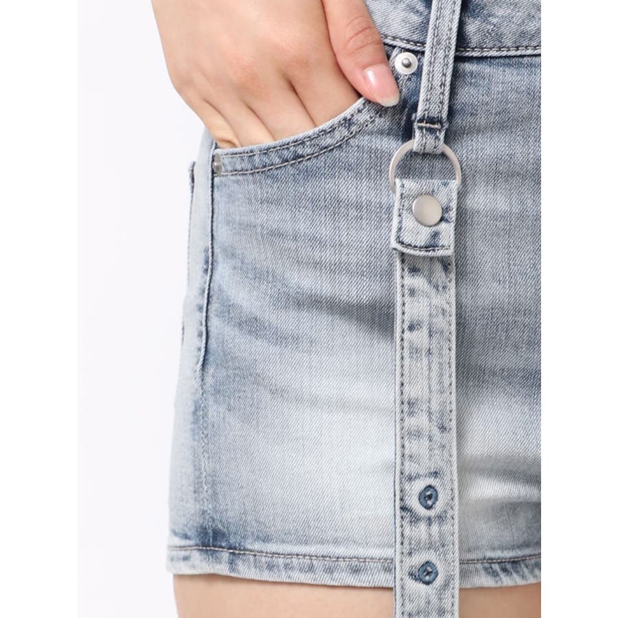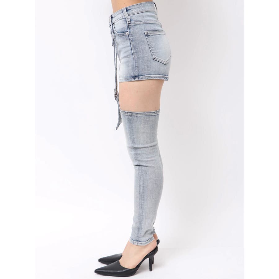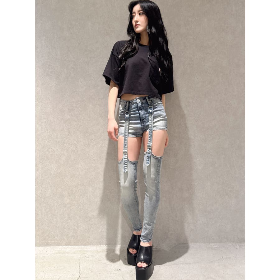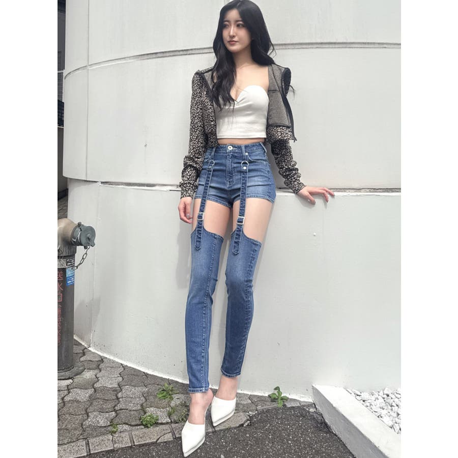 ショートパンツとスキニーパンツが一体化した、斬新なデザインの2WAYデニムパンツ。