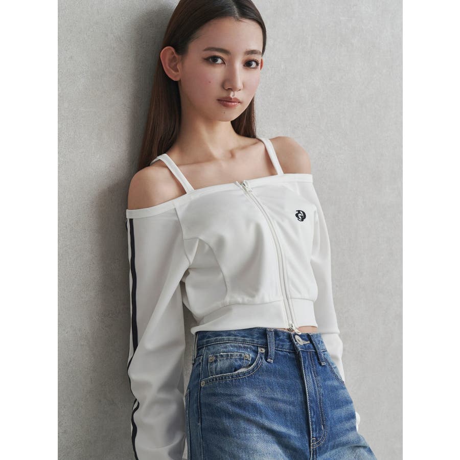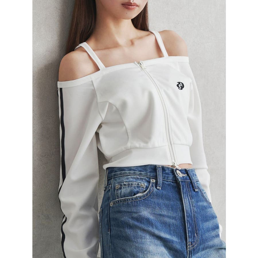 スポーティなデザインでありながら、オフショルダーのデザインが女性らしさを感じさせる1着。