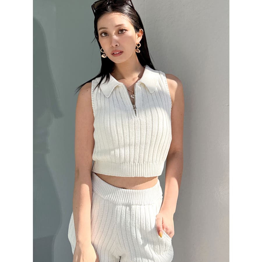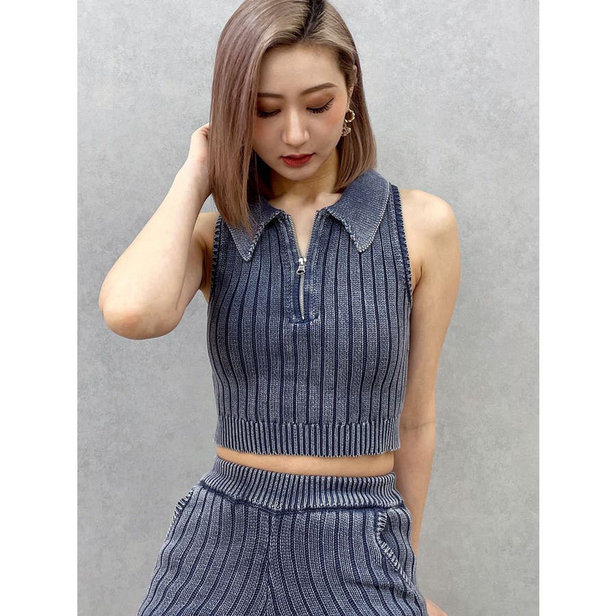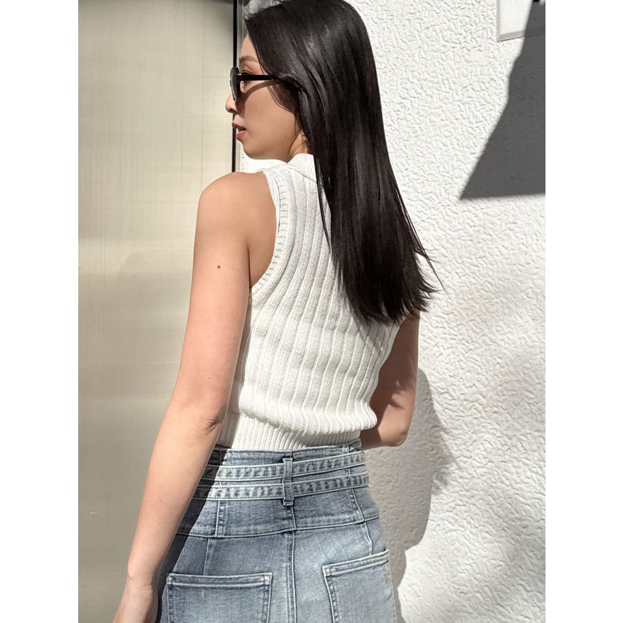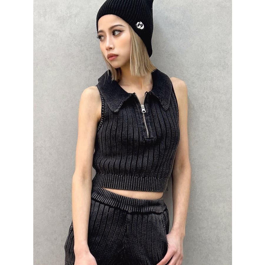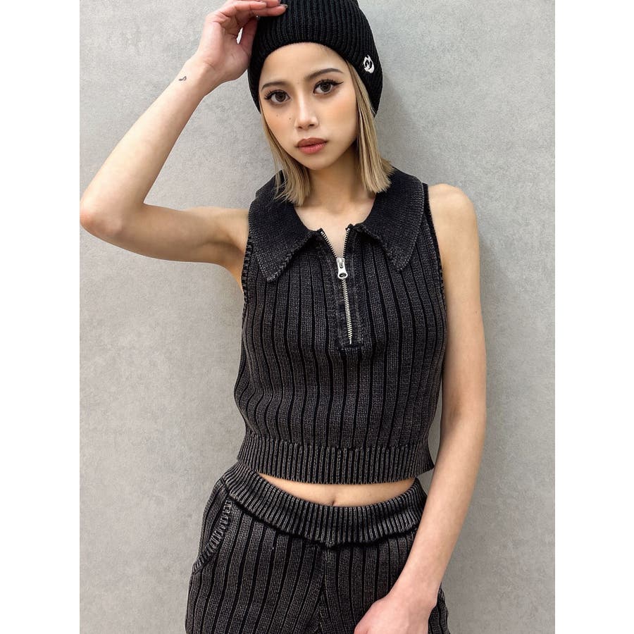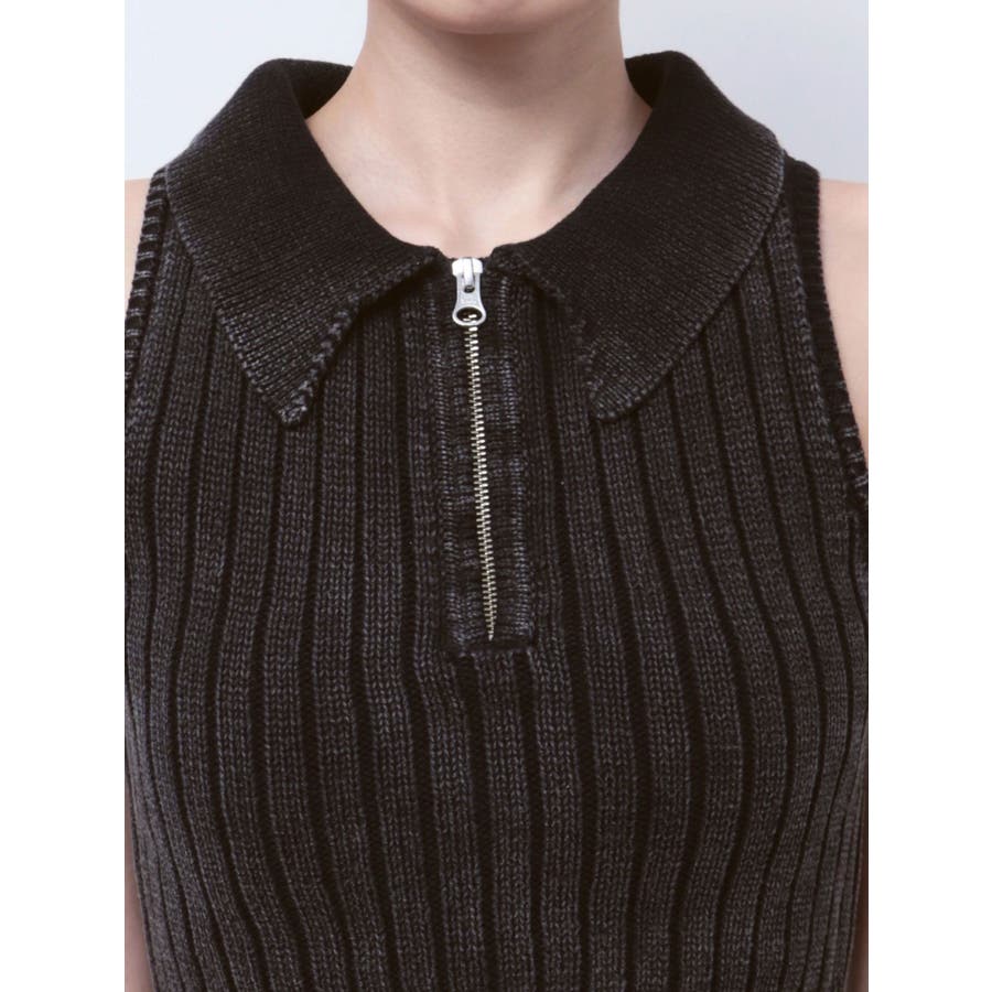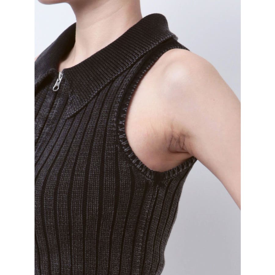 大人気のブリーチニットをトレンドのポロディテールに落とし込み、ノースリ+ハーフジップデザインも新しい見え方のアイテムです。