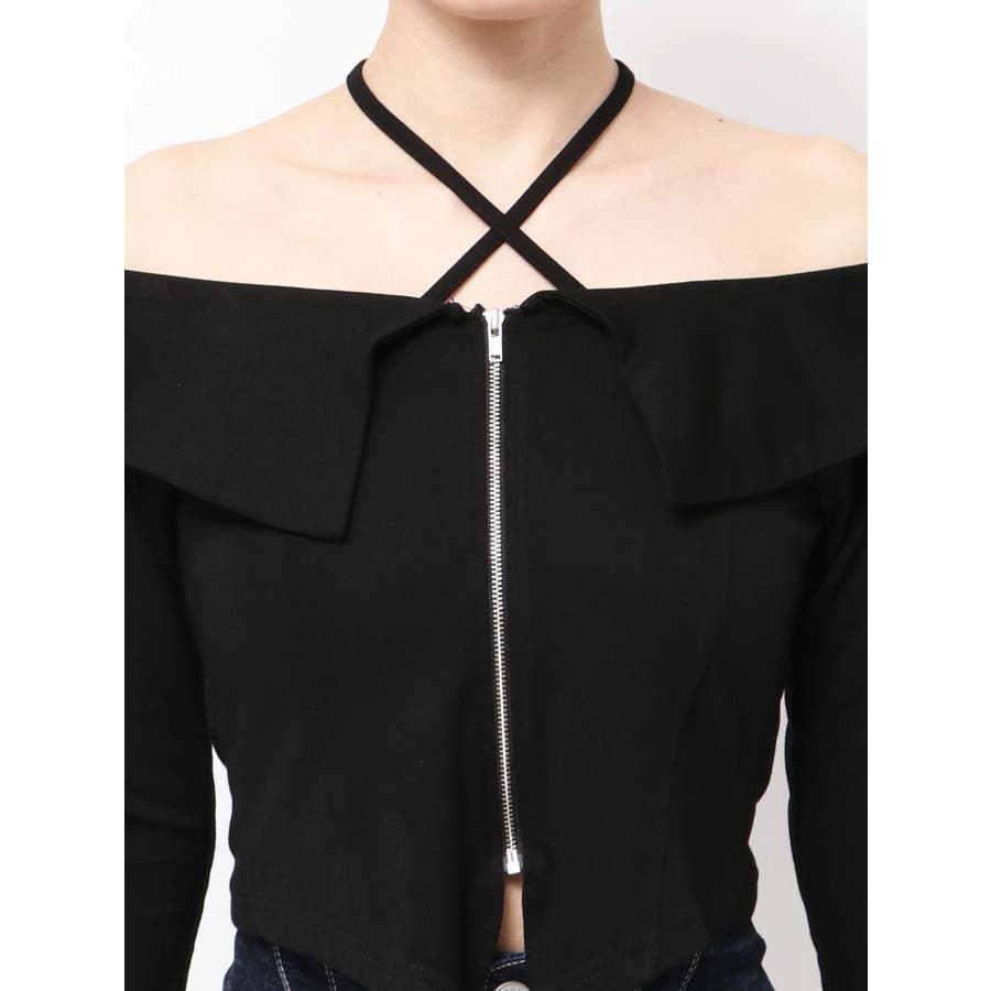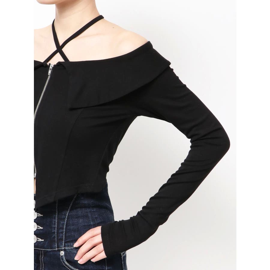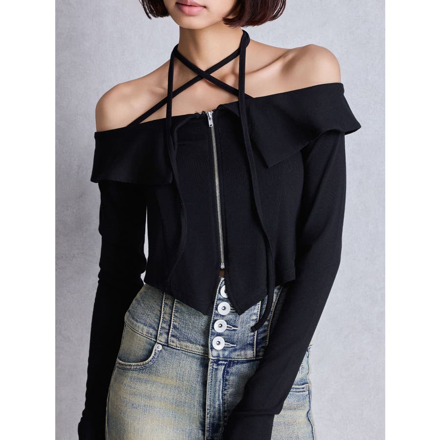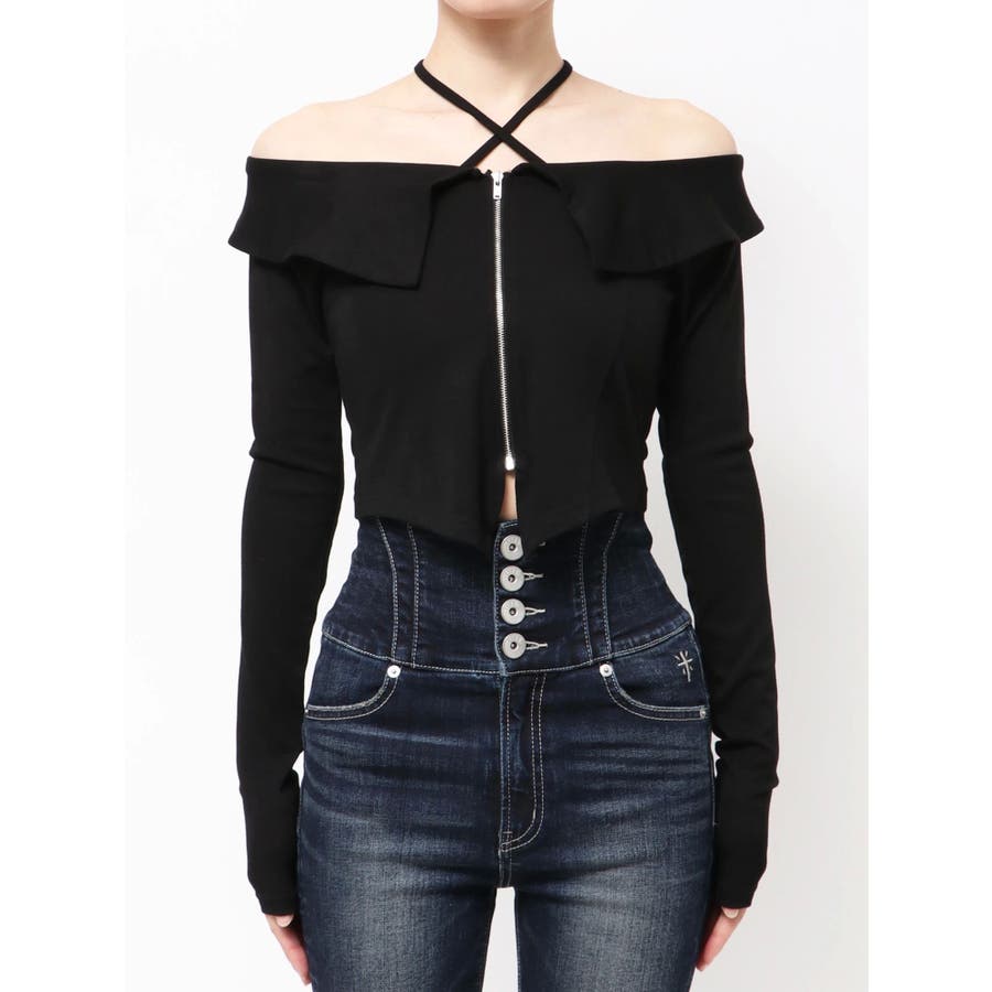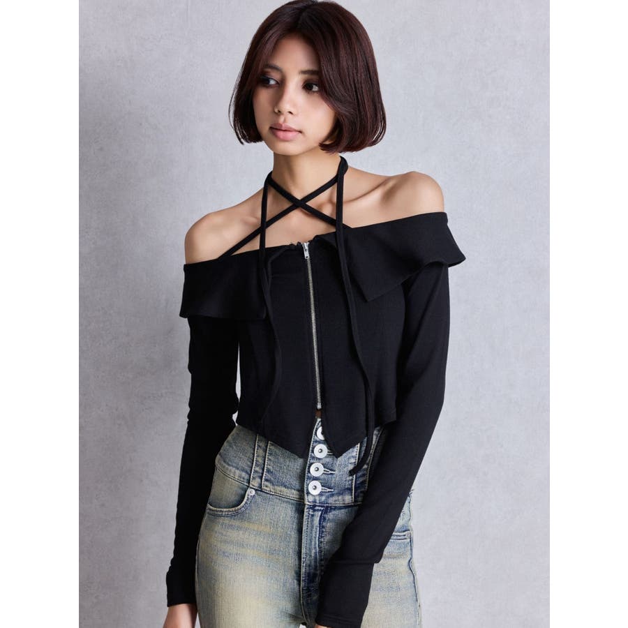■デザイン オフショルディテール+クロスチョーカー+ショートな着丈+フロントZIPのデザインが、 GYDAらしいセクシーでedgeを効かせた拘りポイント。 素材も伸縮性に優れ、肌なじみも抜群です。 *脇部分に紐を付けているので、オフショルで着用した際に、紐をクロスし後ろ首部分でリボン結びにして着用してください。 ■スタイリング ハイウエストのフレアデニム合わせがマストです。 ■商品のお気に入り登録 再入荷通知やラスト1点、お得なプライスダウンの情報も受け取ることができます。 ぜひご登録ください◎ ・・・・・・・・・・・・・・・・・・・・・・ ※着用画像はフラッシュの加減で実際の製品と色味等が異なる場合がございますので、生地のズームアップ画像をご確認ください。 ※ご利用の端末画面の設定により実際の商品と色味が異なる場合がございます。