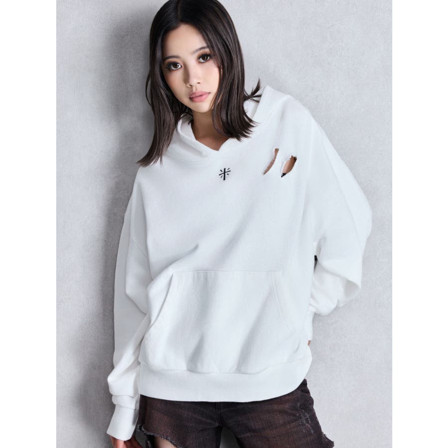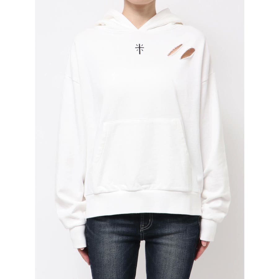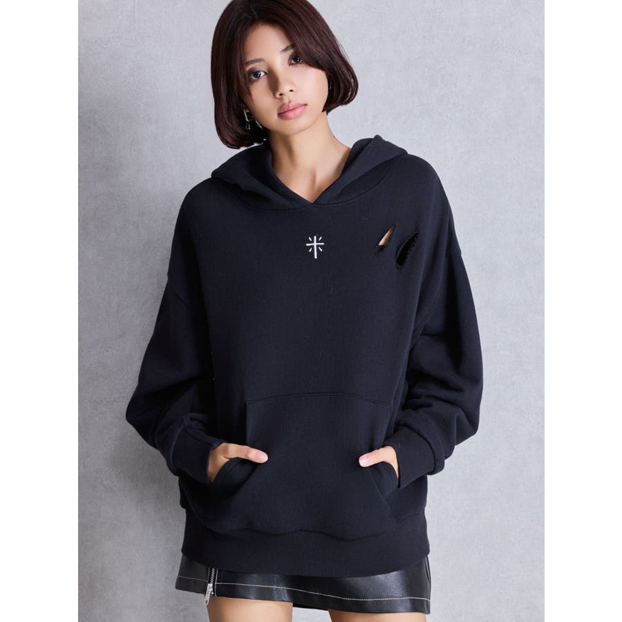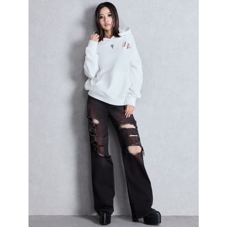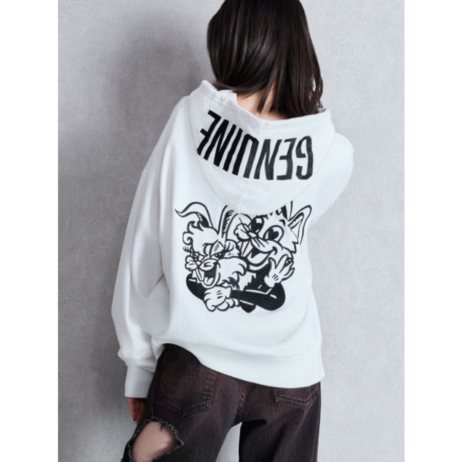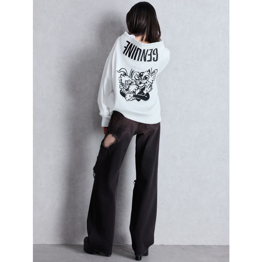前身に肌見せダメージ+クロスポイント刺繍入り、フード部分には「GENUINE」のロゴ刺繍が施され、後ろ姿までしっかりキマるデザインです。