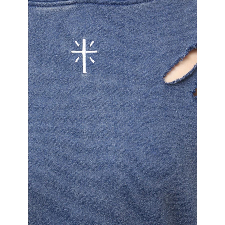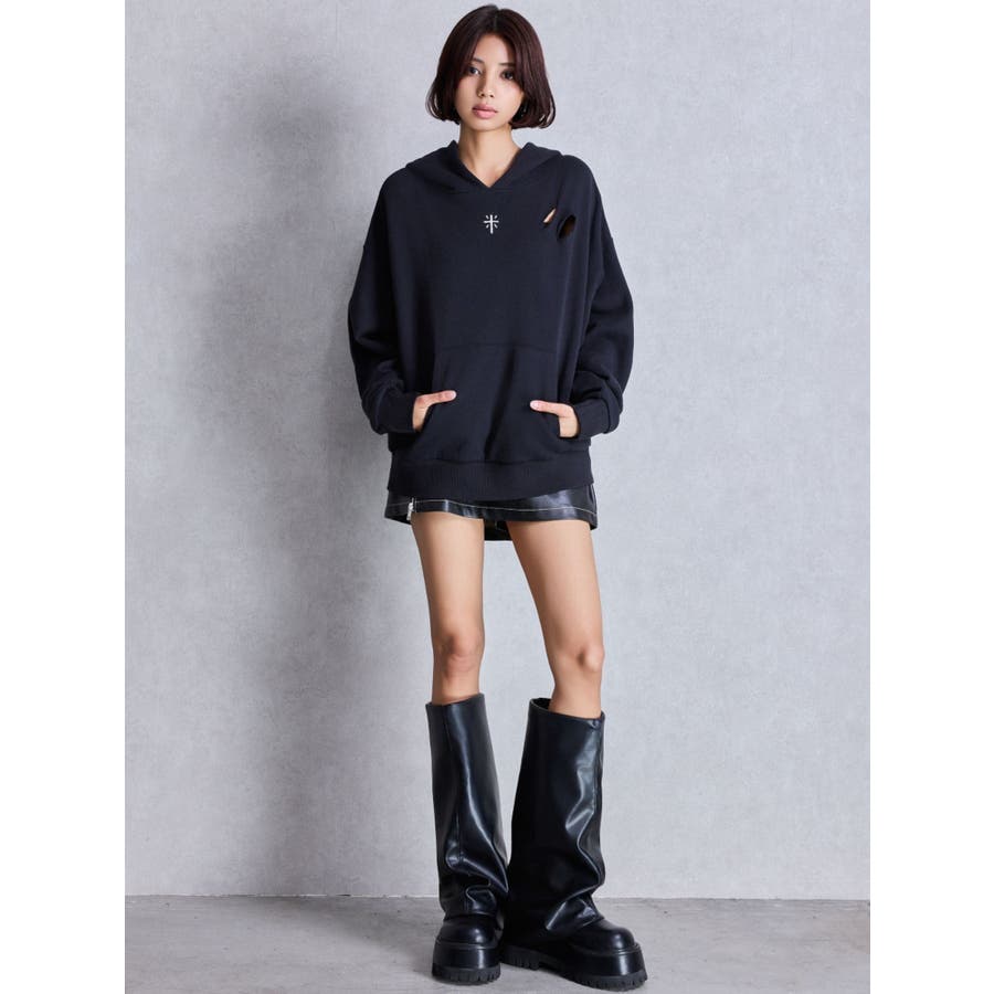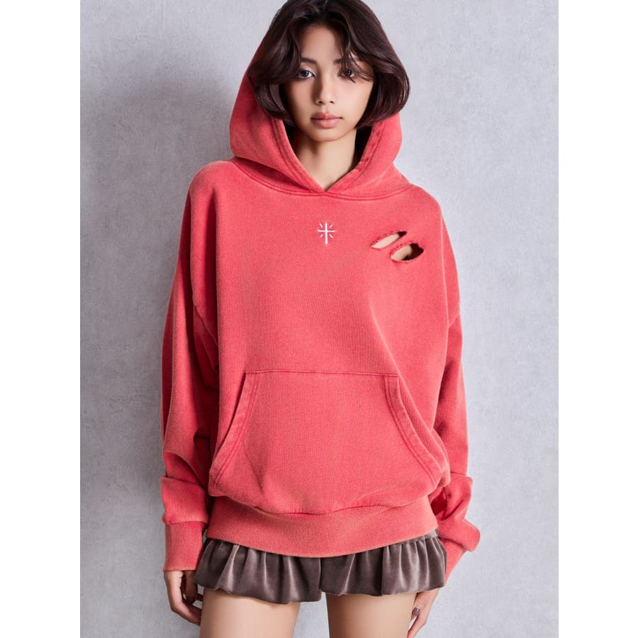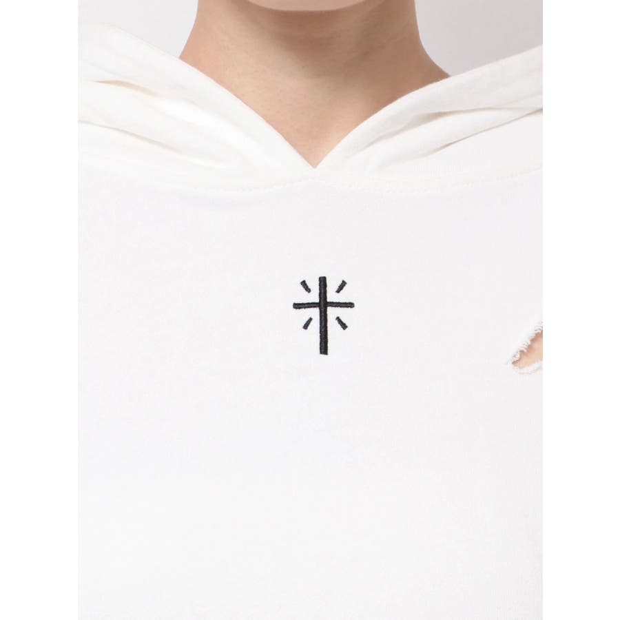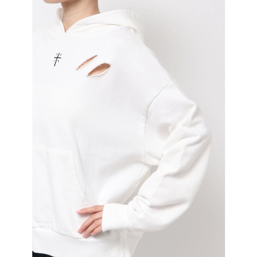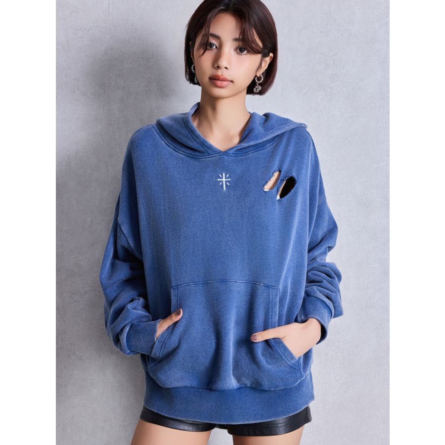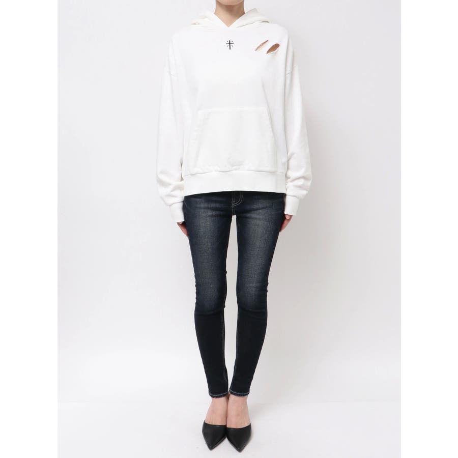 前身に肌見せダメージ+クロスポイント刺繍入り、フード部分には「GENUINE」のロゴ刺繍が施され、後ろ姿までしっかりキマるデザインです。