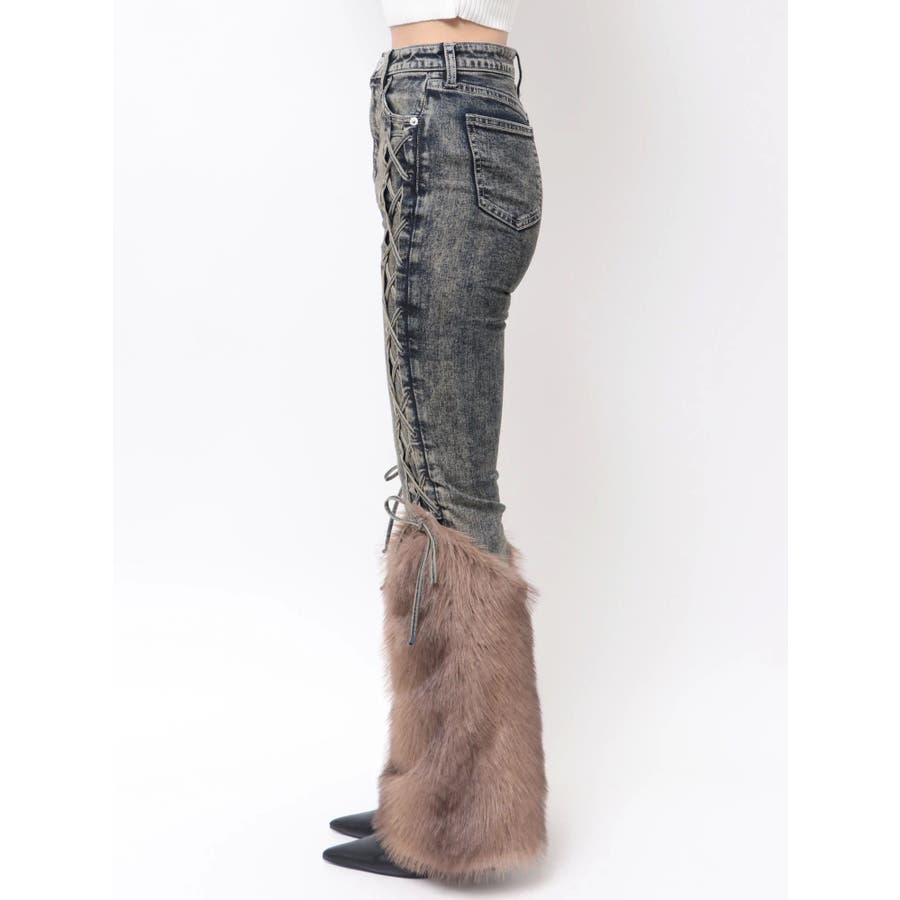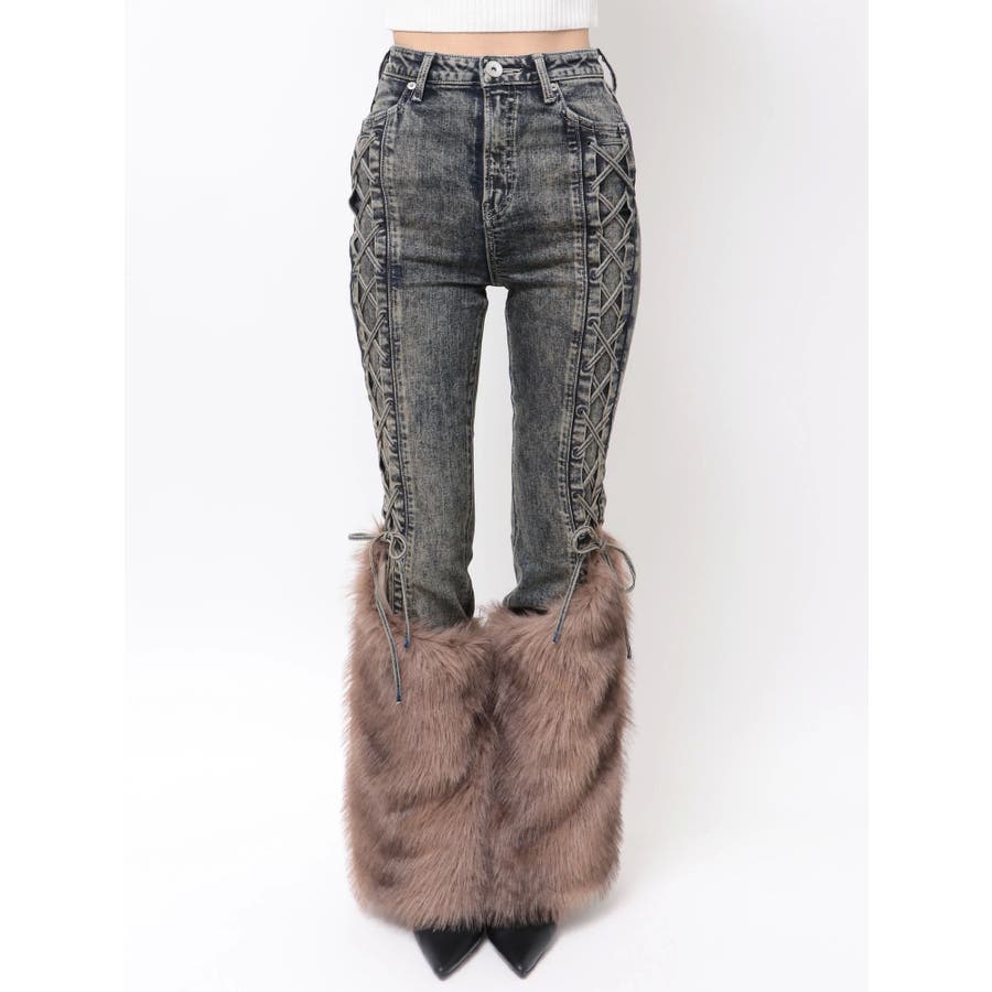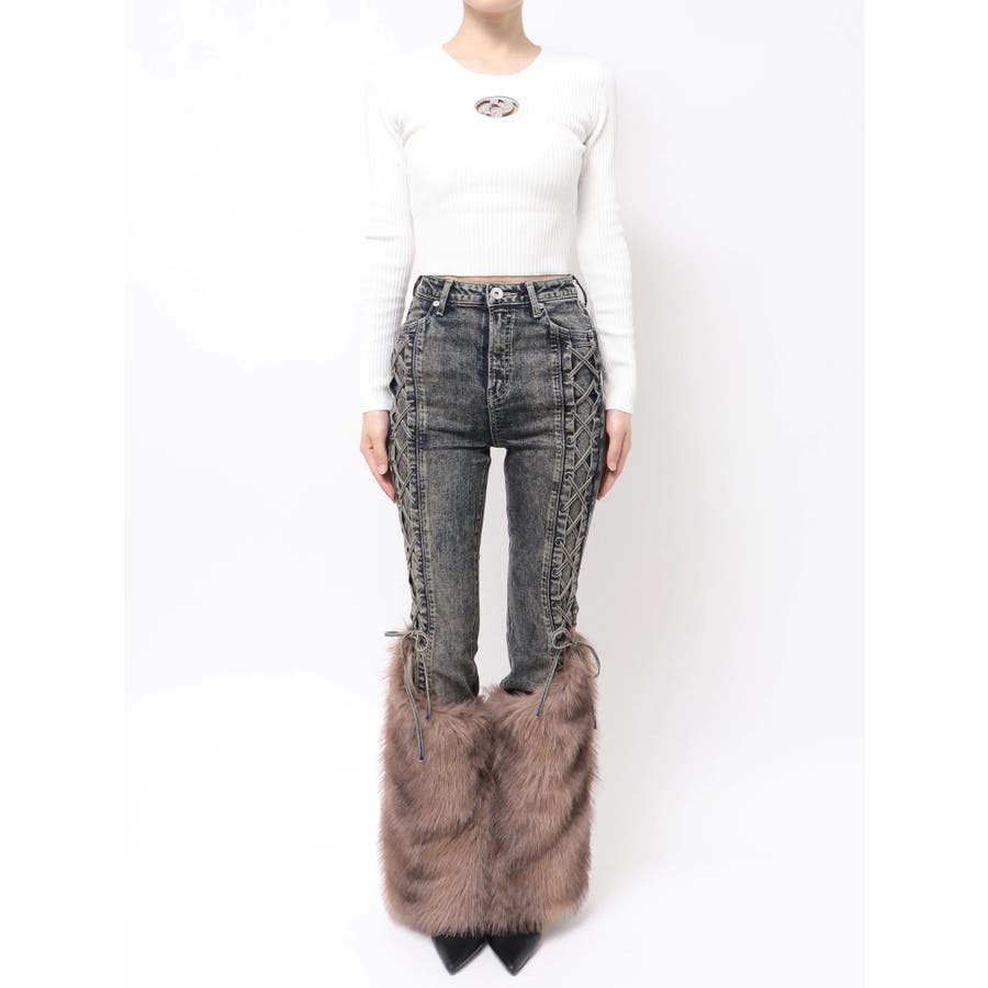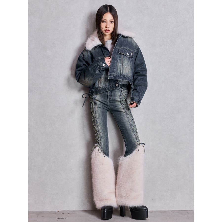 ■セットアップアイテムはこちら 2WAY ECO FURショートデニムGジャン ■デザイン ハイウエストのフレアシルエットのボディーに両サイドレースアップデザインを施し、 2WAYで取り外せるエコファーのレッグウォーマーが付いたデザインデニムが新登場。 エコファーは、レースアップ部分と内側のボタン取り外し仕様で、 合わせる物によってデザインを変えて着用できるのが嬉しい1本。 レースアップ部分の、コントラストを付けたウォッシュ加工も、美脚効果抜群です。 ■スタイリング プラットフォーム系のシューズと合わせて脚長効果◎ セットアップ着用で、個性的かつトレンド感のあるスタイルを演出◎ ■商品のお気に入り登録 再入荷通知やラスト1点、お得なプライスダウンの情報も受け取ることができます。 ぜひご登録ください◎ ・・・・・・・・・・・・・・・・・・・・・・ ※着用画像はフラッシュの加減で実際の製品と色味等が異なる場合がございますので、生地のズームアップ画像をご確認ください。 ※ご利用の端末画面の設定により実際の商品と色味が異なる場合がございます。【商品特徴】透け感:なし伸縮性:なし生地の厚さ:普通サイズ感:普通裏地:ありポケット:あり(前)