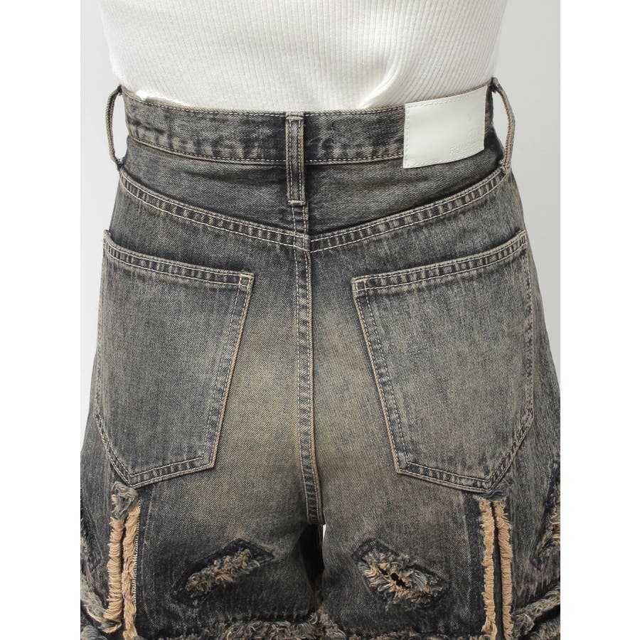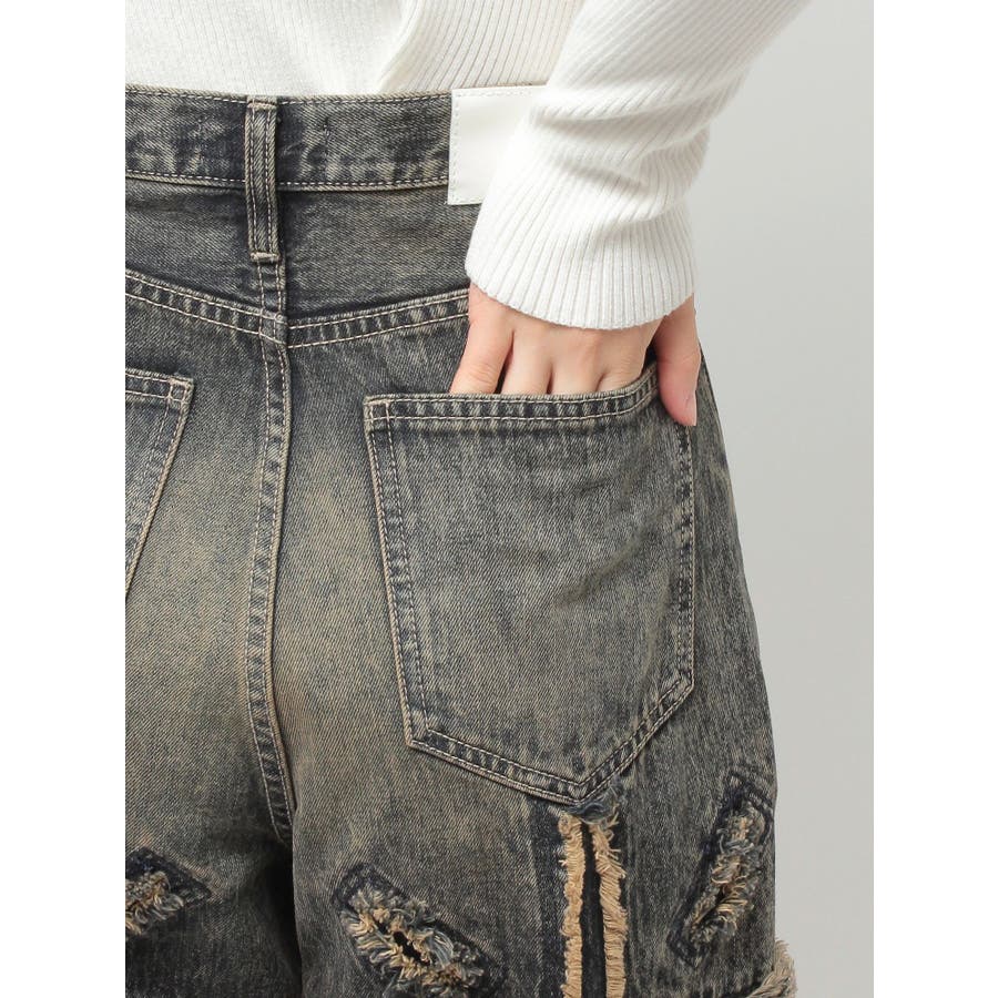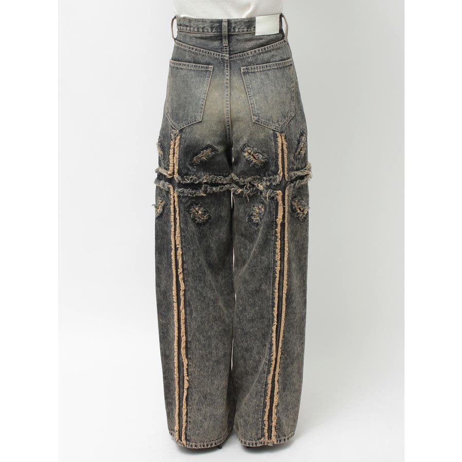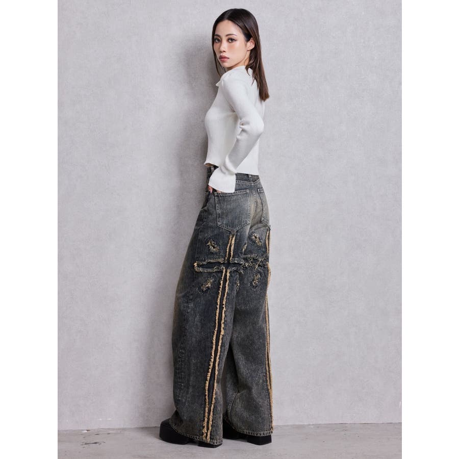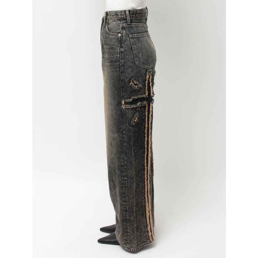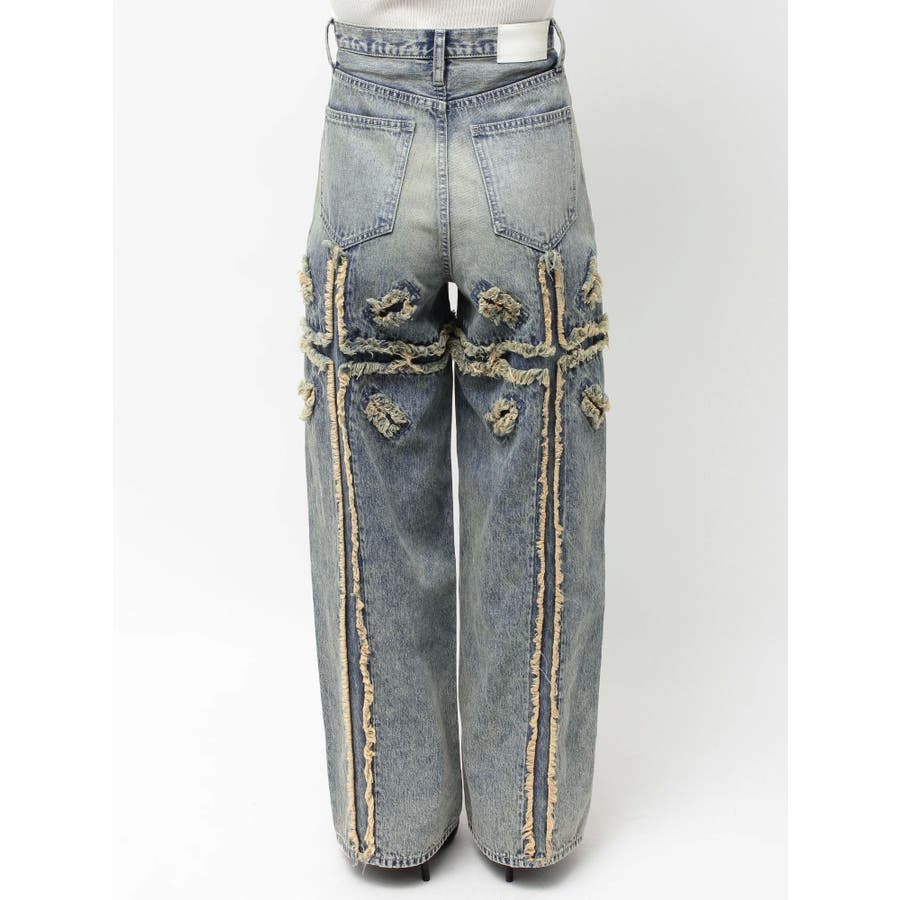 ■デザイン 後ろにクロスモチーフを大胆に施し、唯一無二の存在感を演出。 カジュアルながらもどこかエッジィな印象で、 後ろ身頃に大胆に施された"クロスポイント"切り替えが、視線を引き寄せるアイキャッチデザインに。 フリンジ加工とダメージ感のあるラフな仕上がりで、こなれたヴィンテージテイスト。 シルエットが崩れにくいデニム生地と、ハイウエストワイドでスタイルアップも叶えてくれる1本。 ■スタイリング フィット感のあるトップスなど、シンプルでコンパクトなアイテム◎ 後ろの存在感を活かして、上半身は引き算するのがポイントです。 ■商品のお気に入り登録 再入荷通知やラスト1点、お得なプライスダウンの情報も受け取ることができます。 ぜひご登録ください◎ ・・・・・・・・・・・・・・・・・・・・・・ ※着用画像はフラッシュの加減で実際の製品と色味等が異なる場合がございますので、生地のズームアップ画像をご確認ください。 ※ご利用の端末画面の設定により実際の商品と色味が異なる場合がございます。