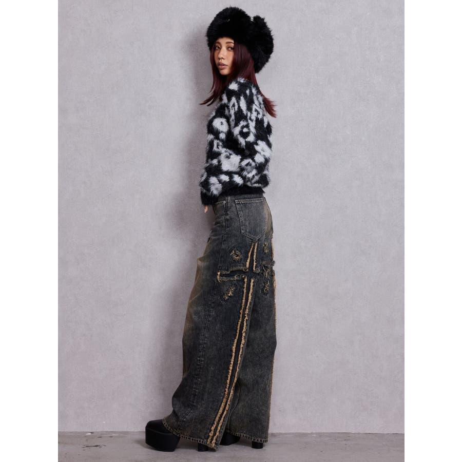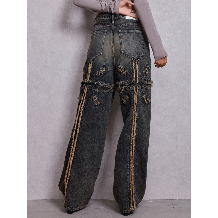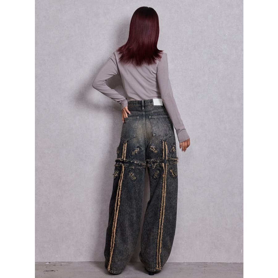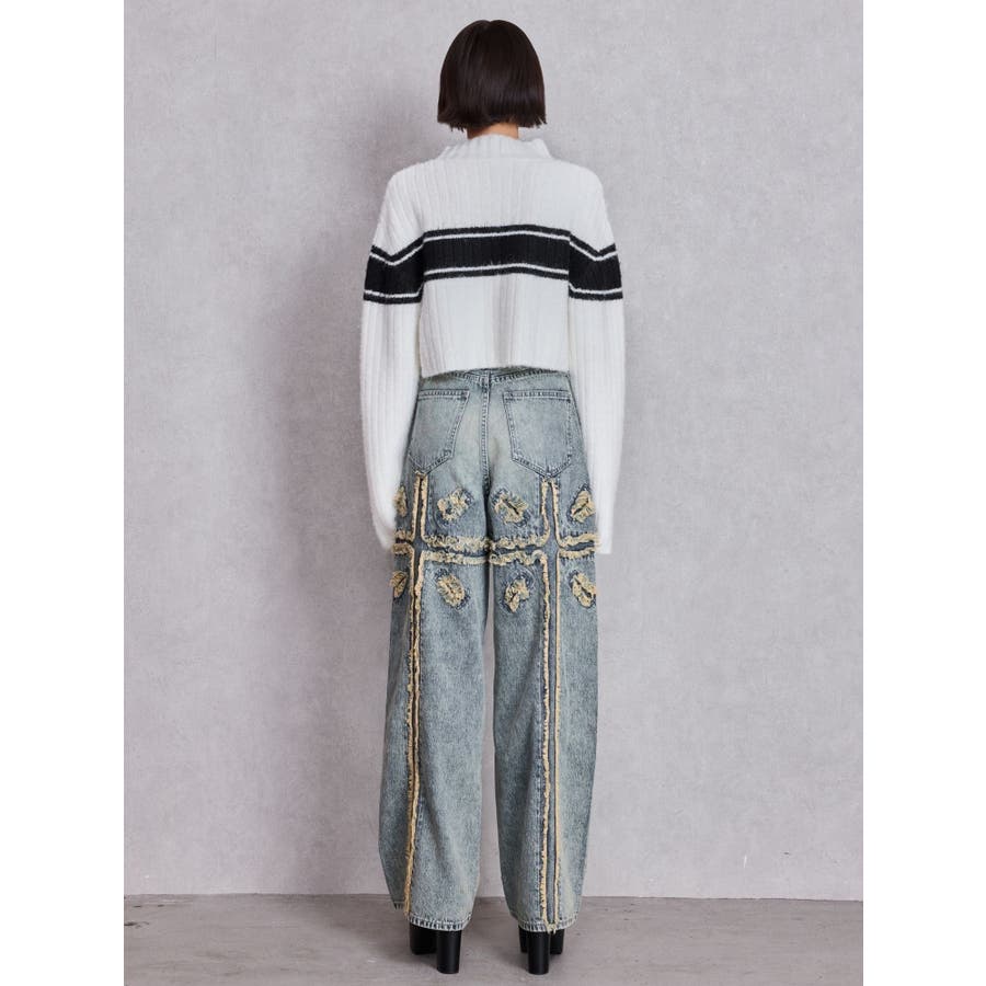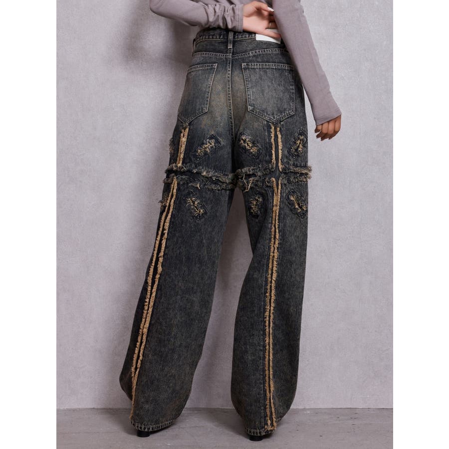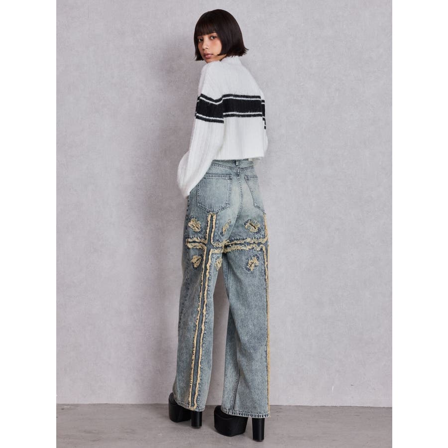 ■デザイン 後ろにクロスモチーフを大胆に施し、唯一無二の存在感を演出。 カジュアルながらもどこかエッジィな印象で、 後ろ身頃に大胆に施された"クロスポイント"切り替えが、視線を引き寄せるアイキャッチデザインに。 フリンジ加工とダメージ感のあるラフな仕上がりで、こなれたヴィンテージテイスト。 シルエットが崩れにくいデニム生地と、ハイウエストワイドでスタイルアップも叶えてくれる1本。 ■スタイリング フィット感のあるトップスなど、シンプルでコンパクトなアイテム◎ 後ろの存在感を活かして、上半身は引き算するのがポイントです。 ■商品のお気に入り登録 再入荷通知やラスト1点、お得なプライスダウンの情報も受け取ることができます。 ぜひご登録ください◎ ・・・・・・・・・・・・・・・・・・・・・・ ※着用画像はフラッシュの加減で実際の製品と色味等が異なる場合がございますので、生地のズームアップ画像をご確認ください。 ※ご利用の端末画面の設定により実際の商品と色味が異なる場合がございます。
