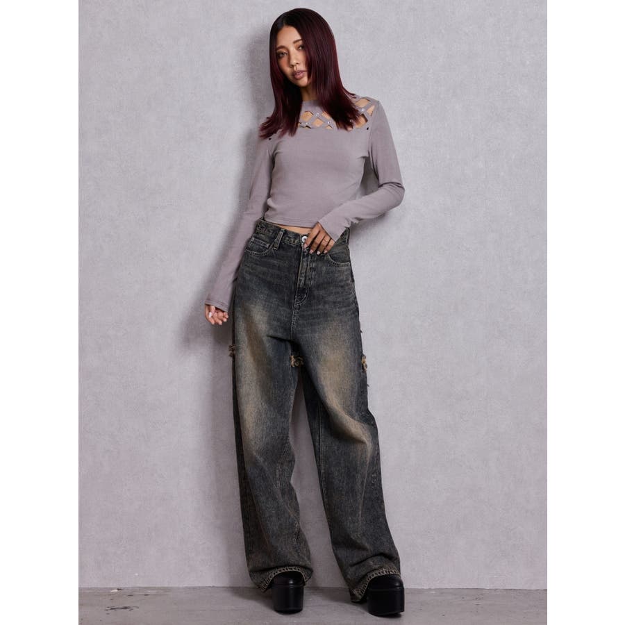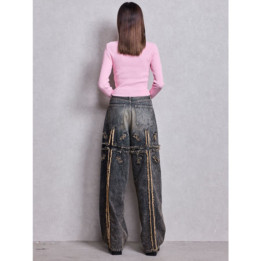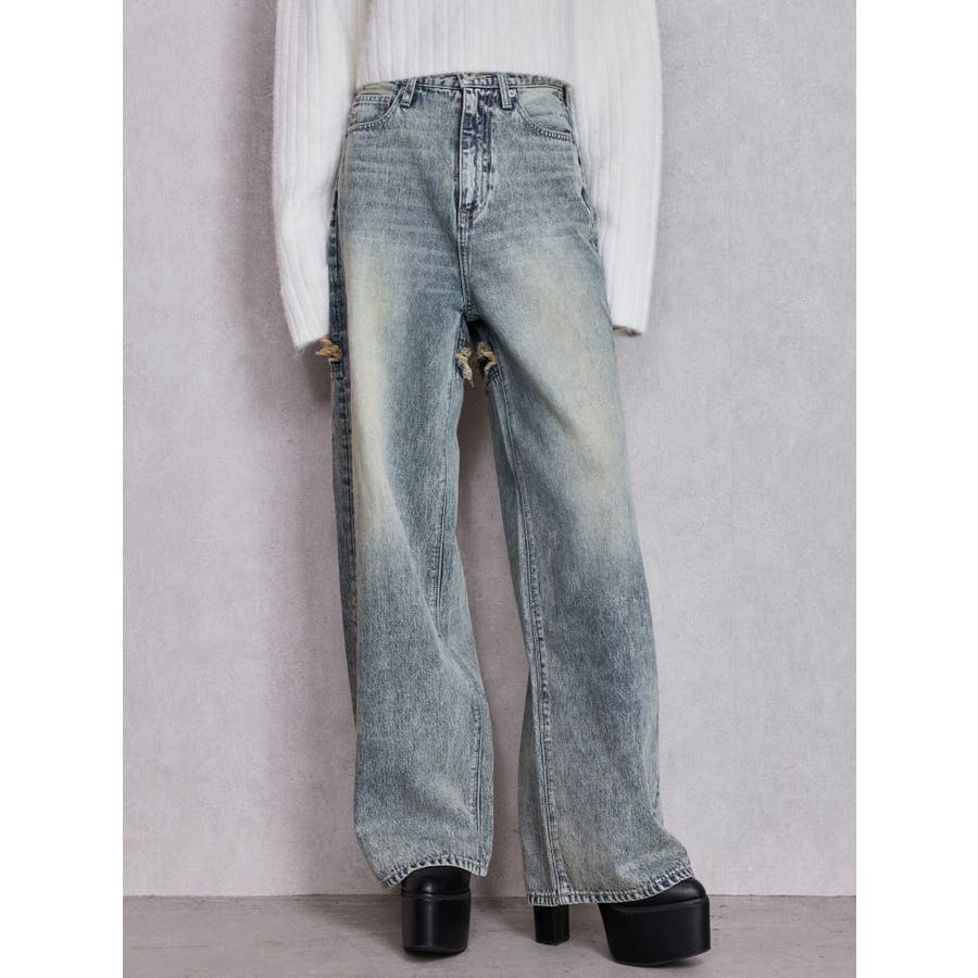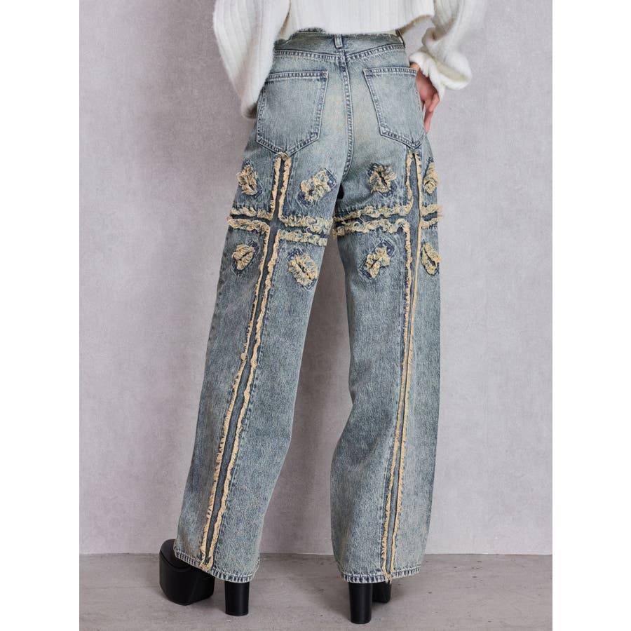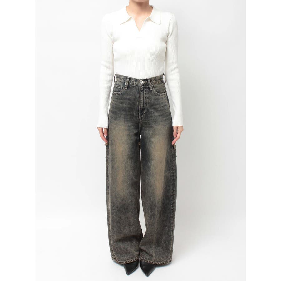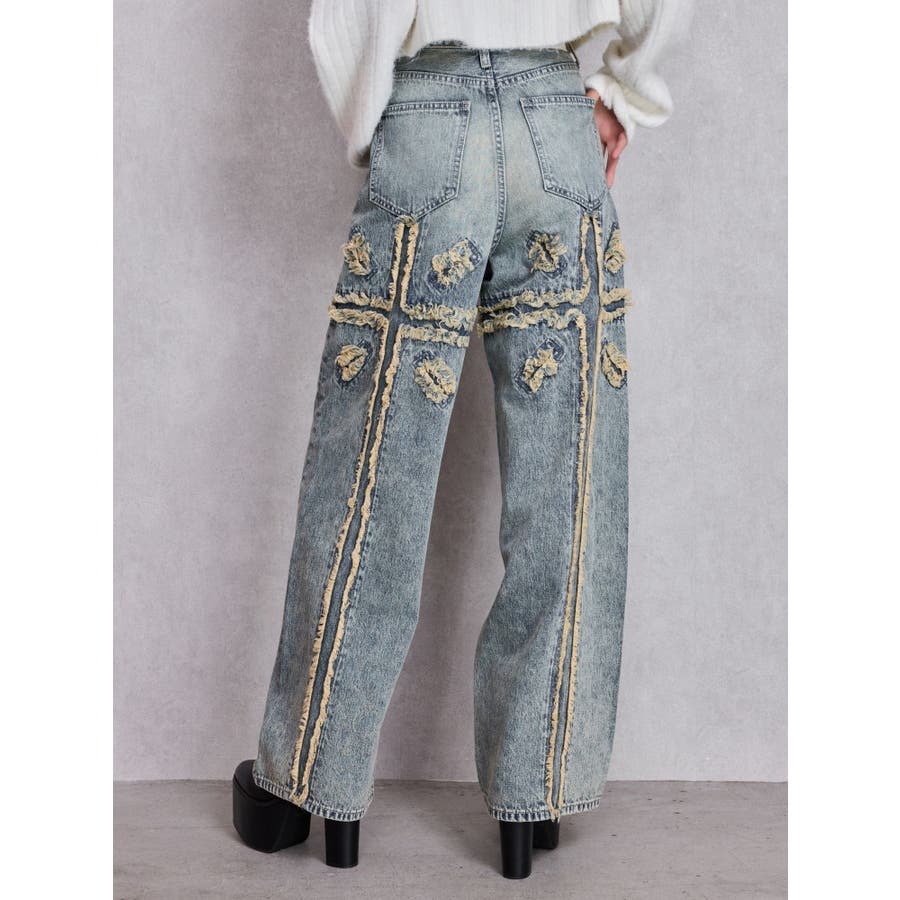 ■デザイン 後ろにクロスモチーフを大胆に施し、唯一無二の存在感を演出。 カジュアルながらもどこかエッジィな印象で、 後ろ身頃に大胆に施された"クロスポイント"切り替えが、視線を引き寄せるアイキャッチデザインに。 フリンジ加工とダメージ感のあるラフな仕上がりで、こなれたヴィンテージテイスト。 シルエットが崩れにくいデニム生地と、ハイウエストワイドでスタイルアップも叶えてくれる1本。 ■スタイリング フィット感のあるトップスなど、シンプルでコンパクトなアイテム◎ 後ろの存在感を活かして、上半身は引き算するのがポイントです。 ■商品のお気に入り登録 再入荷通知やラスト1点、お得なプライスダウンの情報も受け取ることができます。 ぜひご登録ください◎ ・・・・・・・・・・・・・・・・・・・・・・ ※着用画像はフラッシュの加減で実際の製品と色味等が異なる場合がございますので、生地のズームアップ画像をご確認ください。 ※ご利用の端末画面の設定により実際の商品と色味が異なる場合がございます。