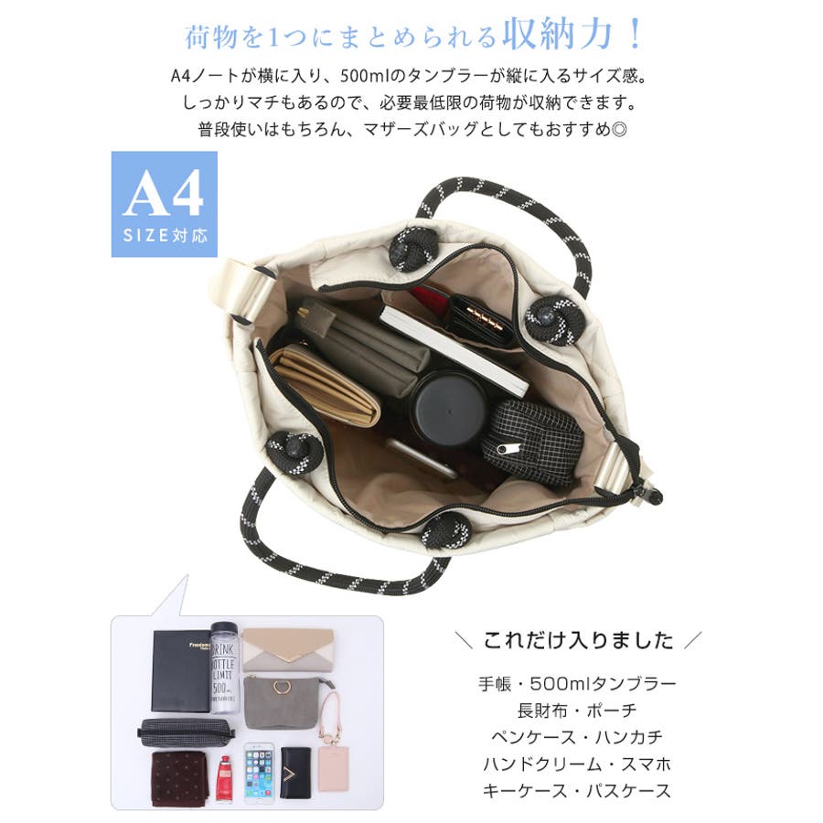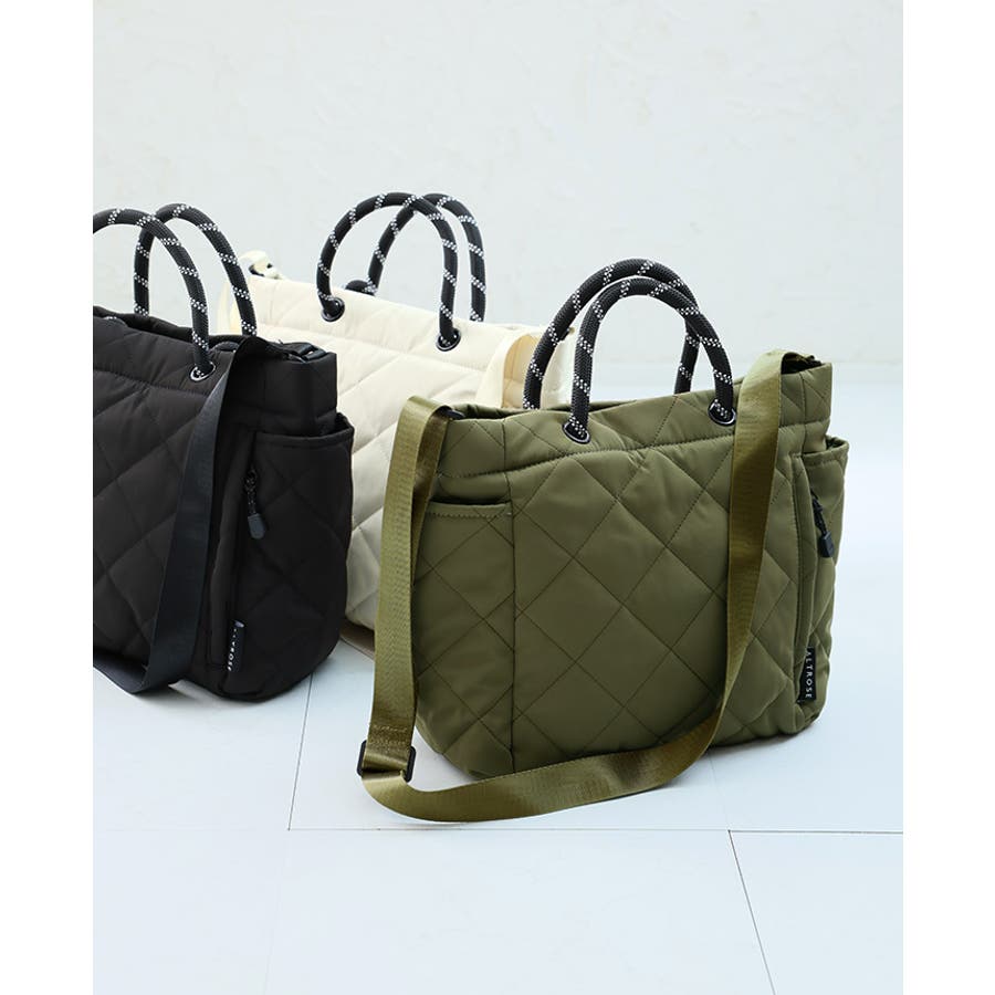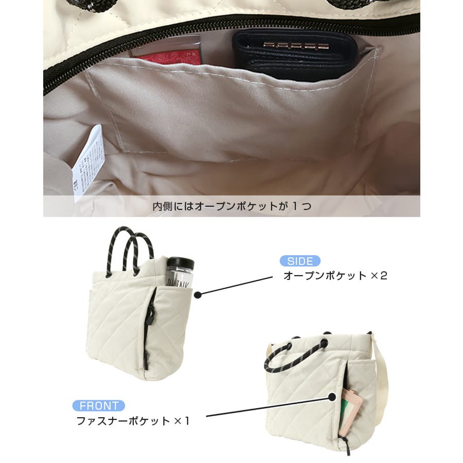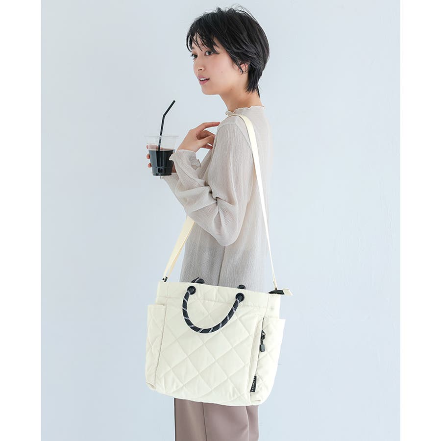 『大人のカジュアルライク。』ロープハンドルがアクセントの、2WAYキルティングトートバッグ。A4サイズのノートが横に入るサイズ感で、マチが広いので大容量◎ポケットが4つあるので小物整理にも便利。ショルダーストラップは幅が広く柔らかいので、肩の負担を軽減してくれます。普段使いにはもちろん、マザーズバッグとしてもおすすめです。