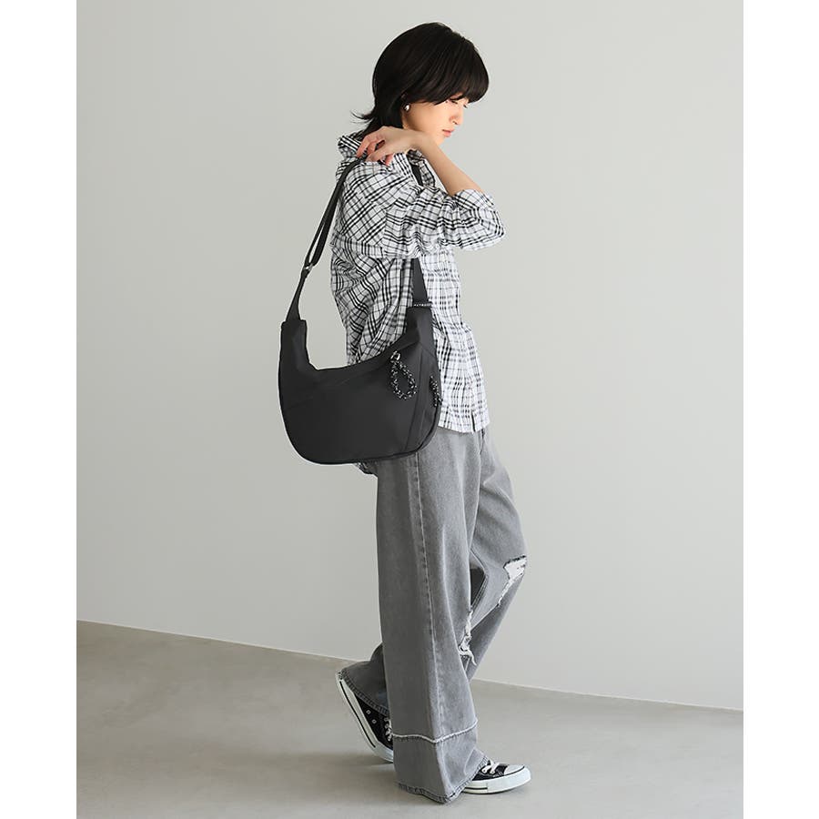 流行りのチャームが付いた、持ちやすいデザインのショルダーバッグ。
