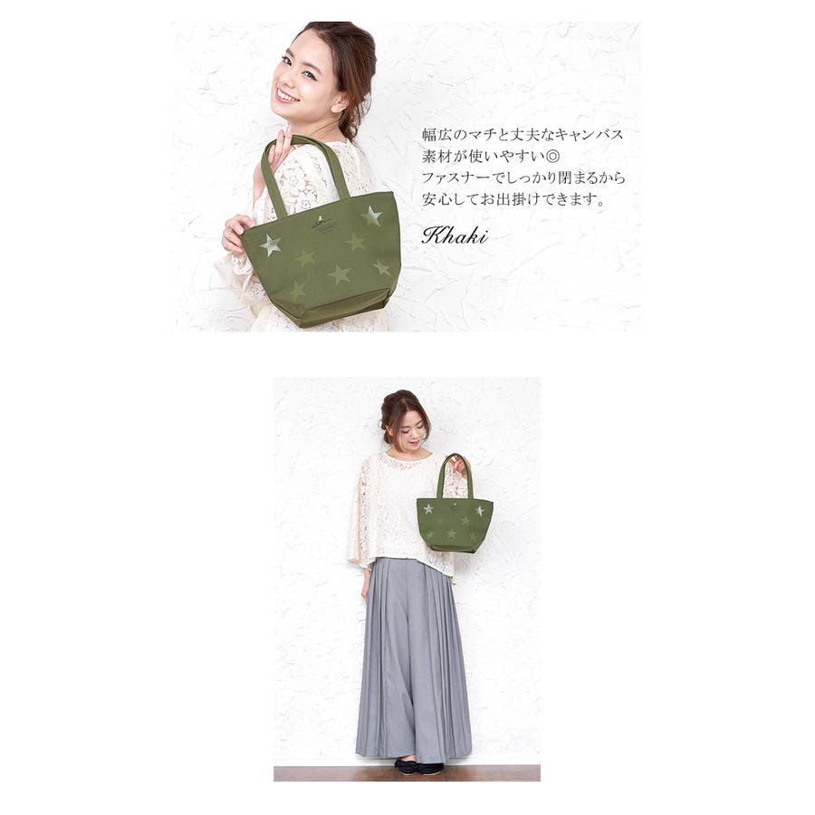 表側に星のプリントを施したトートバッグ。同系色の光沢のあるプリントで、主張し過ぎず気軽に持てるデザイン。マチがしっかりあり、見た目以上に荷物が入ります。厚みのあるキャンバス地は、デイリー使いにピッタリ。内側はファスナー付きだから、お出掛け時にも安心。程良い存在感を発揮してくれるバッグです。
