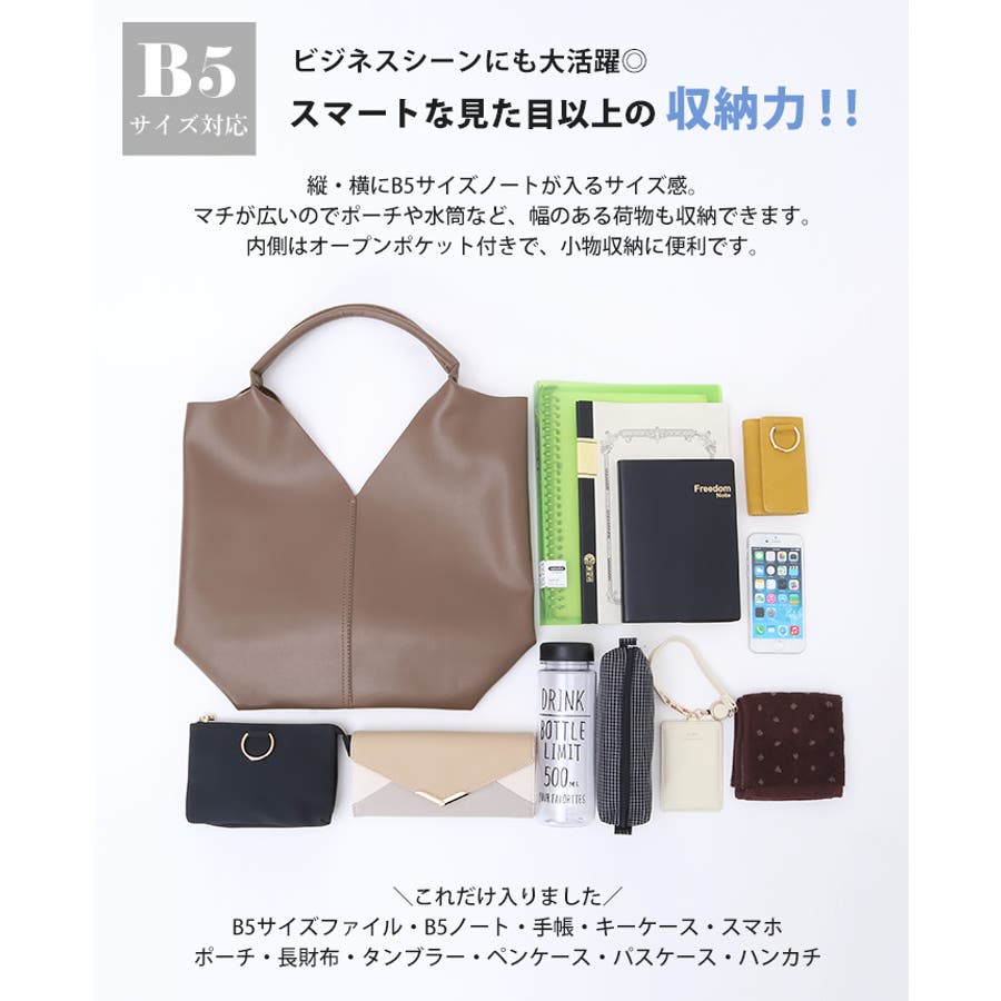 B5サイズノートが縦・横に入り、マチが広いので幅のある荷物も入れられます。