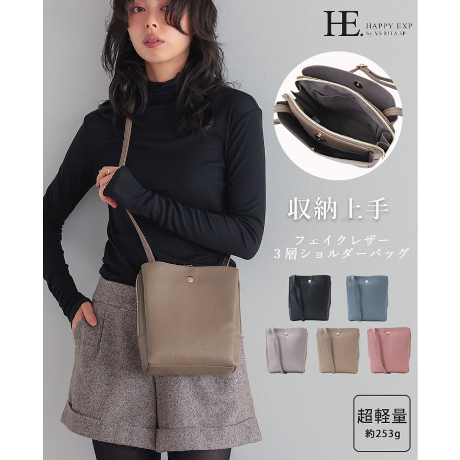 毎日使いたくなる丁度良いバッグ。フェイクレザー3層軽量ショルダーバッグ ショルダ…