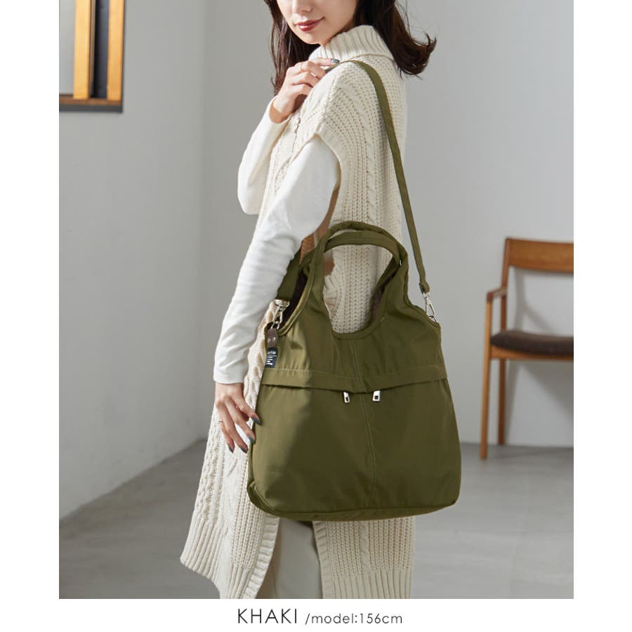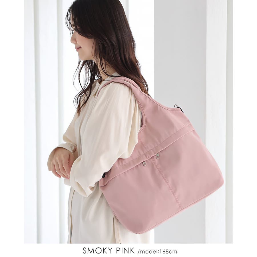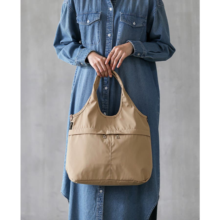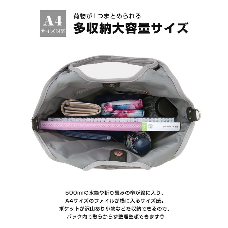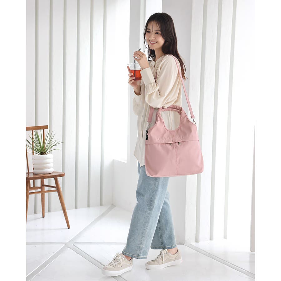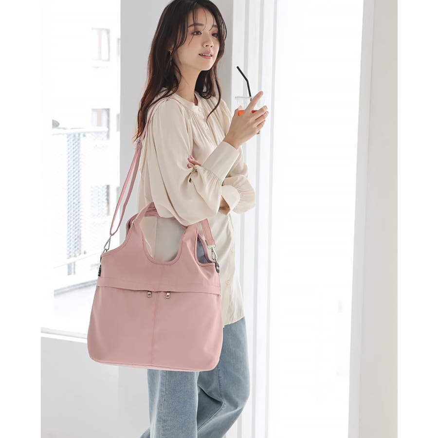 『女性らしいコーデに馴染む、機能性バッグ。』高密度ポリエステル生地を使用した、軽量の2WAYデザイン。A4サイズのファイルが横に入り、水筒や折り畳み傘が縦に入るサイズ感。マチもしっかりあり、荷物を1つにまとめられる大容量。10ポケット付きで、小物の整理がしやすいのもポイント。通勤・通学はもちろん、デイリー使いにもおすすめです。