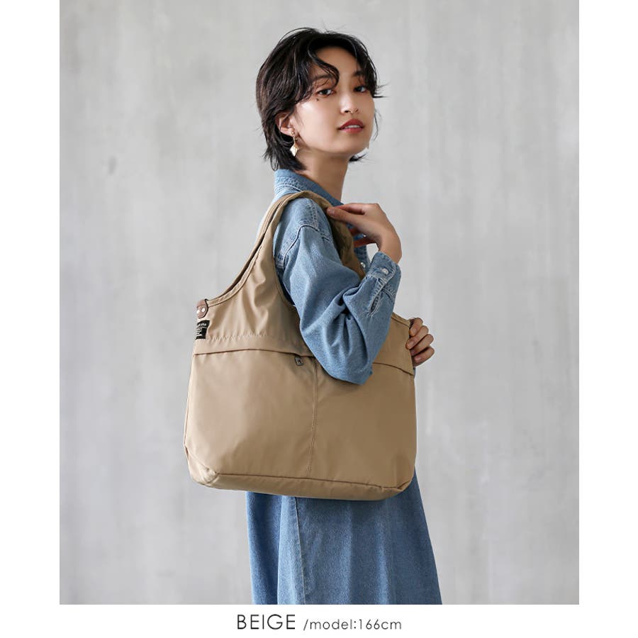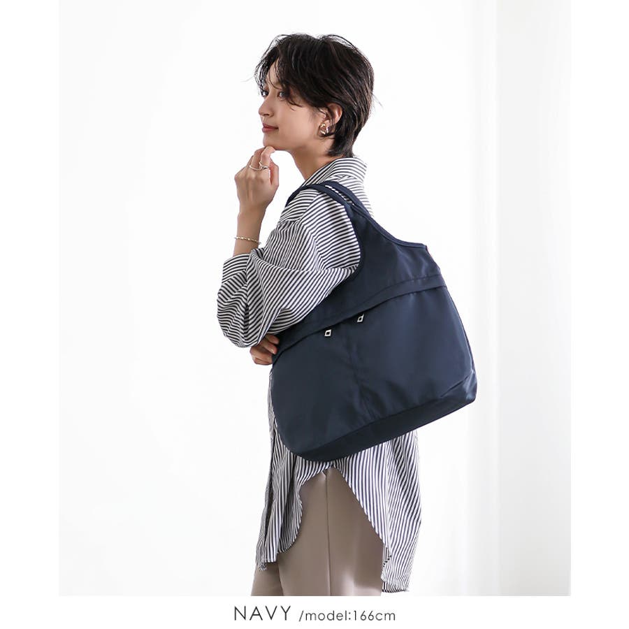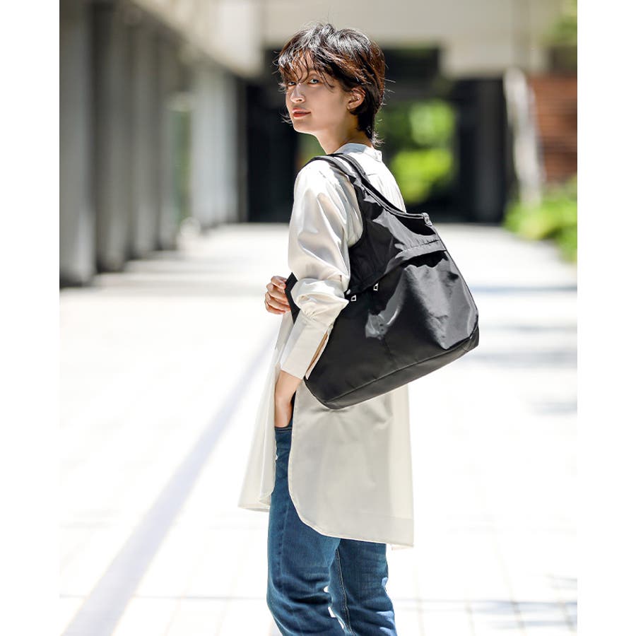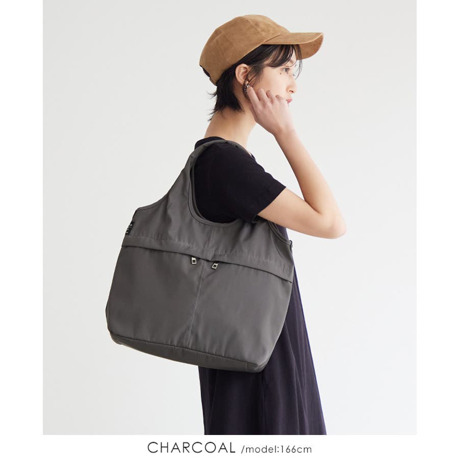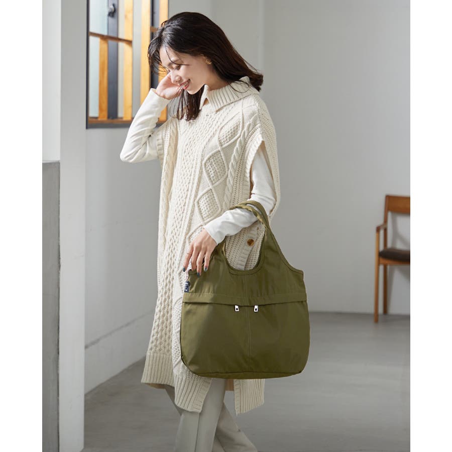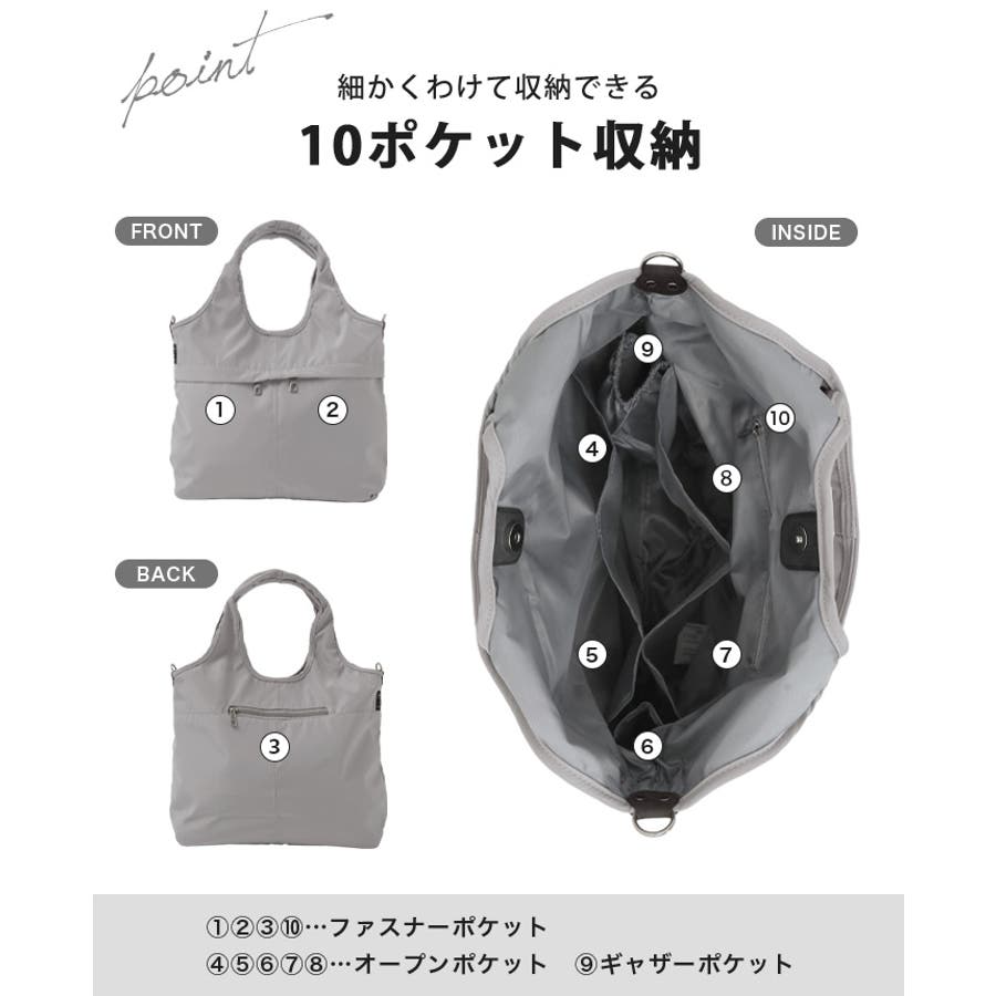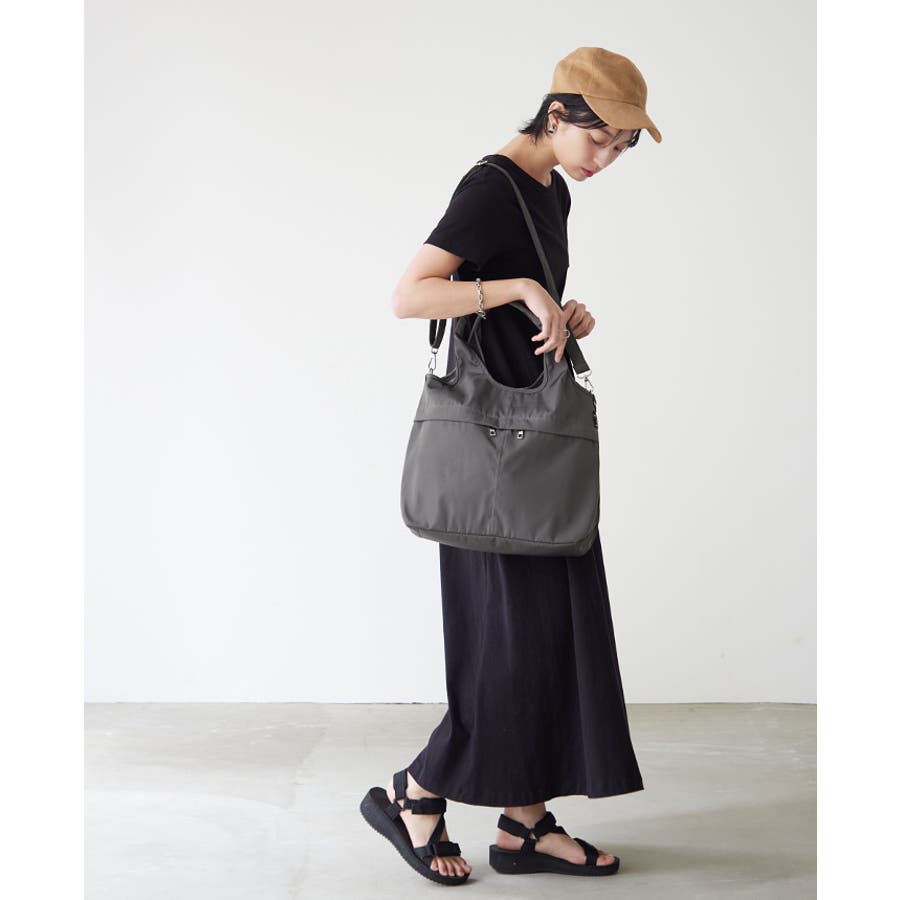 『女性らしいコーデに馴染む、機能性バッグ。』高密度ポリエステル生地を使用した、軽量の2WAYデザイン。A4サイズのファイルが横に入り、水筒や折り畳み傘が縦に入るサイズ感。マチもしっかりあり、荷物を1つにまとめられる大容量。10ポケット付きで、小物の整理がしやすいのもポイント。通勤・通学はもちろん、デイリー使いにもおすすめです。