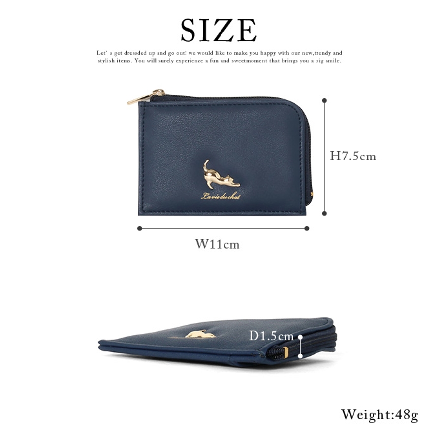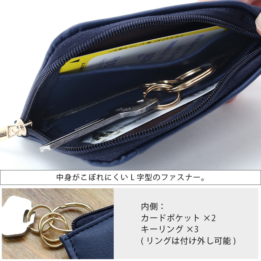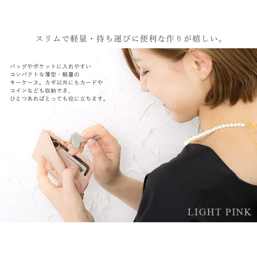 上品にきらりと輝くネコモチーフのキーケース。さらりと手に馴染むマットな質感のフェイクレザーを使用しました。バッグやポケットからさっと取り出せる、薄型・軽量のコンパクトなサイズ感。鍵以外にもカード類やコインが収納できます。ひとつにまとめて持ち運べる便利なアイテムです。