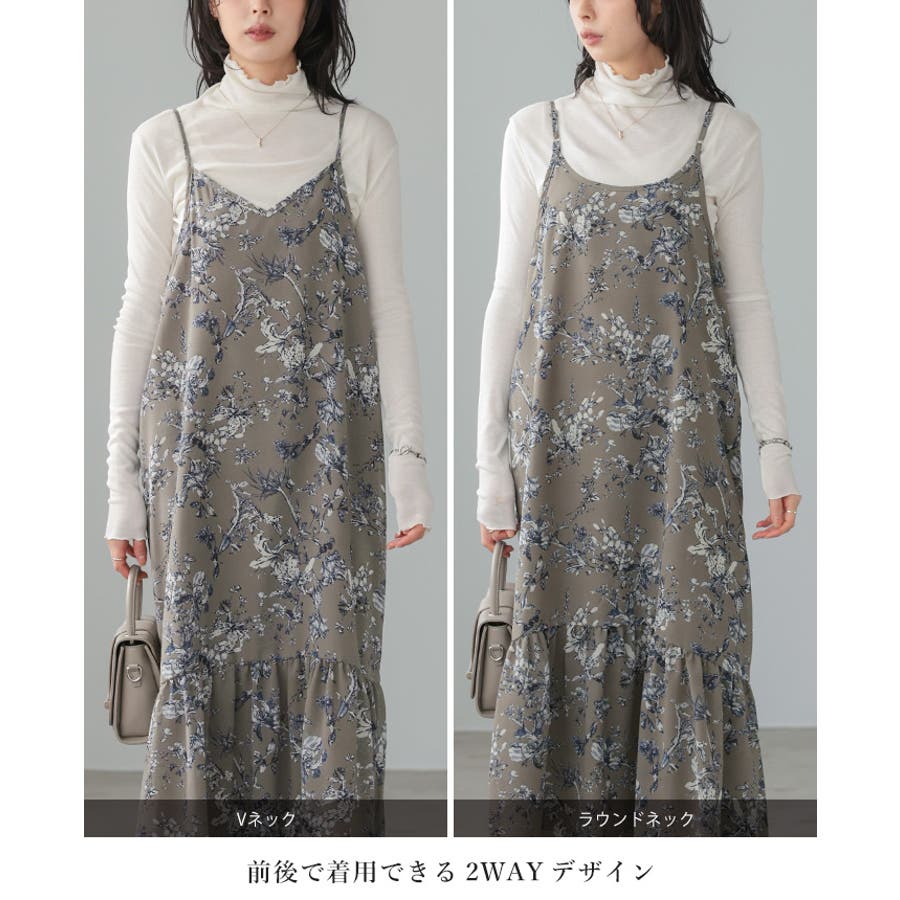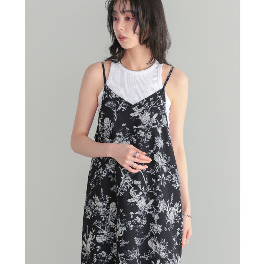 シックな花柄をプリントした、ロング丈のキャミワンピ。