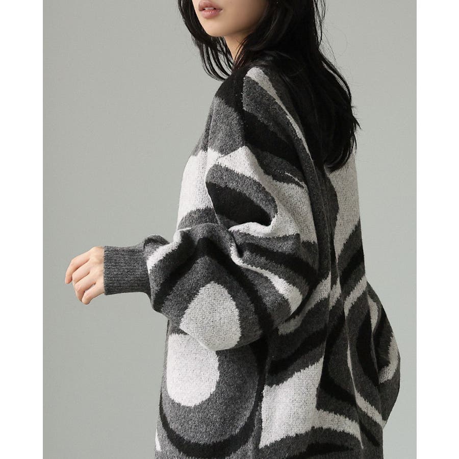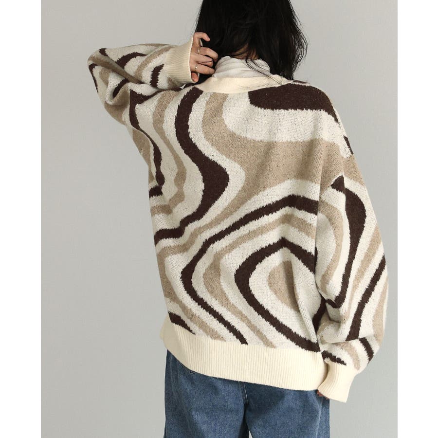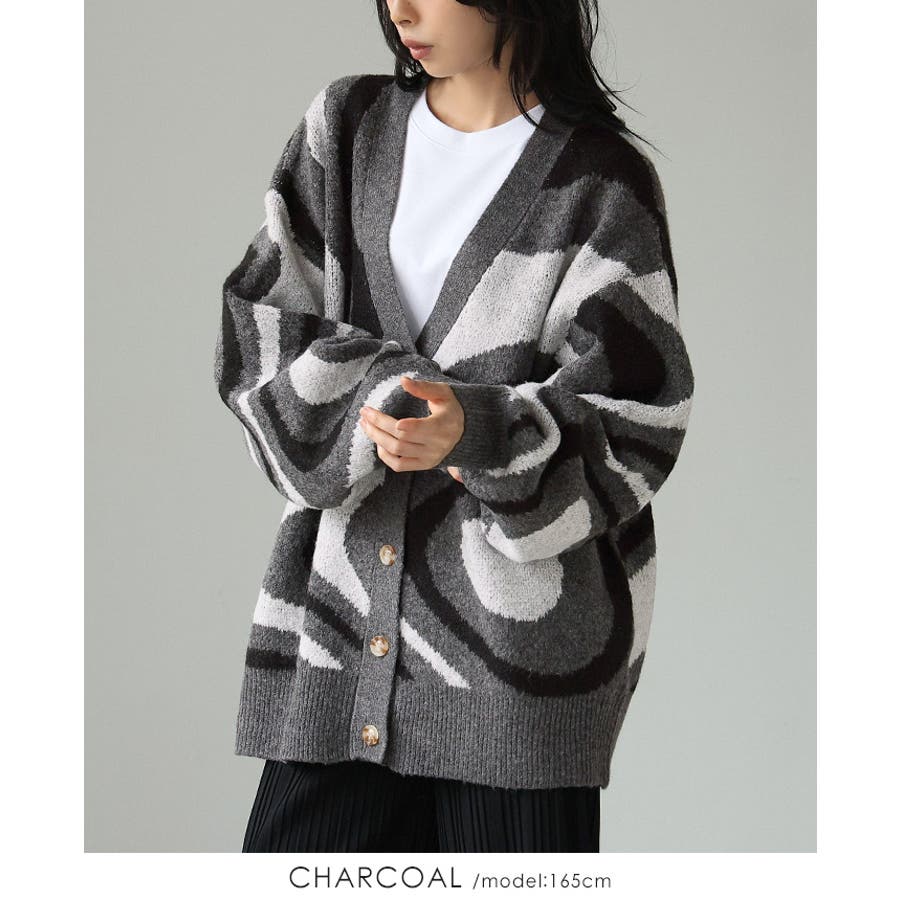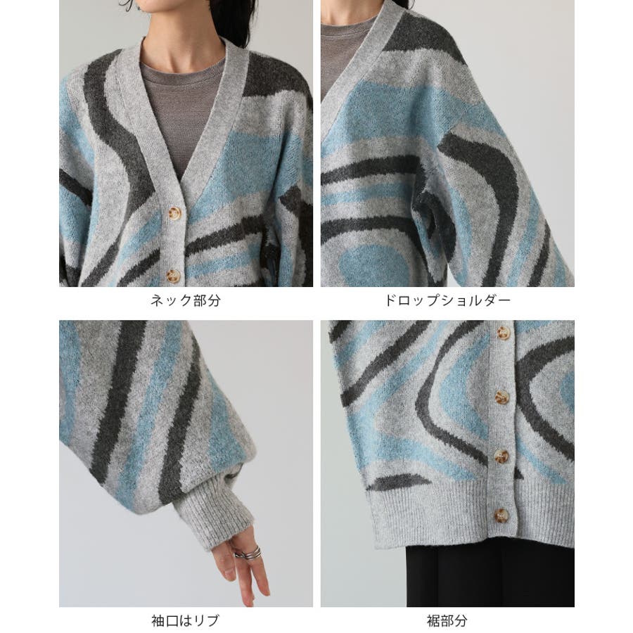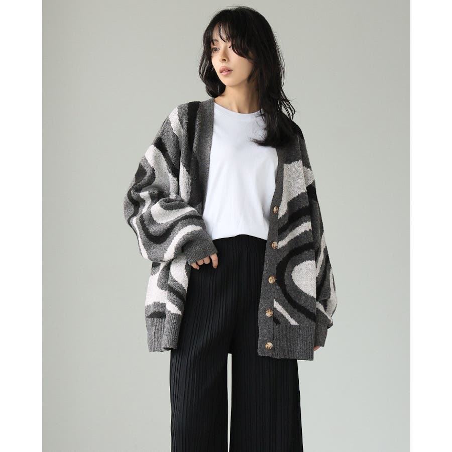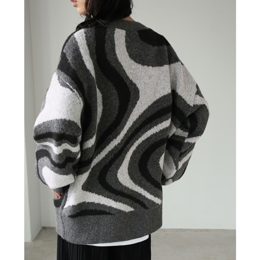 全体的に編み込んだ大きなマーブル模様が印象的なカーディガン。