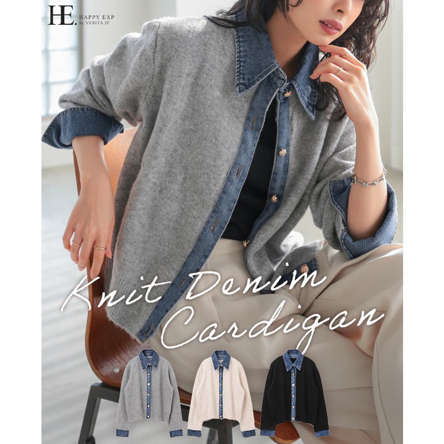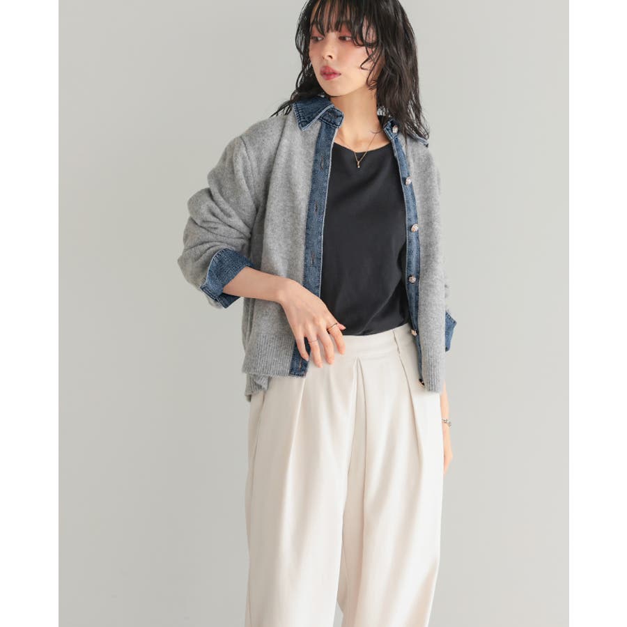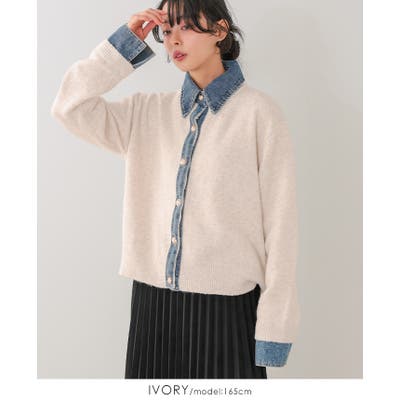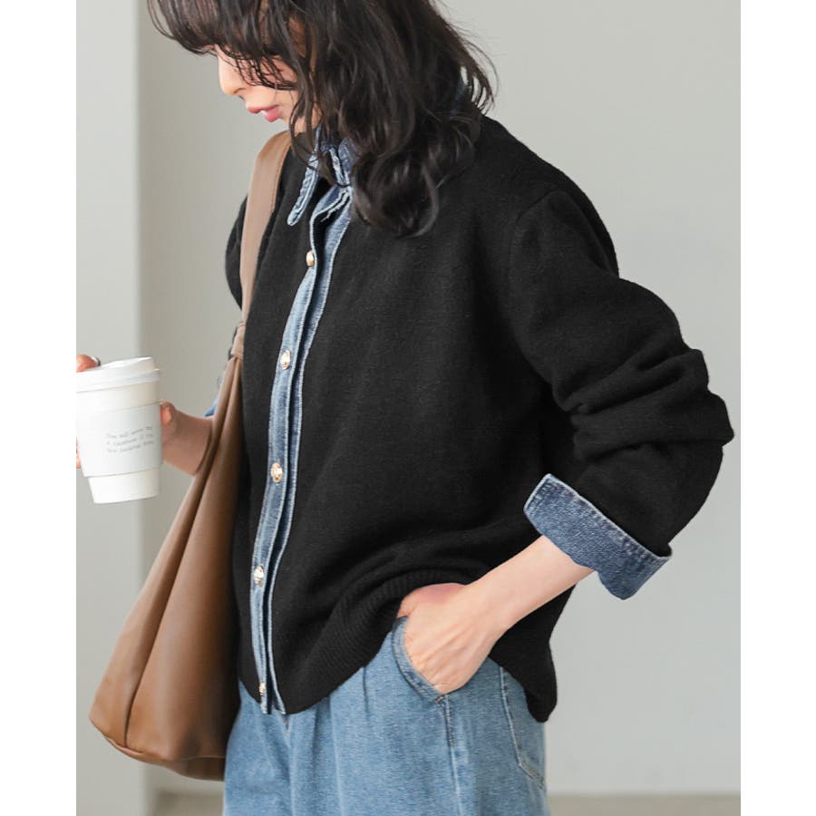 柔らかニットにデニムでカジュアルダウン。デニムMIXニットカーディガン カーデ