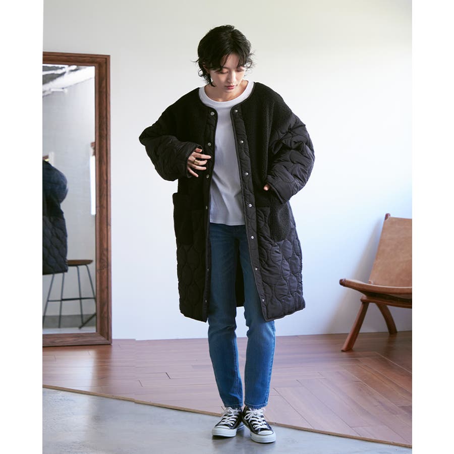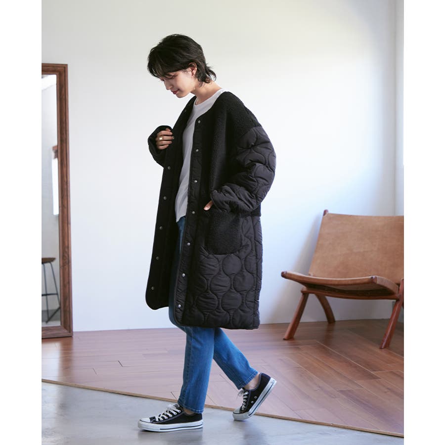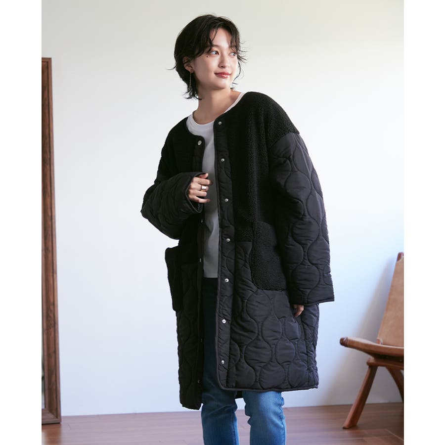 『気軽に着れる、大人のカジュアルアウター。』ボアとキルトを組み合わせた異素材のコート。丸みのあるひょうたんキルトで、女性らしい柔らかな印象に。大きなボアポケットが甘さを引き出してくれます。軽くて暖かく、デイリーユースにピッタリ。寒い日も安心の、冬のあったかアイテムです。