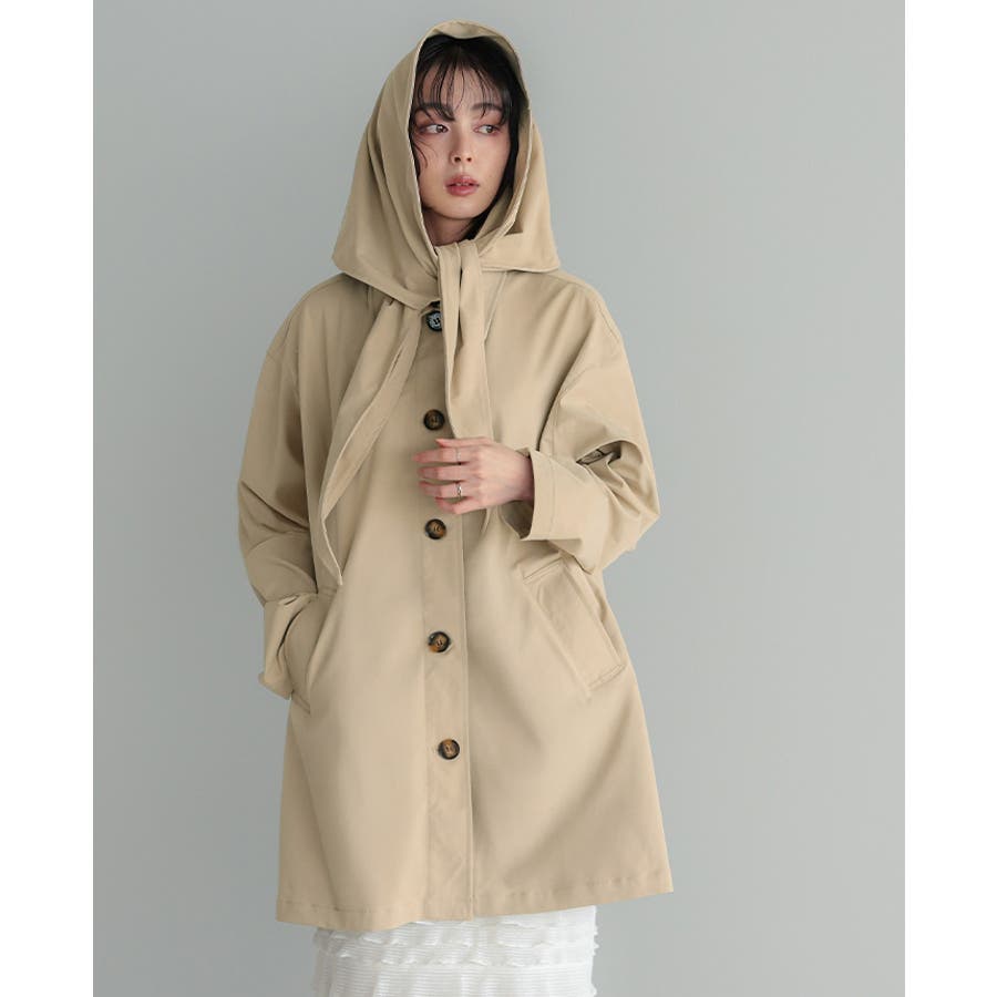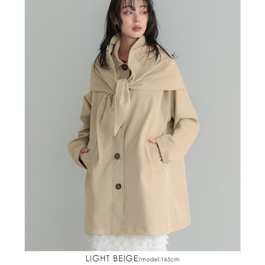 シンプルなステンカラーコートに、同素材のスカーフが付いたデザイン。