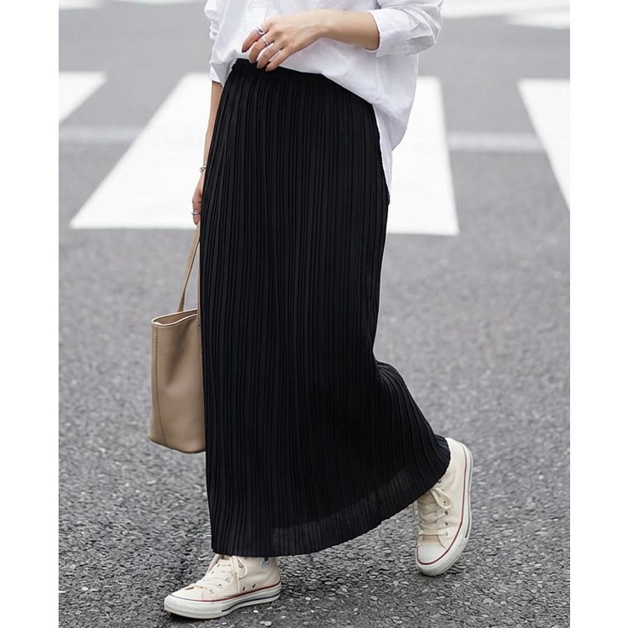 伸縮性があり動きやすい、ランダムプリーツのロングスカート。