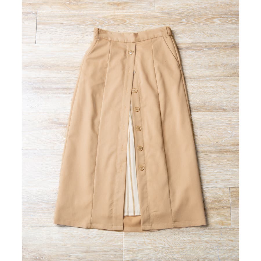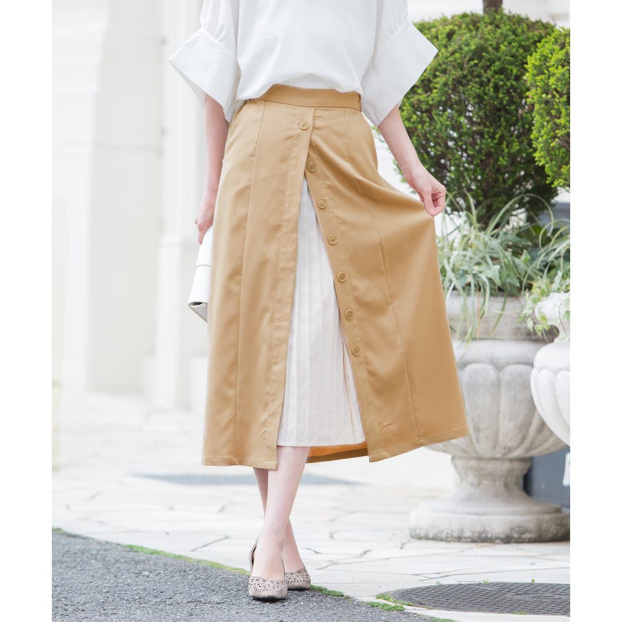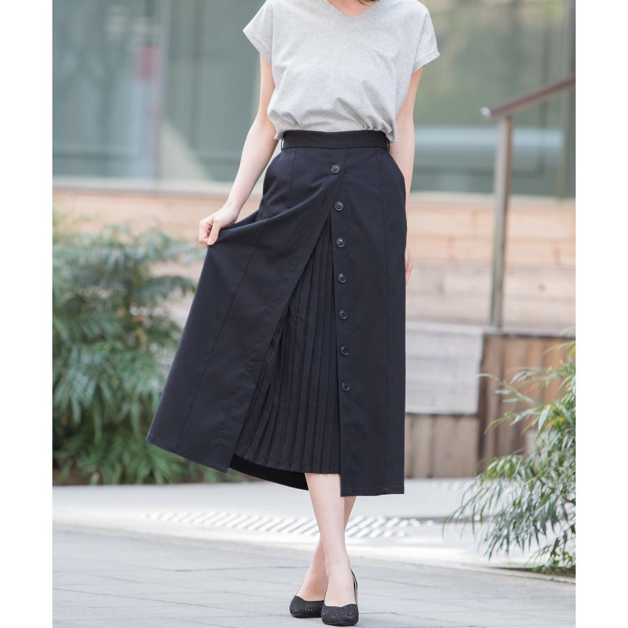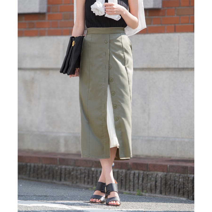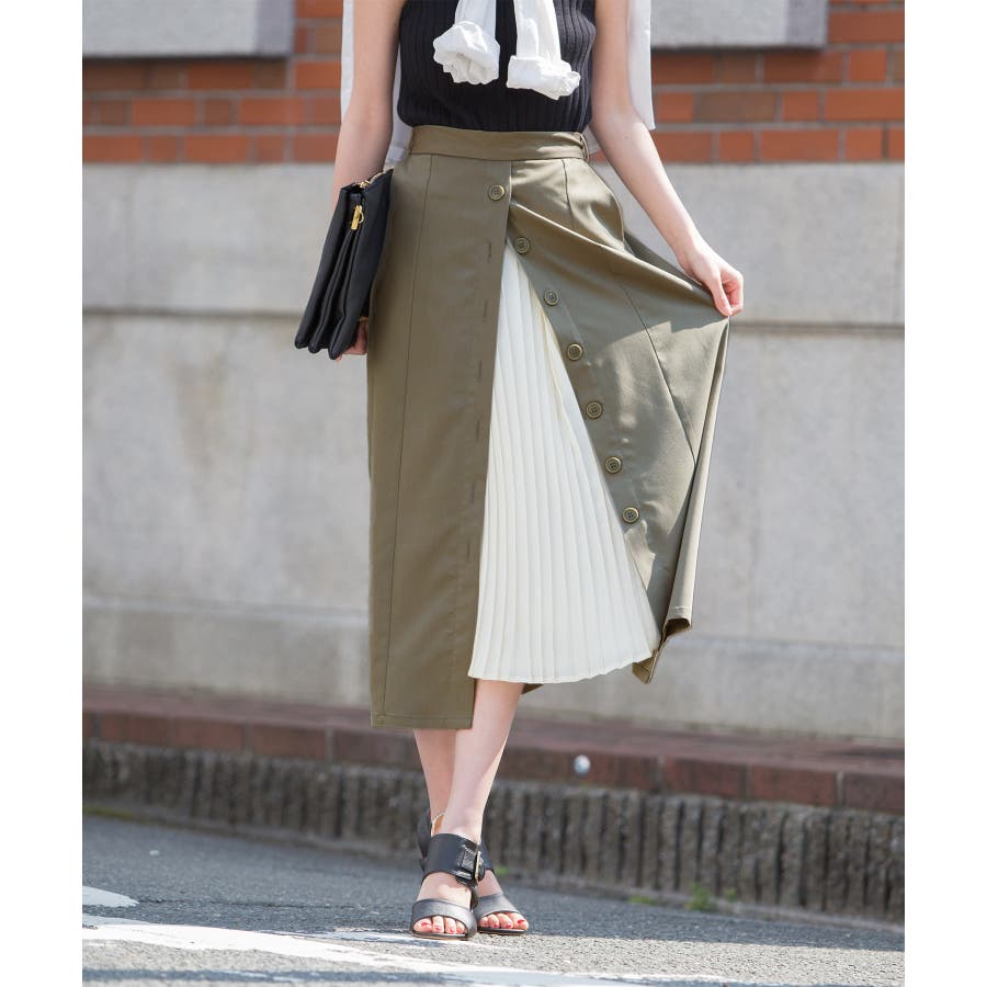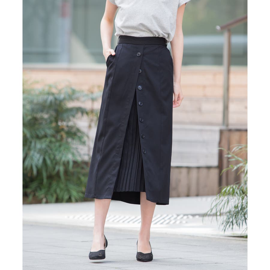 『女性らしさ高まる異素材使い。』縦長シルエットのスカートから、ちらりと見えるプリーツが印象的なデザイン。フロントにボタンを付け、計算されたシルエットに仕上がりました。表地はしっかりとしたツイル、プリーツは薄手の生地で美しく。大人女子にピッタリなアイテムです。