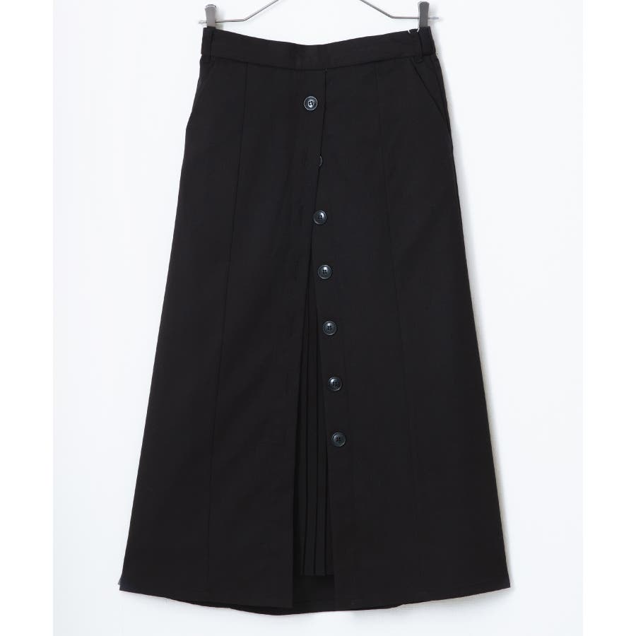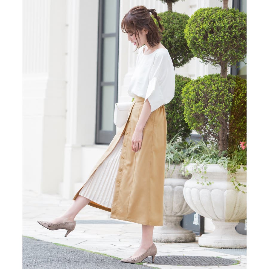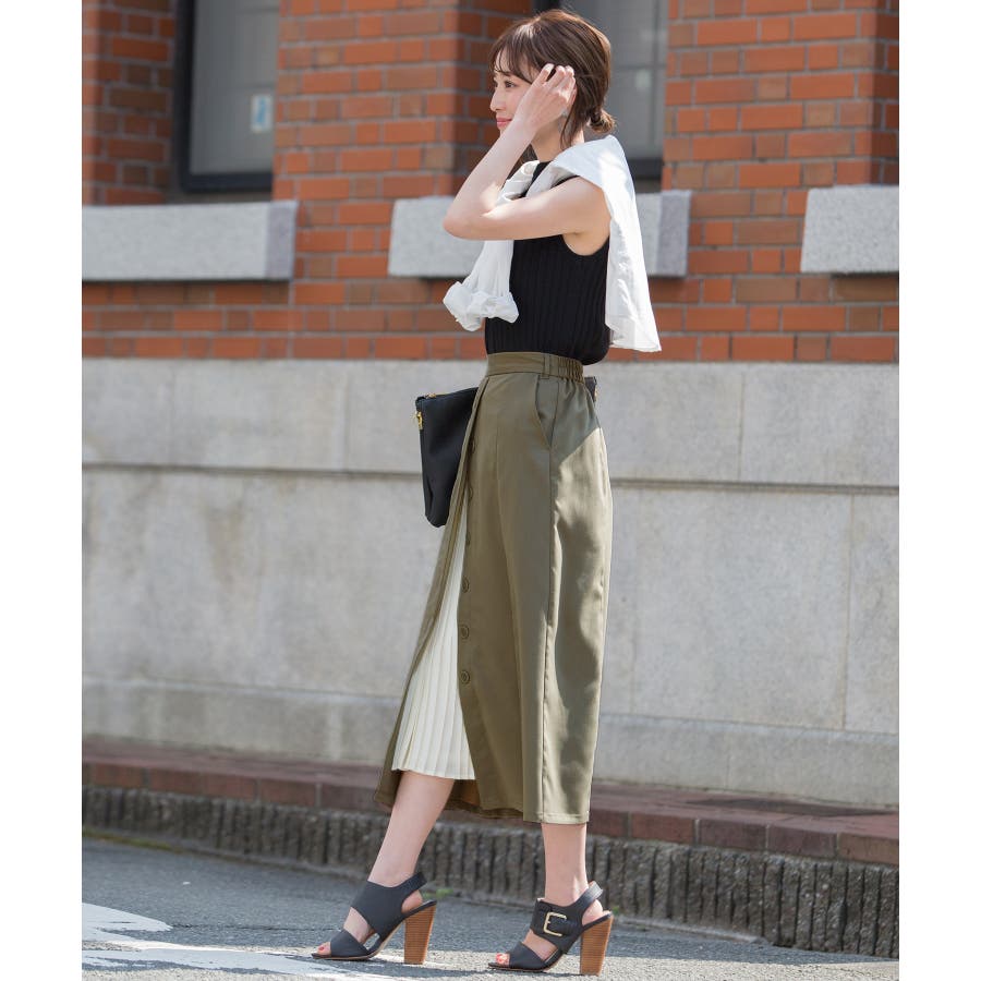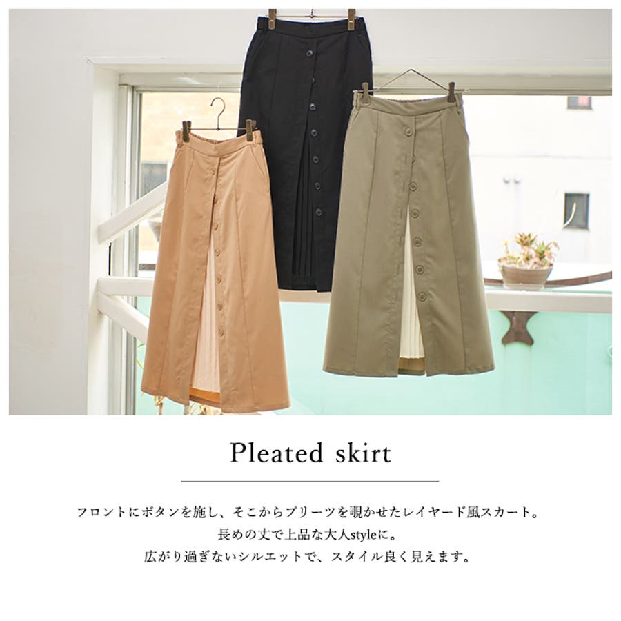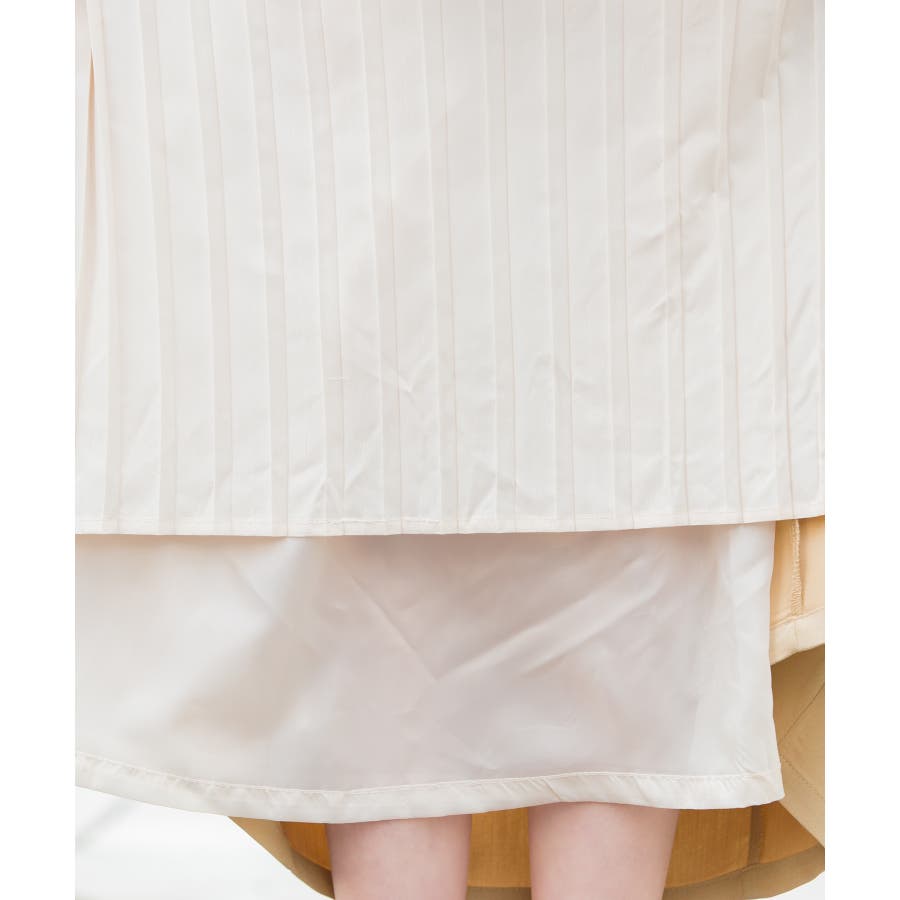 『女性らしさ高まる異素材使い。』縦長シルエットのスカートから、ちらりと見えるプリーツが印象的なデザイン。フロントにボタンを付け、計算されたシルエットに仕上がりました。表地はしっかりとしたツイル、プリーツは薄手の生地で美しく。大人女子にピッタリなアイテムです。