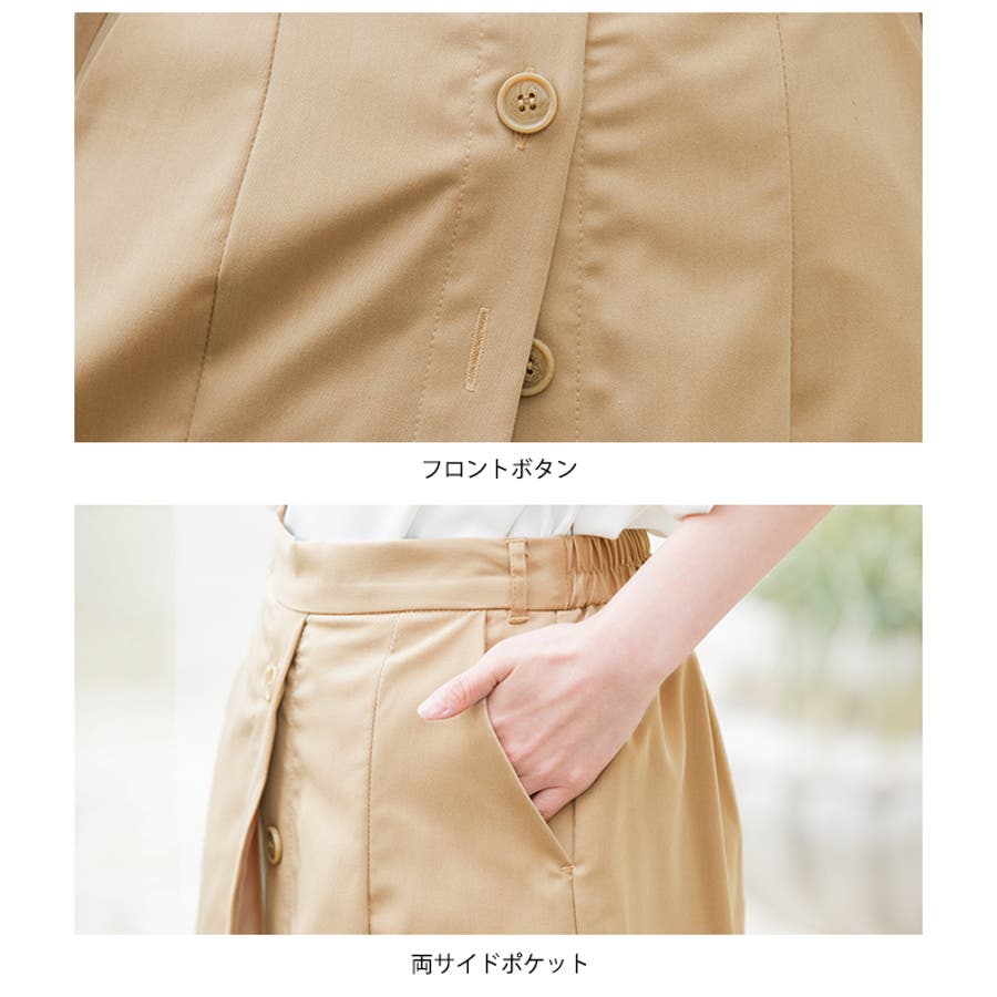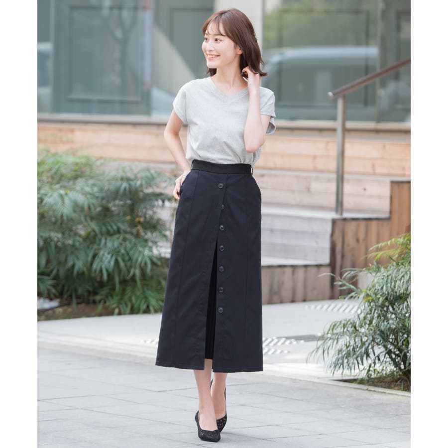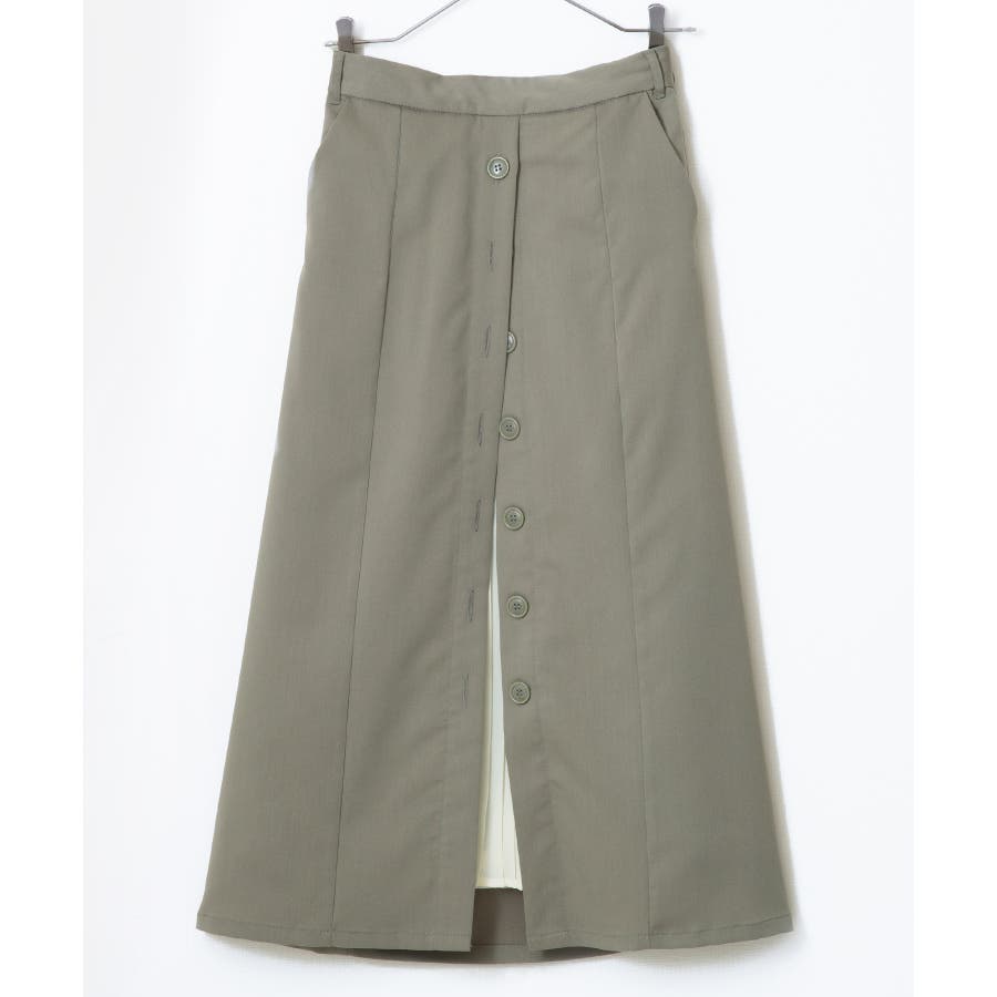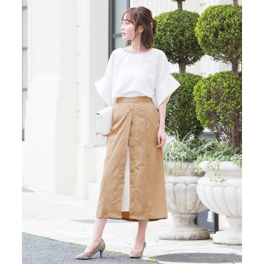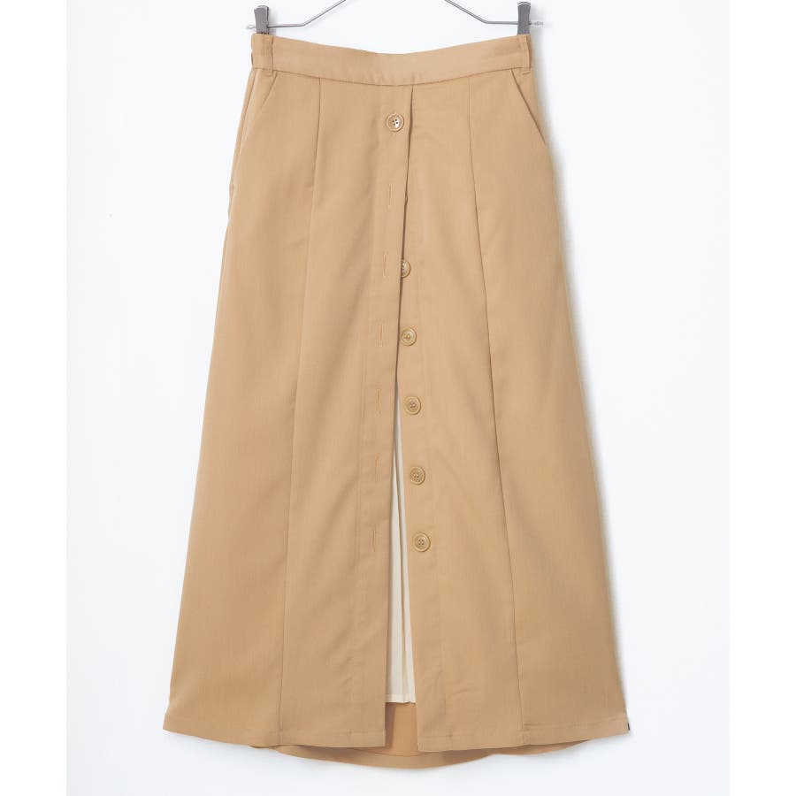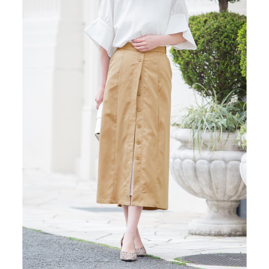 『女性らしさ高まる異素材使い。』縦長シルエットのスカートから、ちらりと見えるプリーツが印象的なデザイン。フロントにボタンを付け、計算されたシルエットに仕上がりました。表地はしっかりとしたツイル、プリーツは薄手の生地で美しく。大人女子にピッタリなアイテムです。