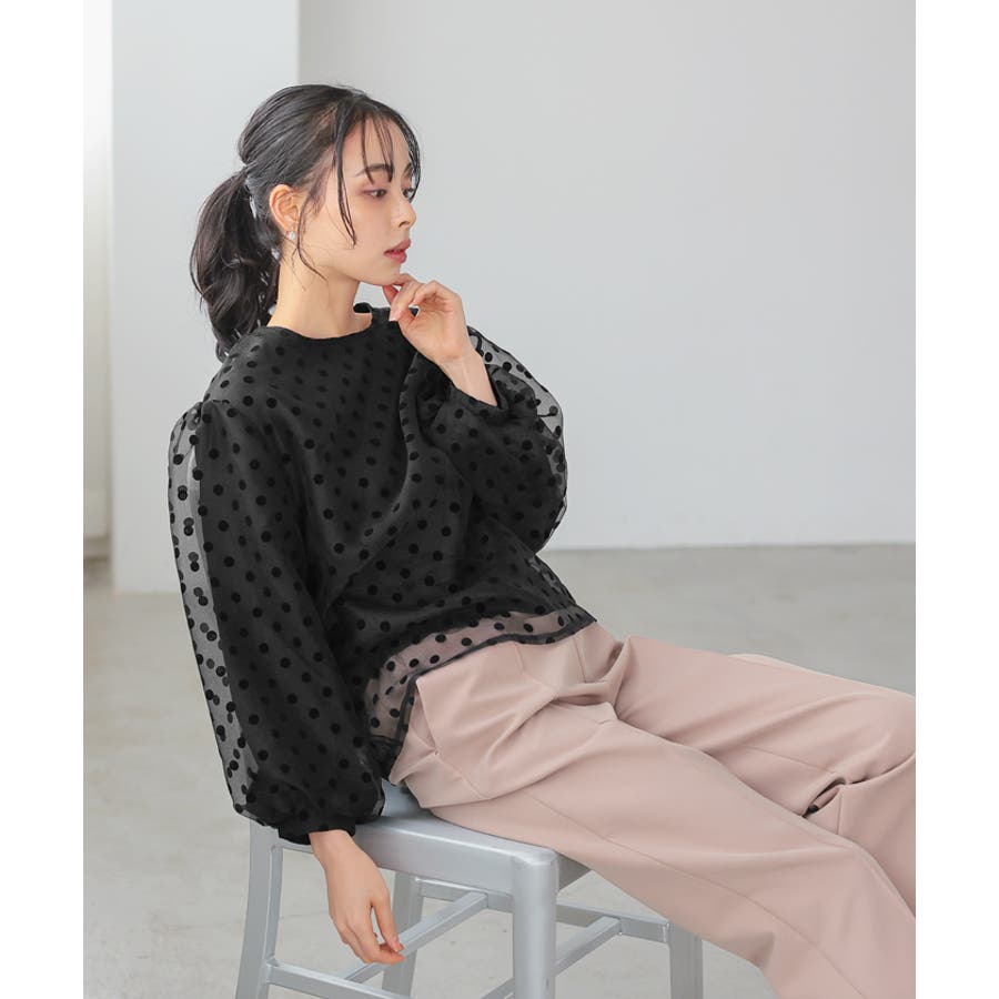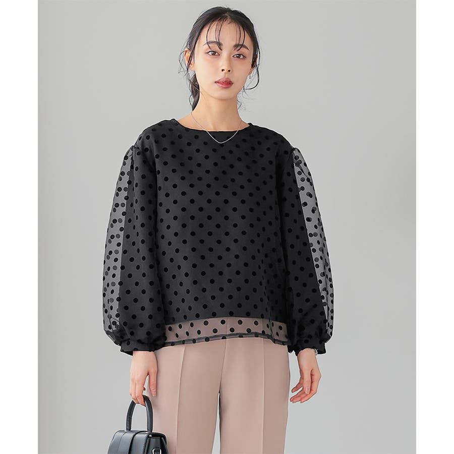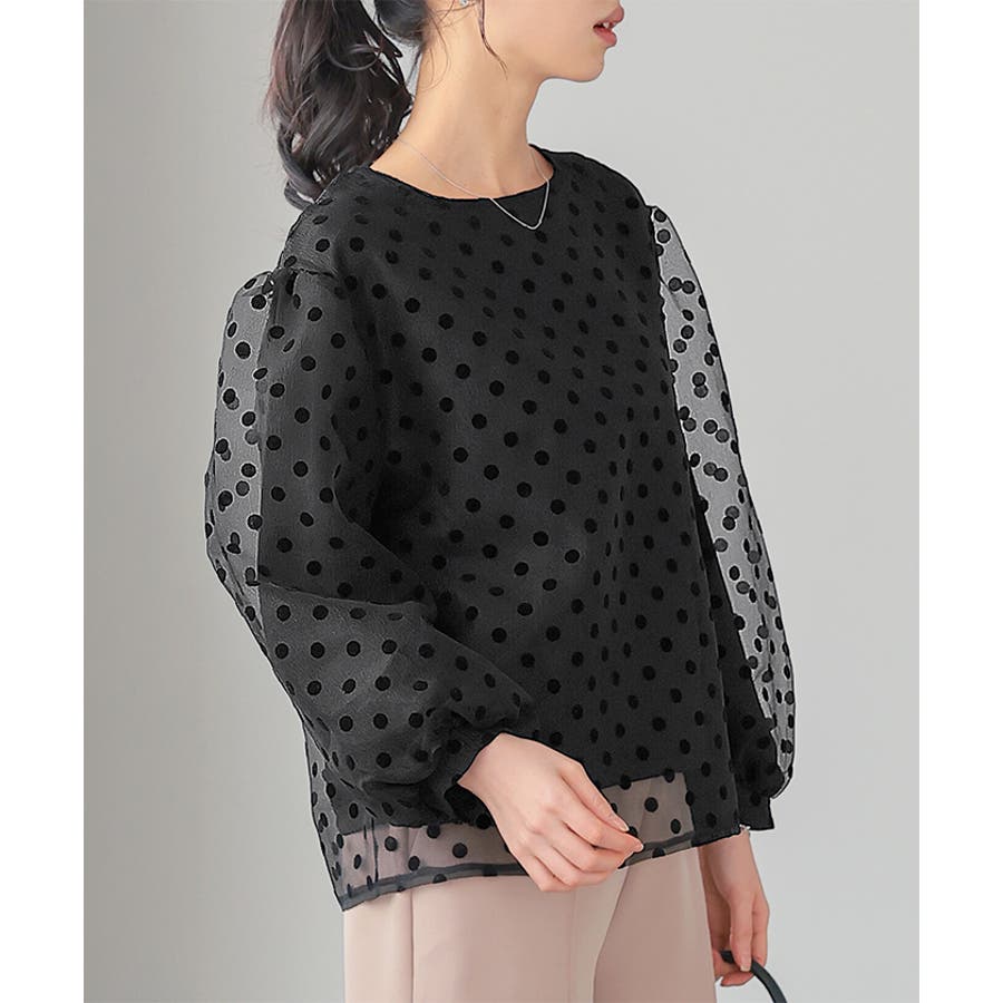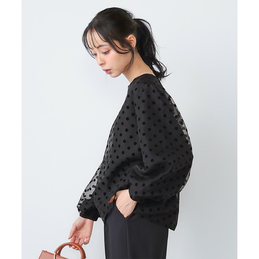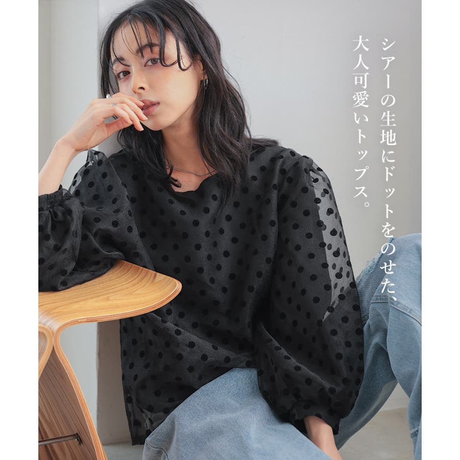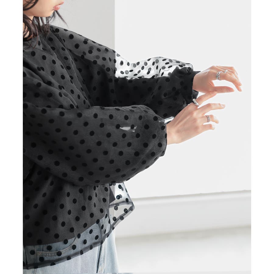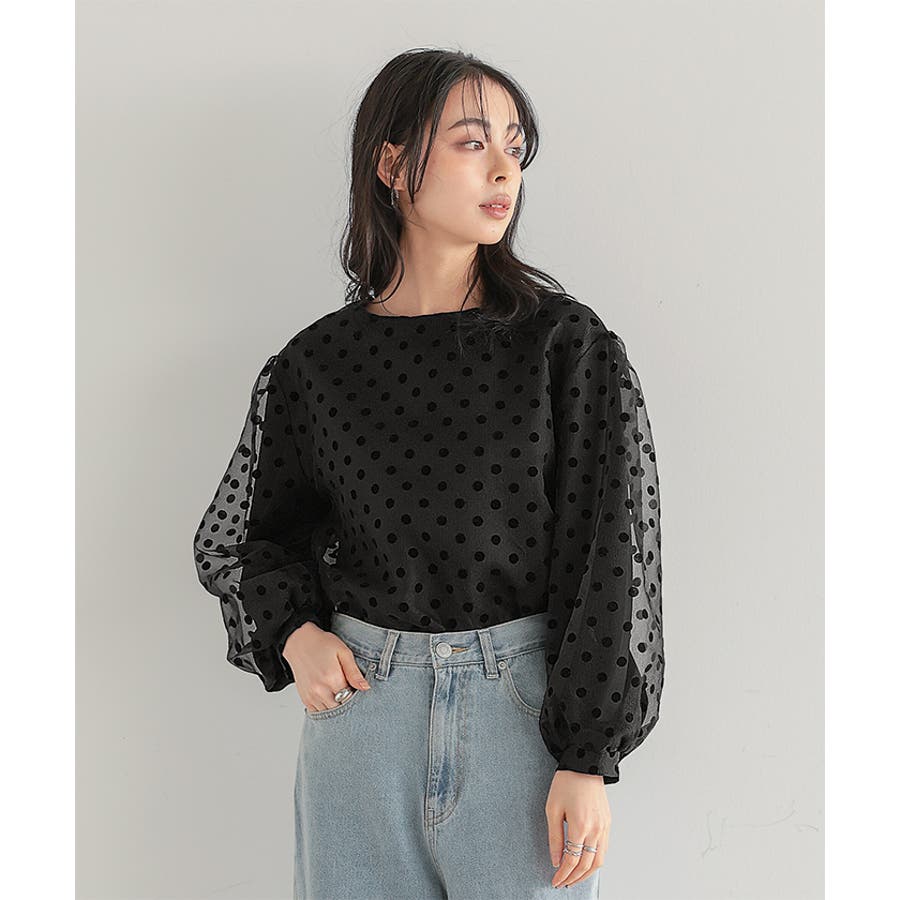 エアリーなシアー生地に、フロッキーのドット柄をプリントしたトップス。