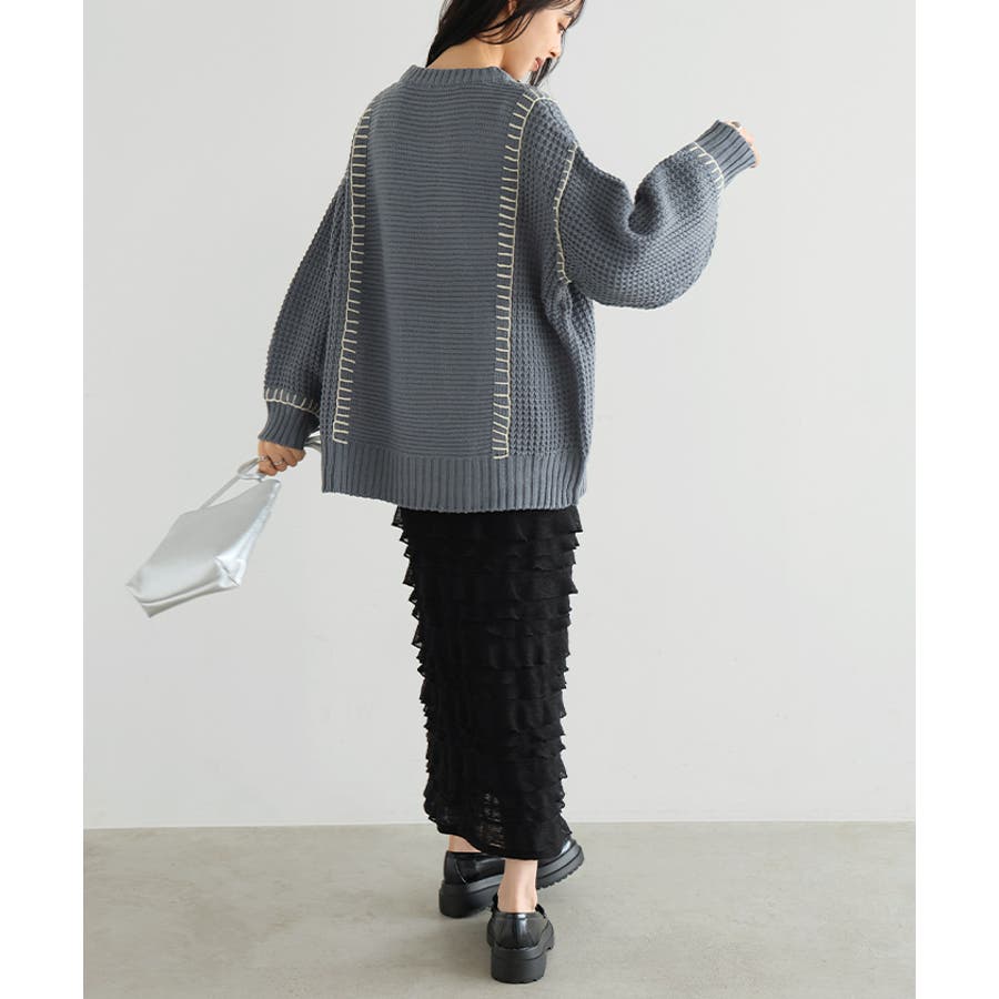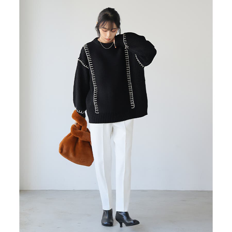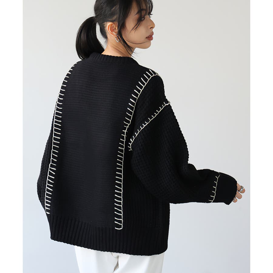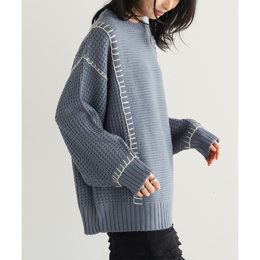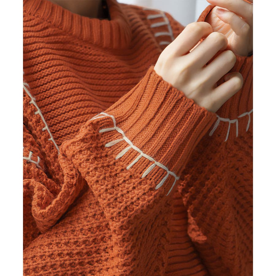 ざっくりと編んだ配色のステッチが目を惹く、レトロなニット。