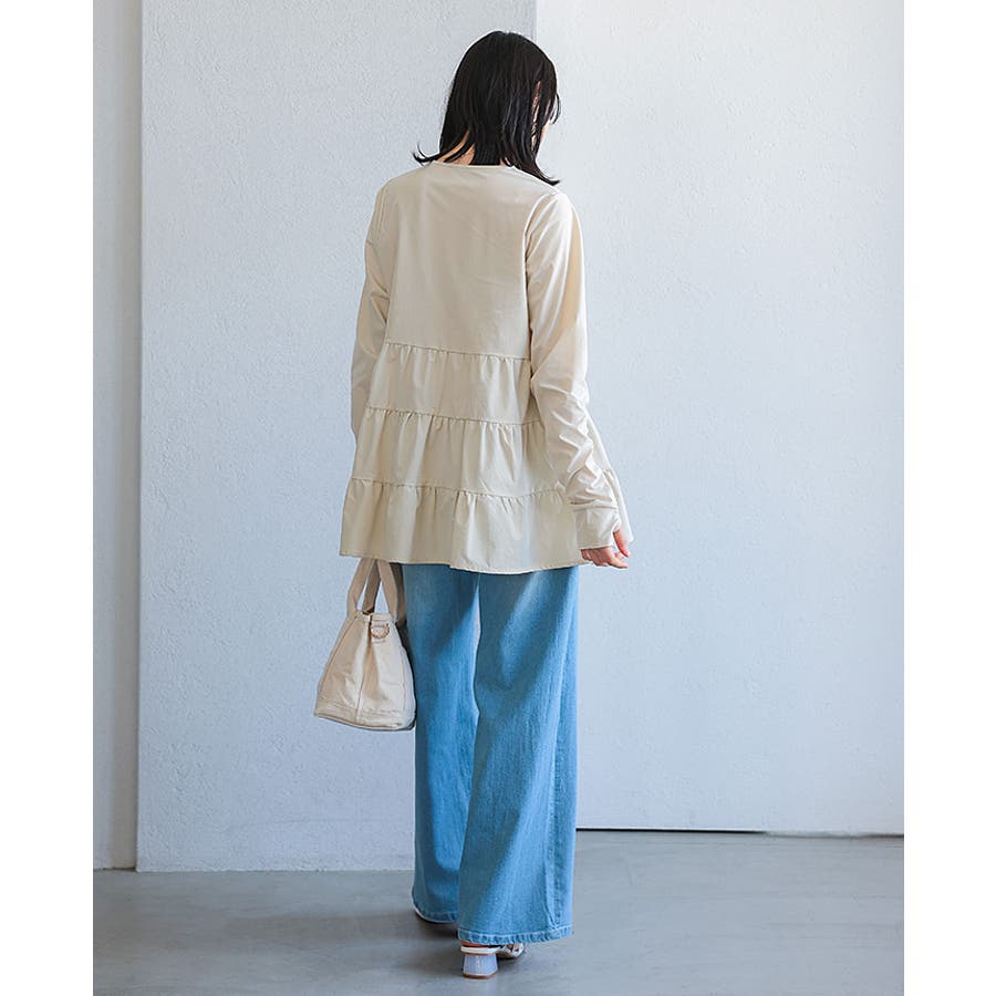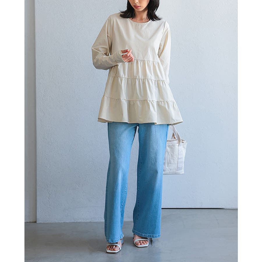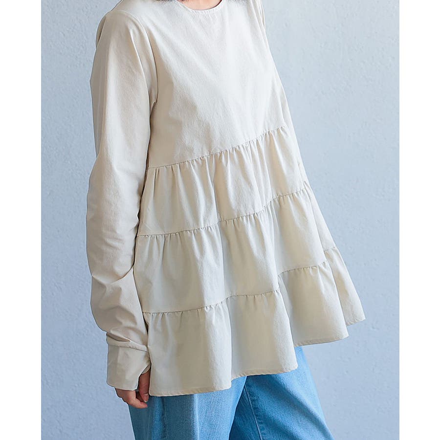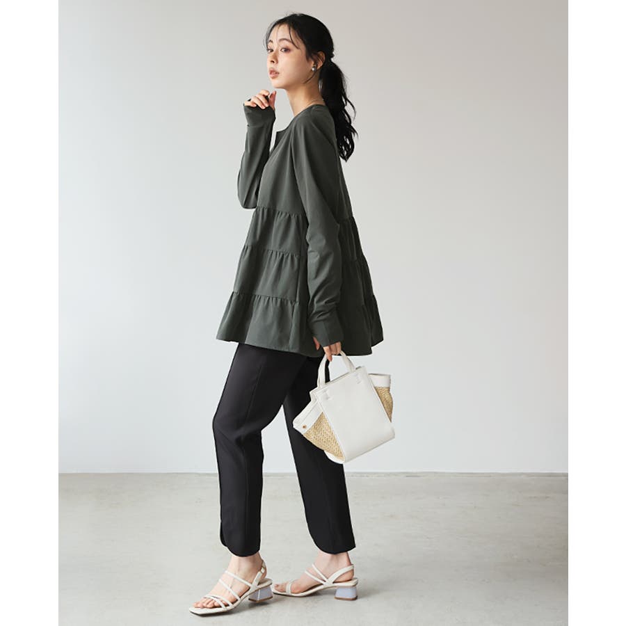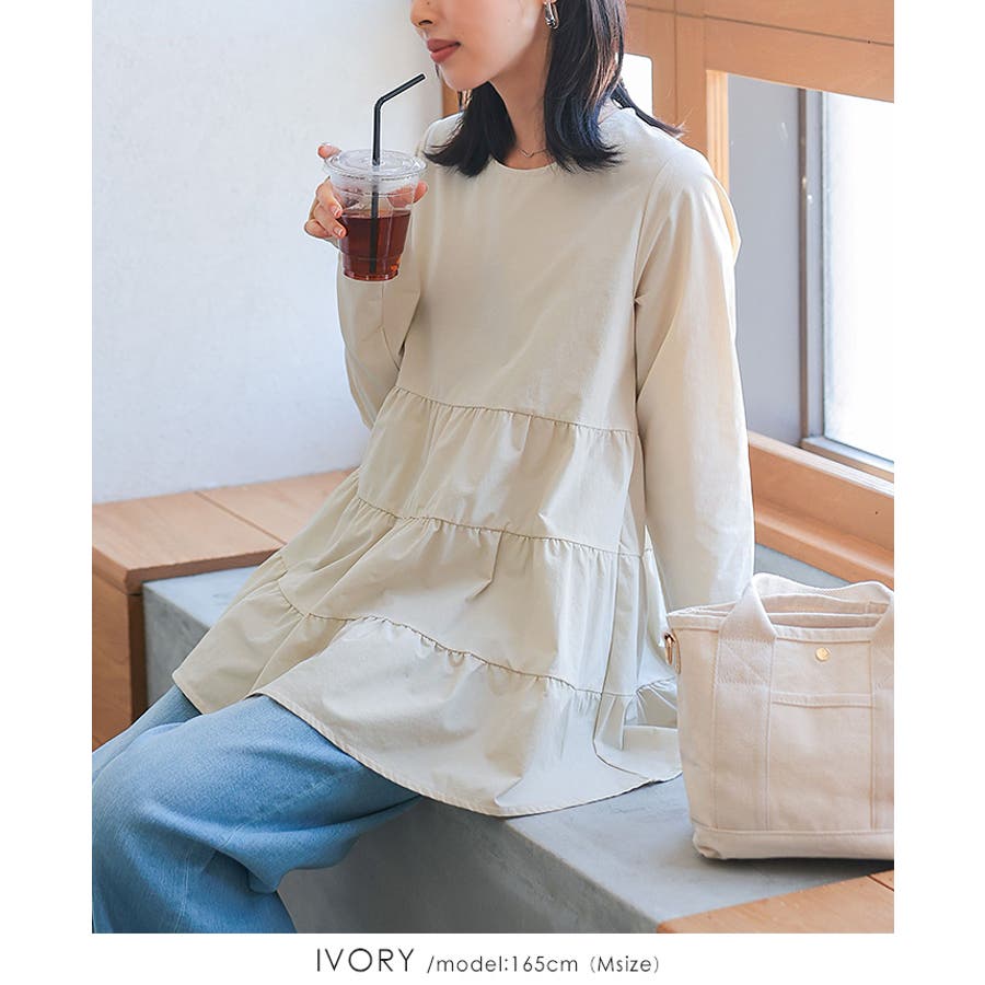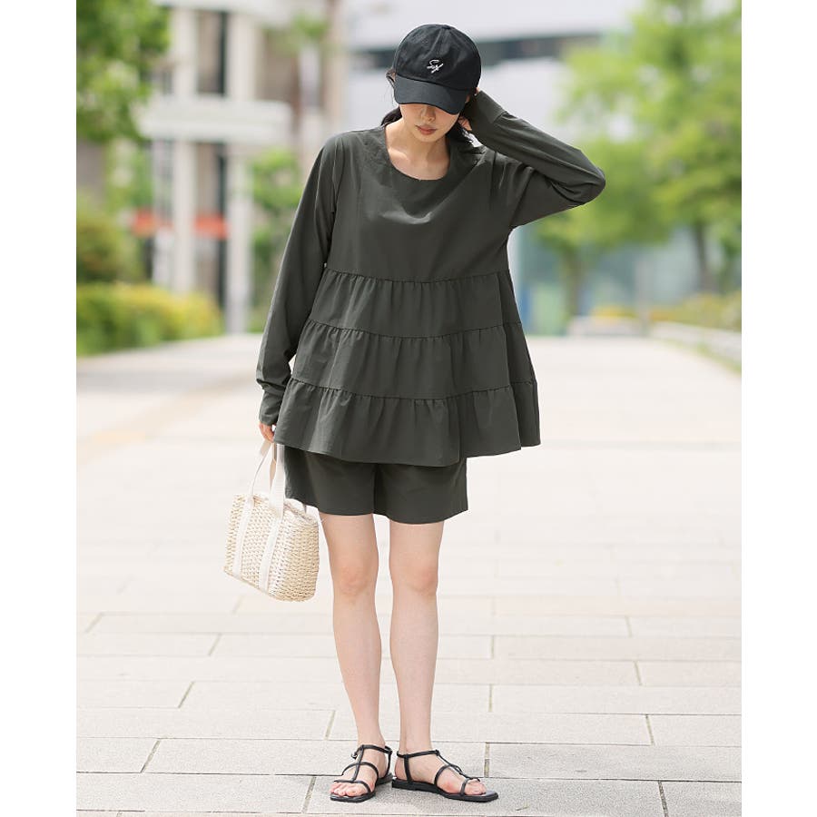 胸下から3段に切り替えた、ティアードデザインのトップス。