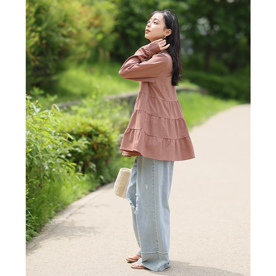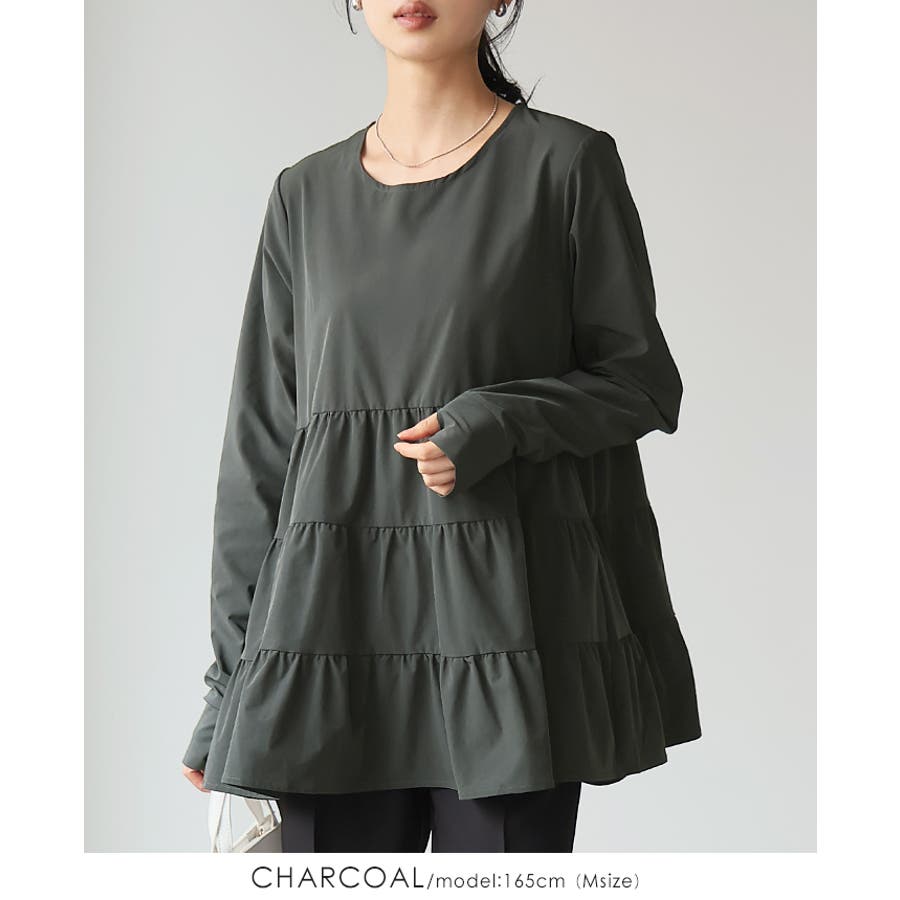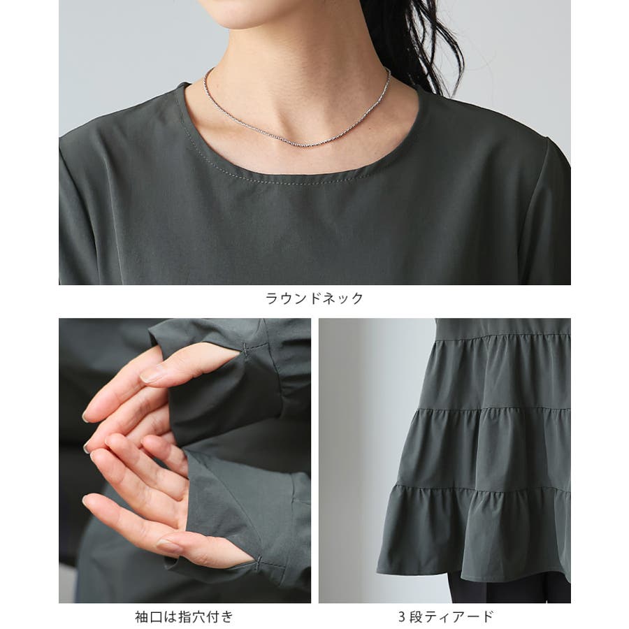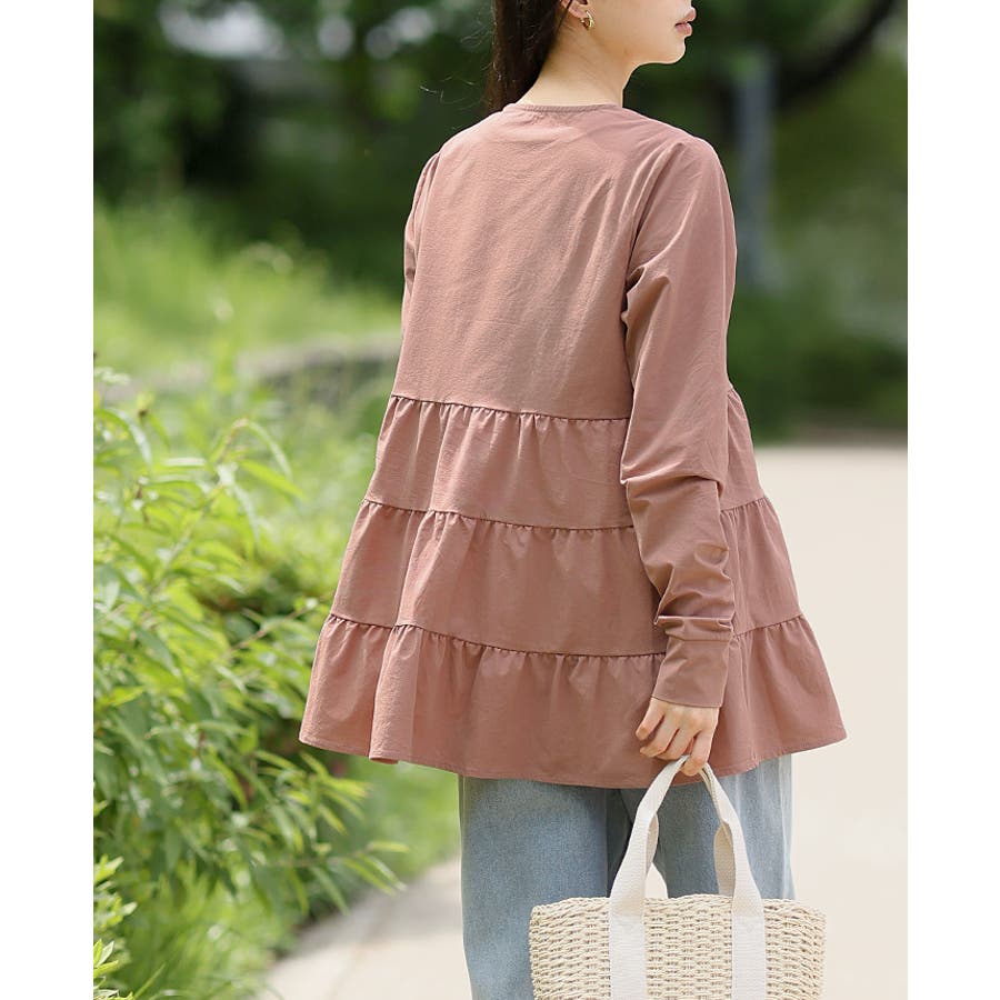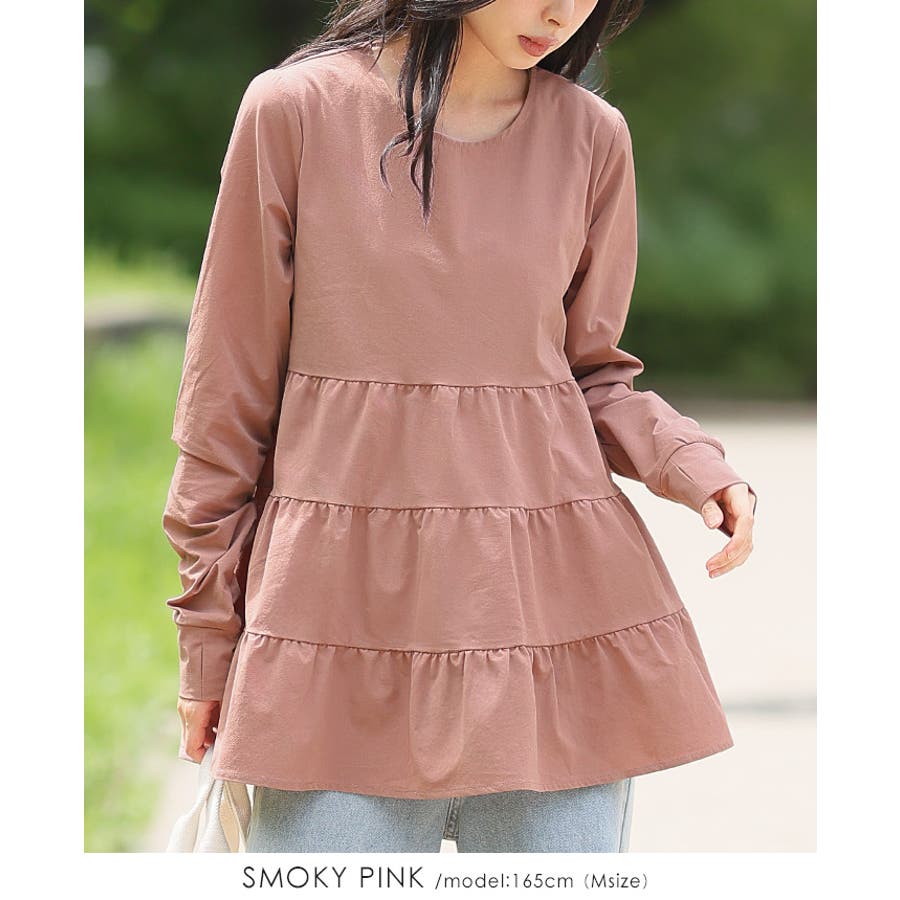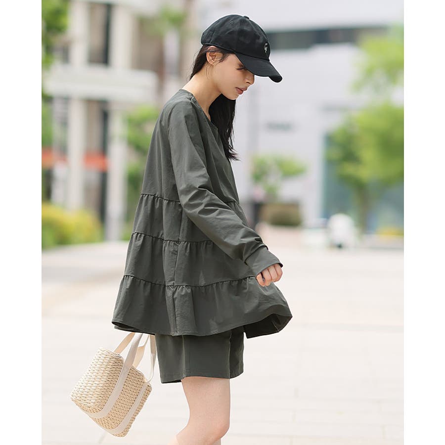 胸下から3段に切り替えた、ティアードデザインのトップス。