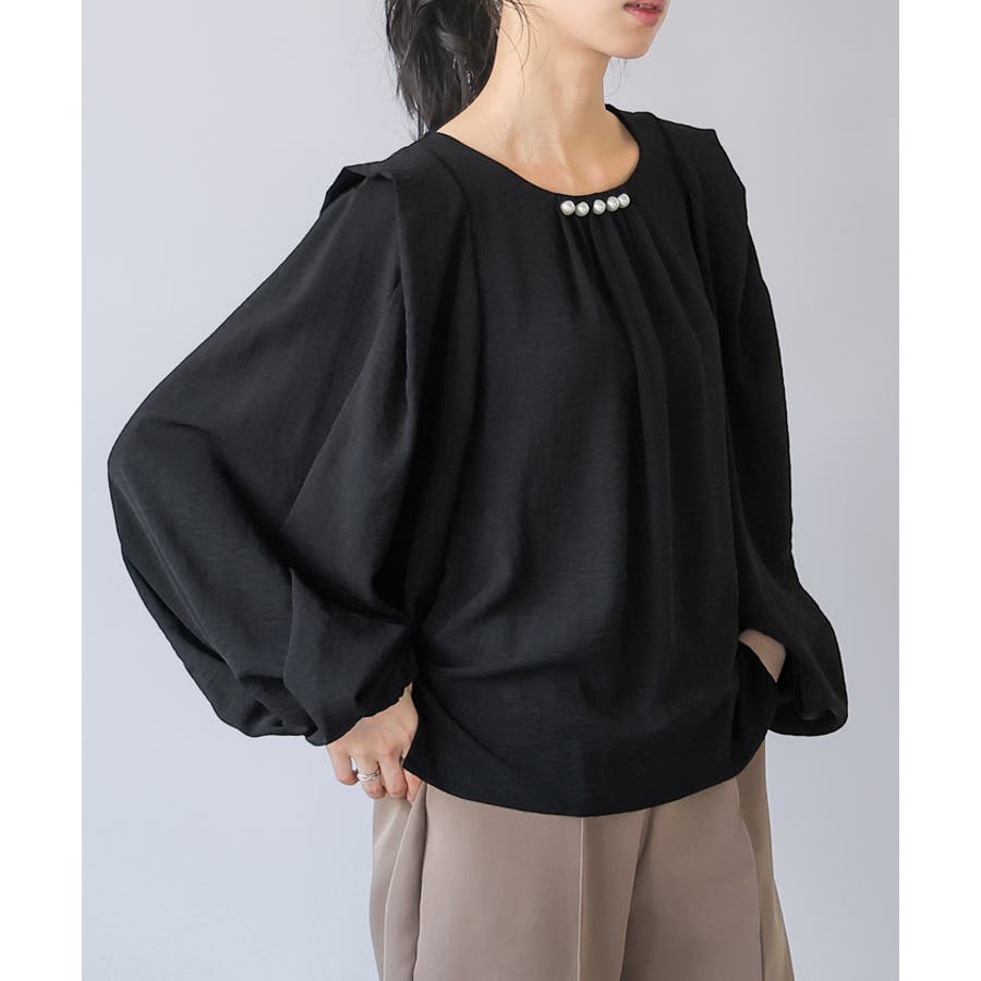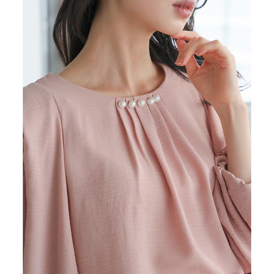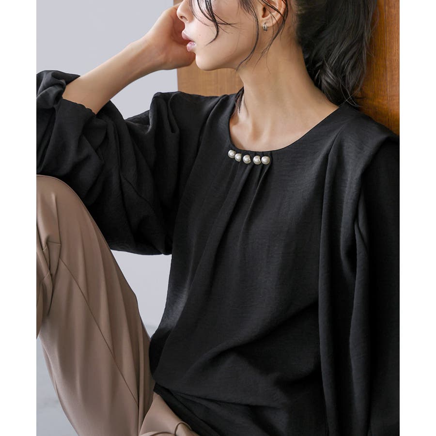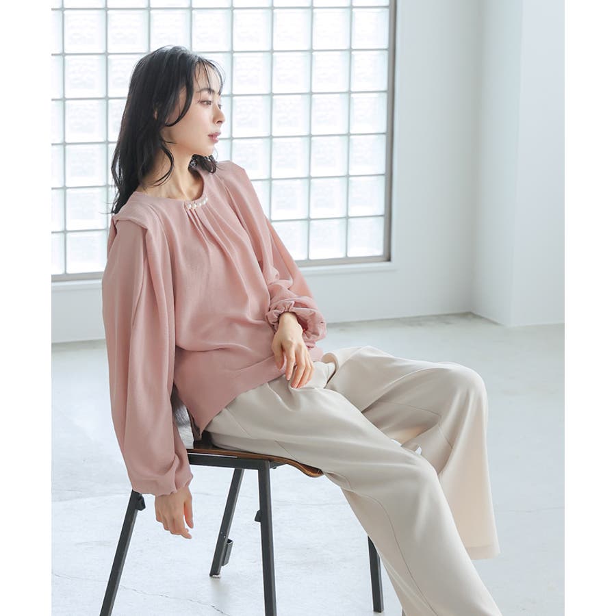 ネックにタックを入れ、その上にパールをあしらったブラウス。