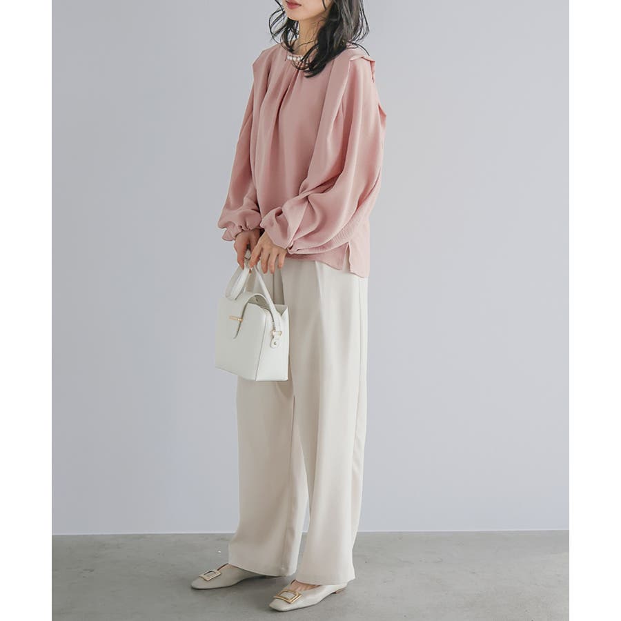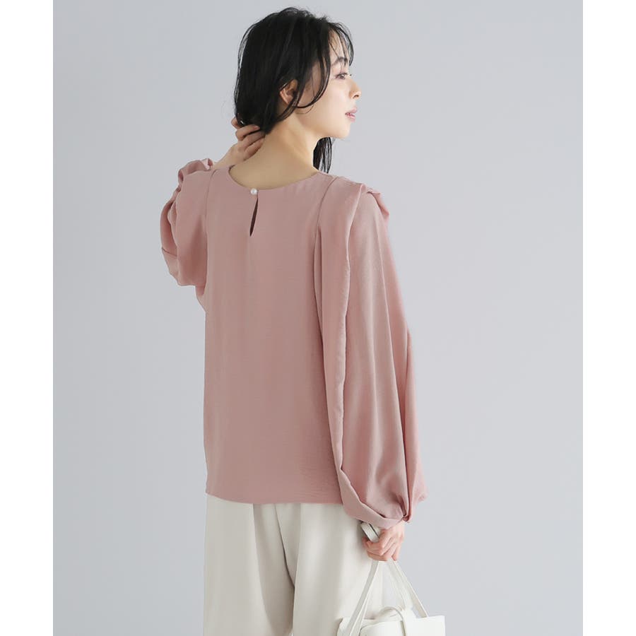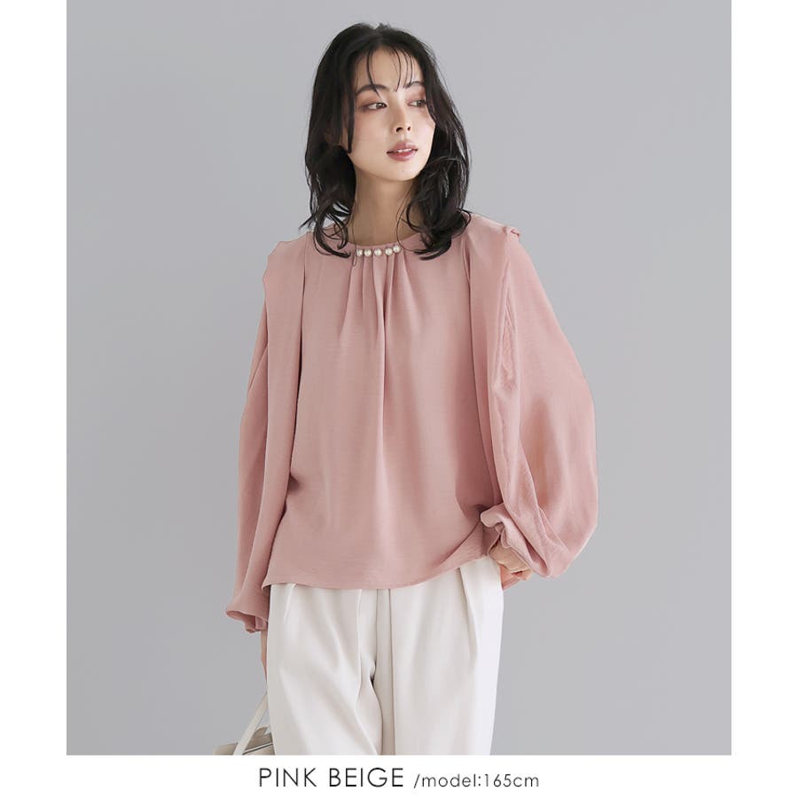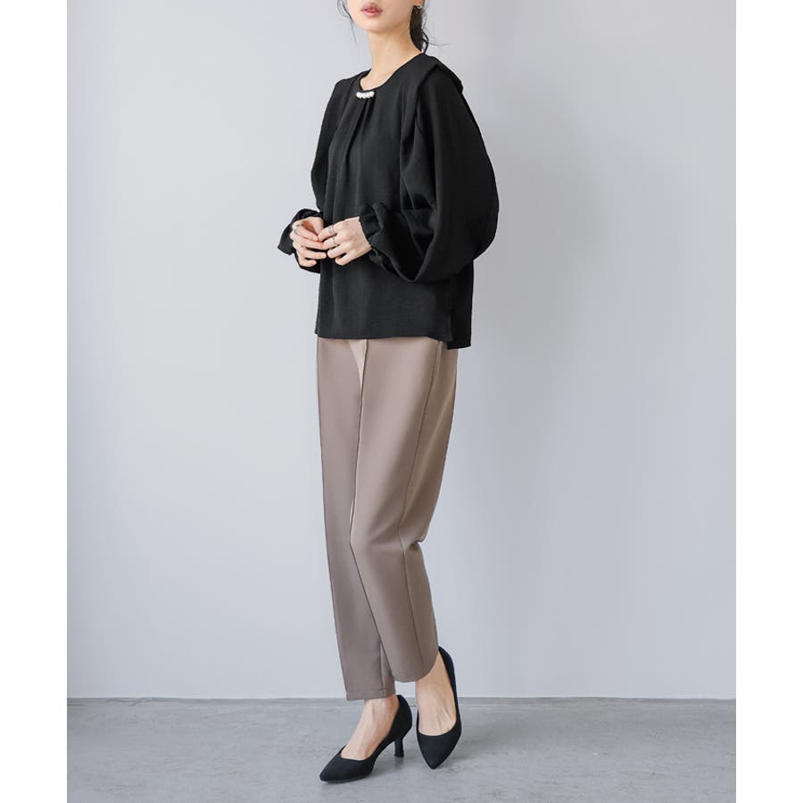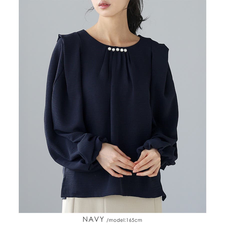 ネックにタックを入れ、その上にパールをあしらったブラウス。