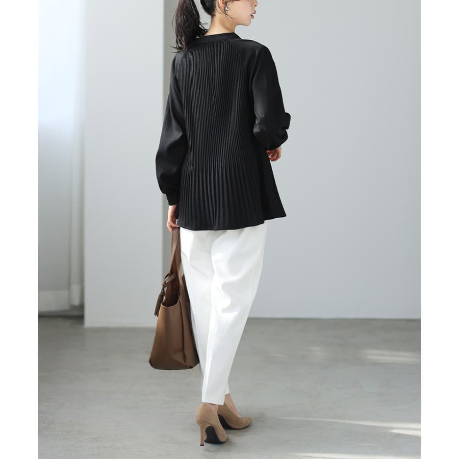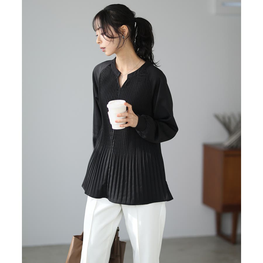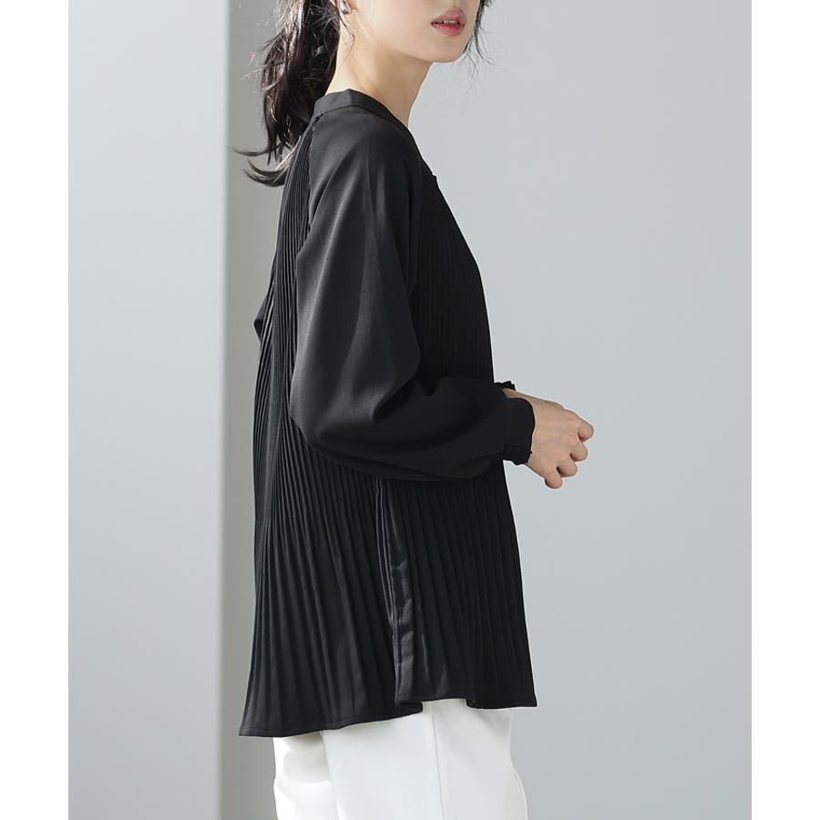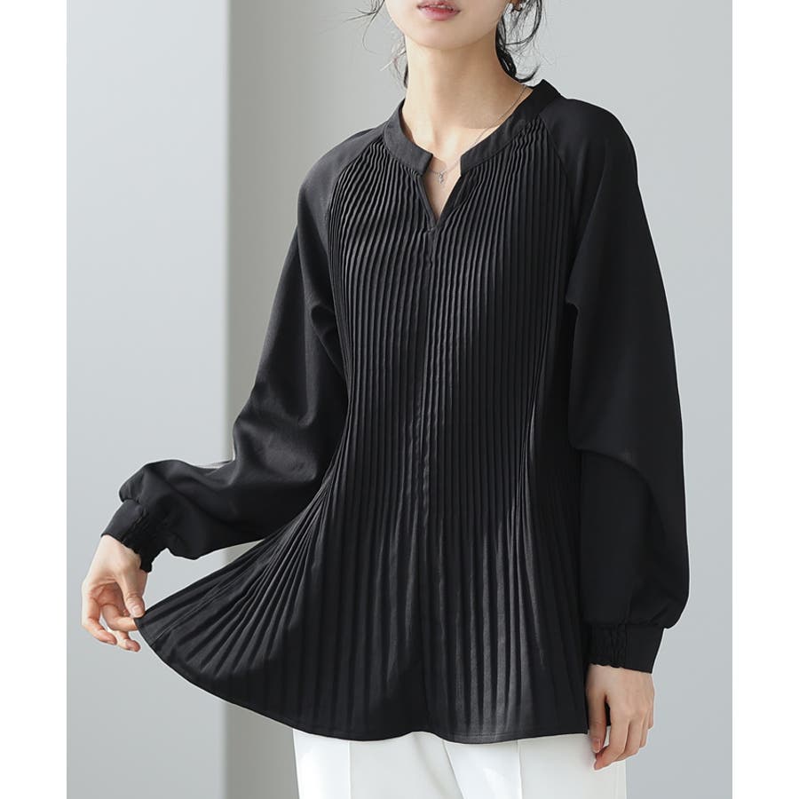 縦ラインを強調し、着やせ効果が期待できるプリーツのブラウス。