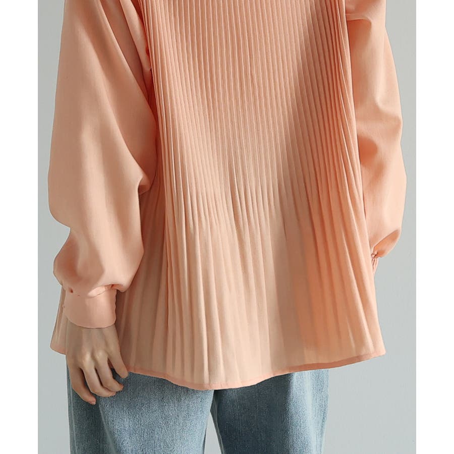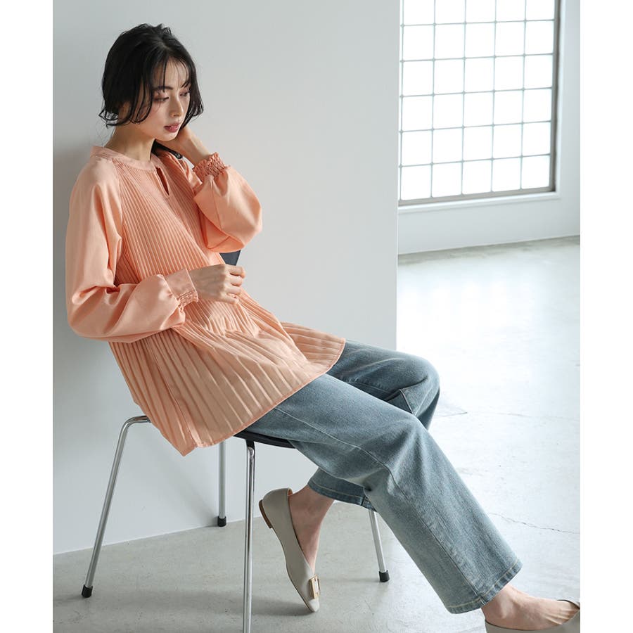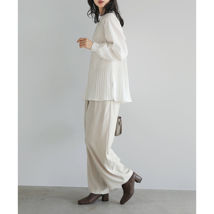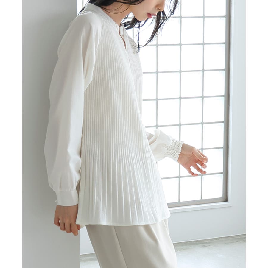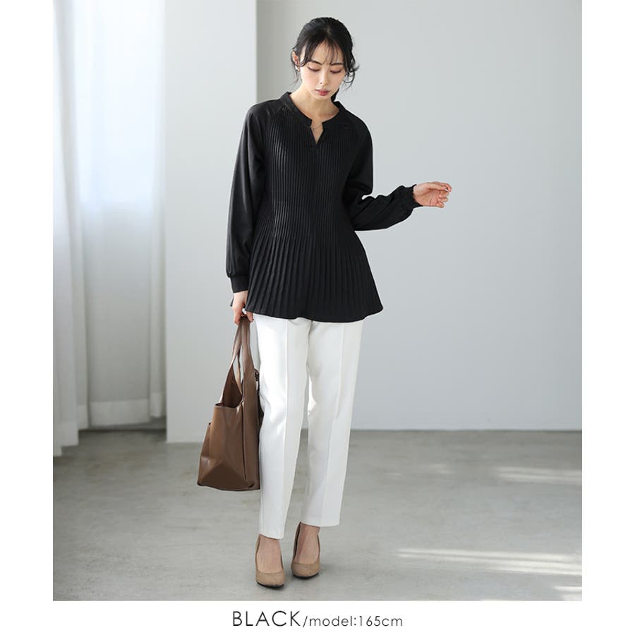 縦ラインを強調し、着やせ効果が期待できるプリーツのブラウス。