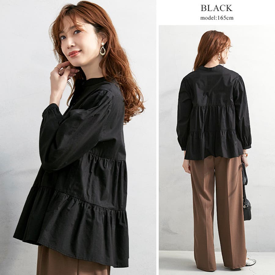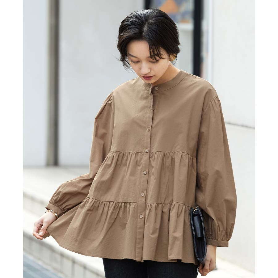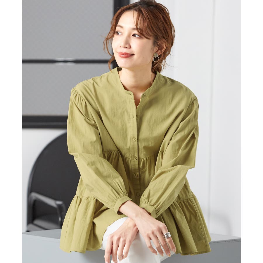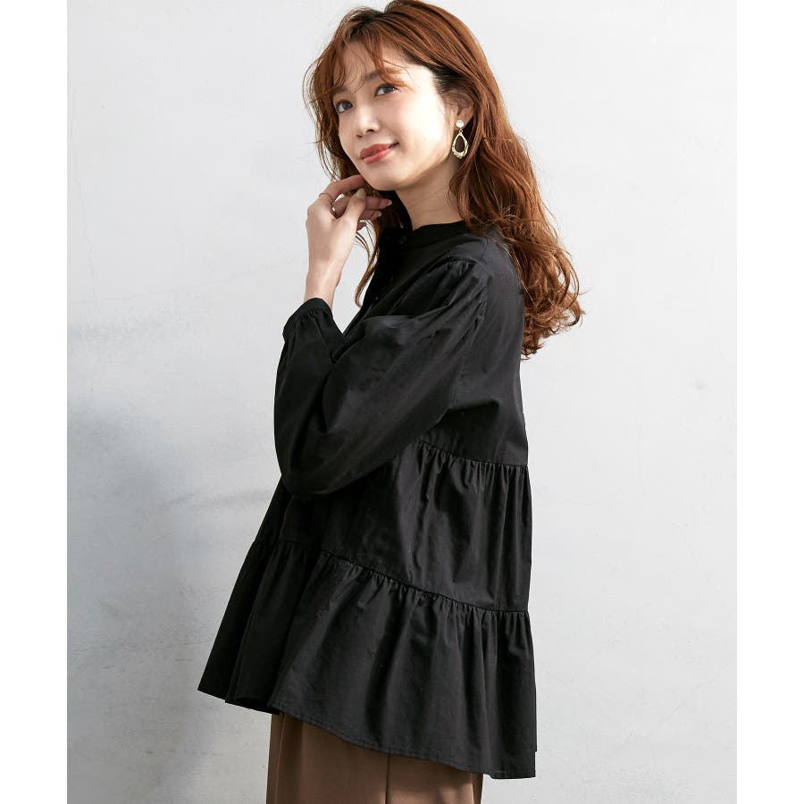『このブラウス1枚で程良く華やぐ。』胸下とウエストに切替えを入れ、ティアードに仕上げたデザイン。ふわっと広がるシルエットで、程良いボリューム感が出ます。首元はバンドカラーでスッキリとした印象。生地は綿100%で、さらっとした肌触り。大人っぽい可愛さを表現してくれるアイテムです。
