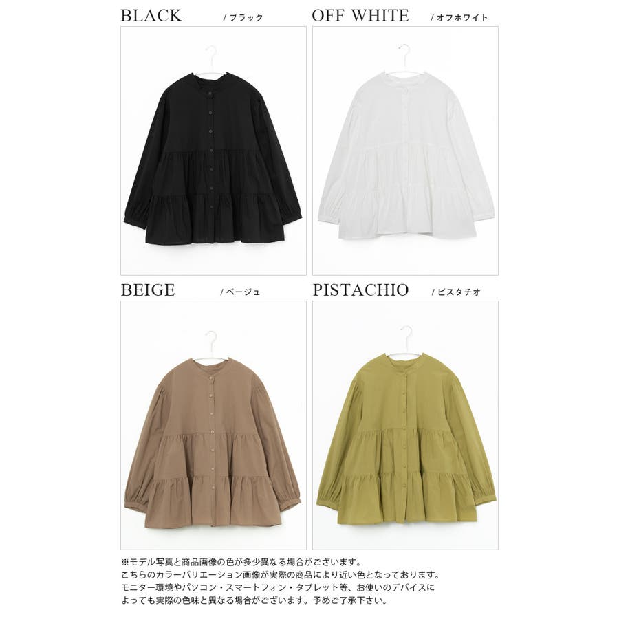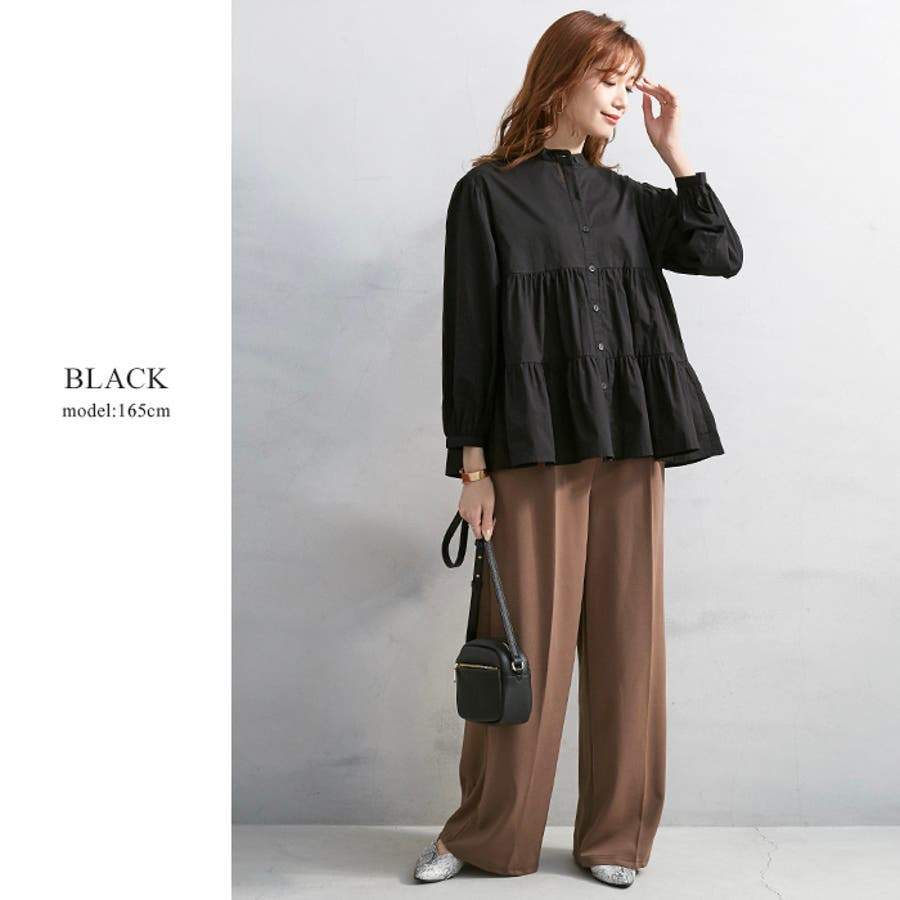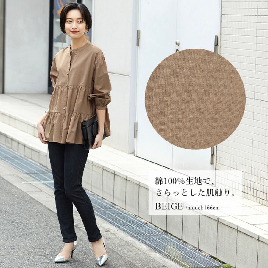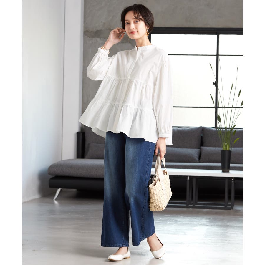 『このブラウス1枚で程良く華やぐ。』胸下とウエストに切替えを入れ、ティアードに仕上げたデザイン。ふわっと広がるシルエットで、程良いボリューム感が出ます。首元はバンドカラーでスッキリとした印象。生地は綿100%で、さらっとした肌触り。大人っぽい可愛さを表現してくれるアイテムです。