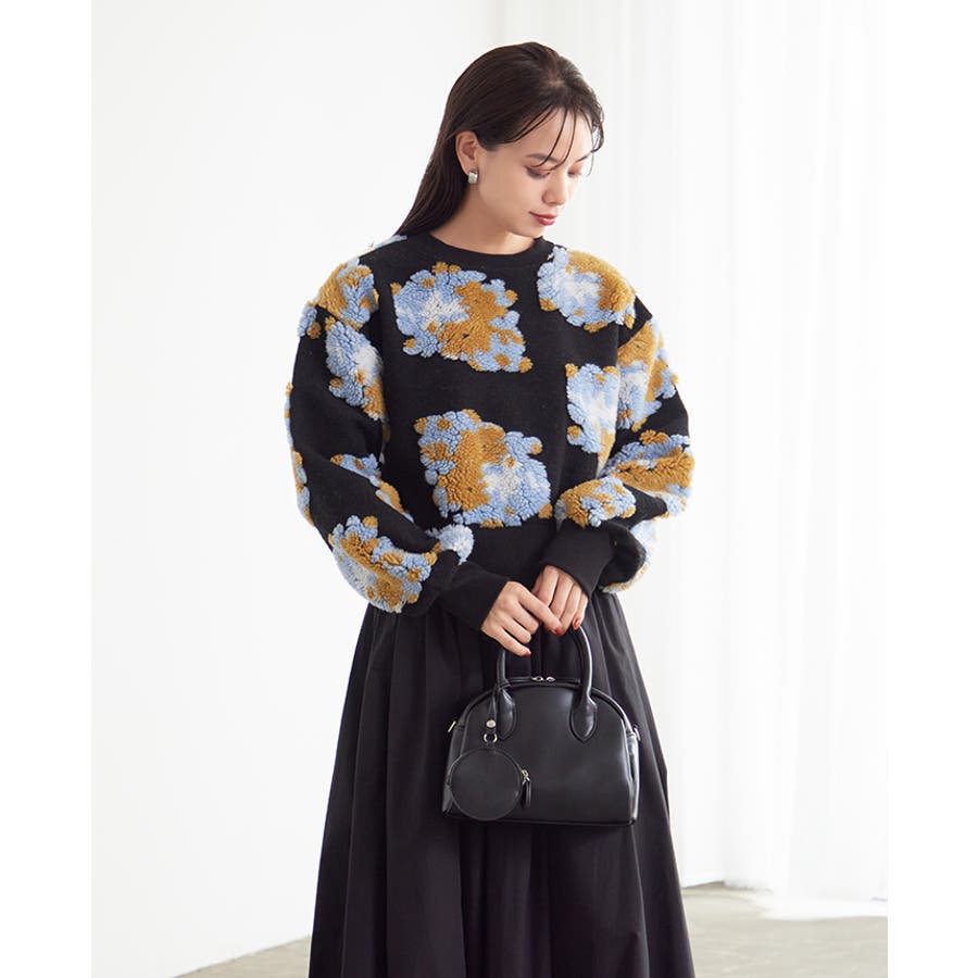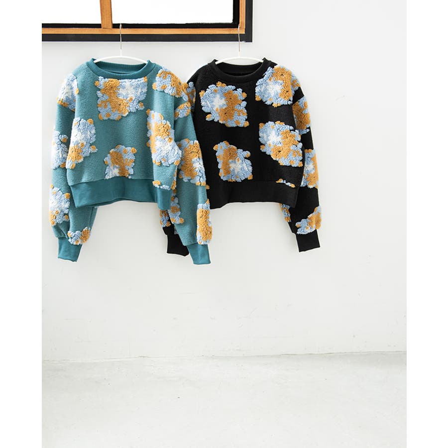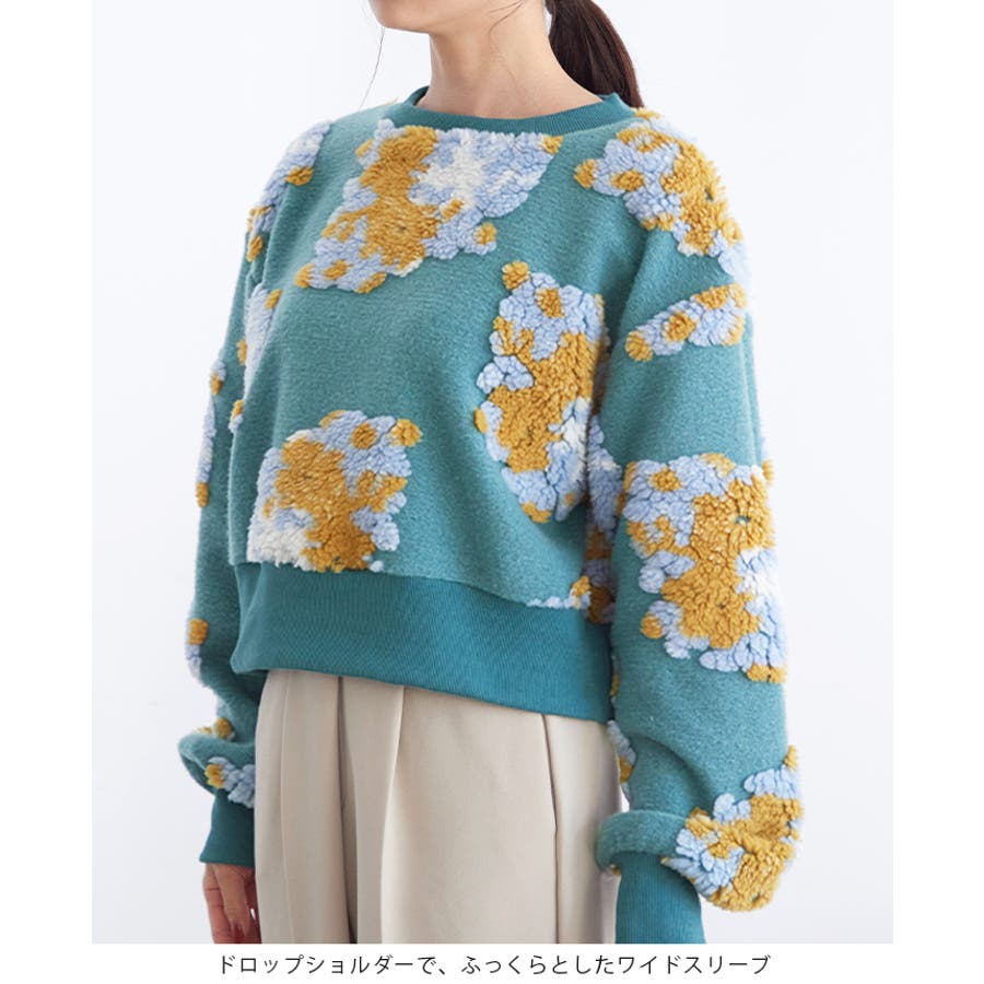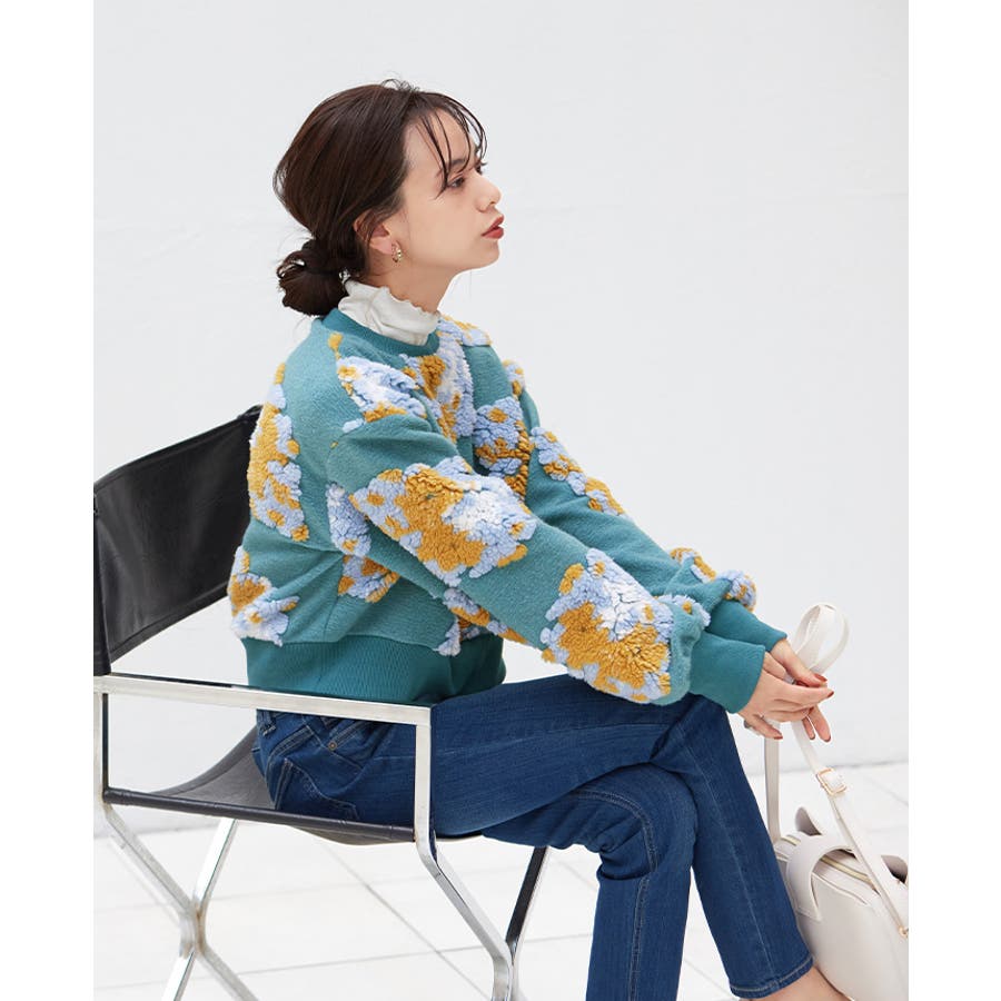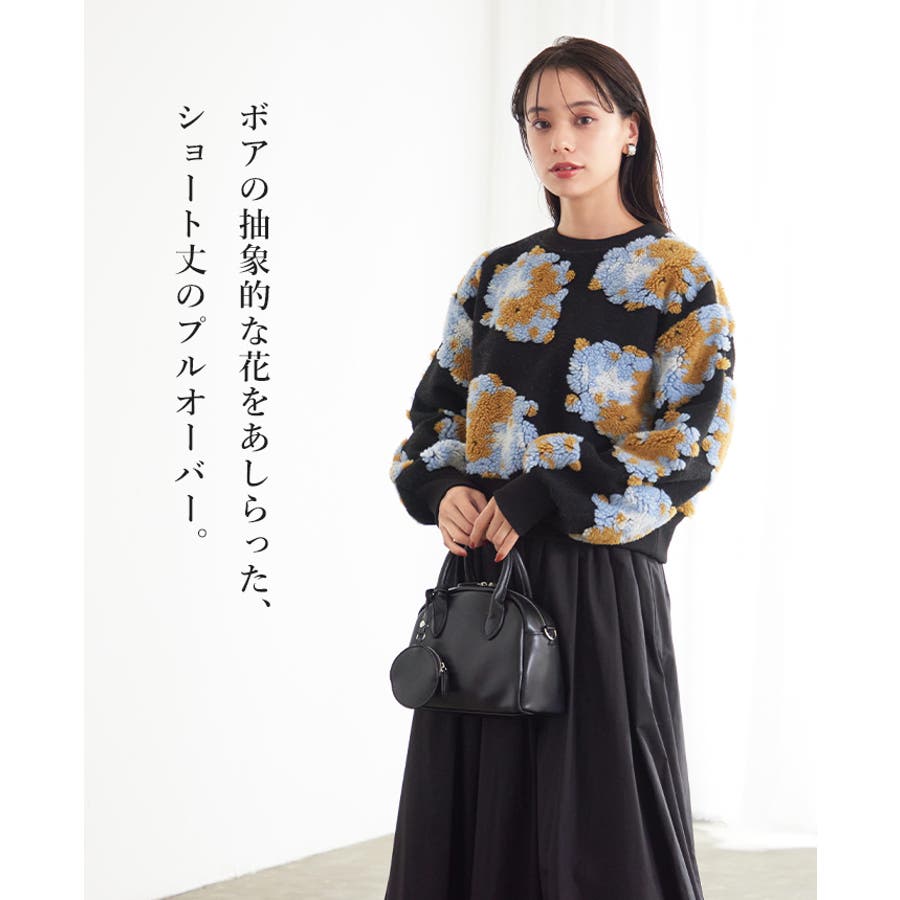 『ぷっくり大きな花が咲きました。』花の部分をふわふわのボアで表現した、見た目に楽しいトップス。通常の編み柄と違い、立体的なデザインがお洒落心をくすぐります。ゆったりとしたシルエットで、ストレスフリーな着心地。旬のショート丈は、スタイルアップにおすすめ。ワンランク上のコーデに導いてくれるアイテムです。